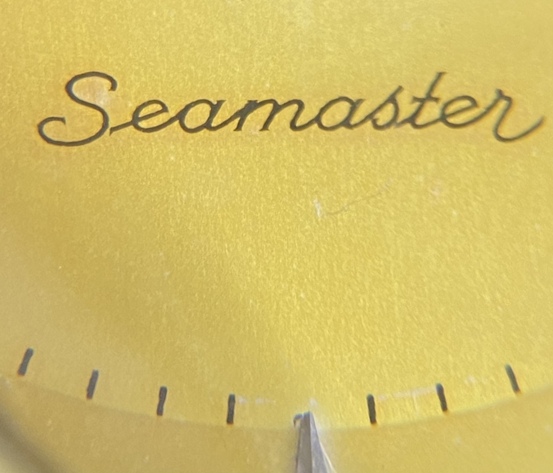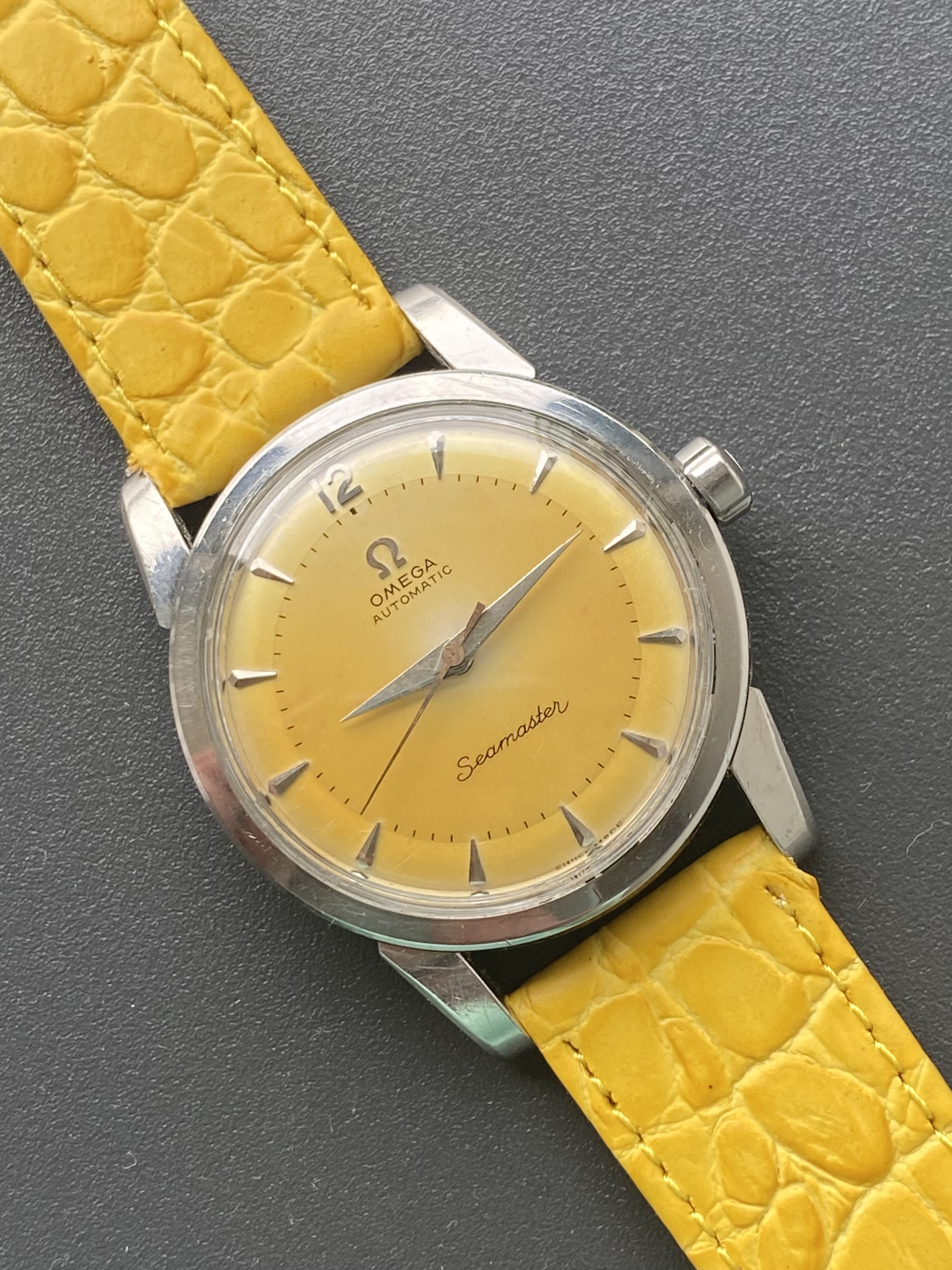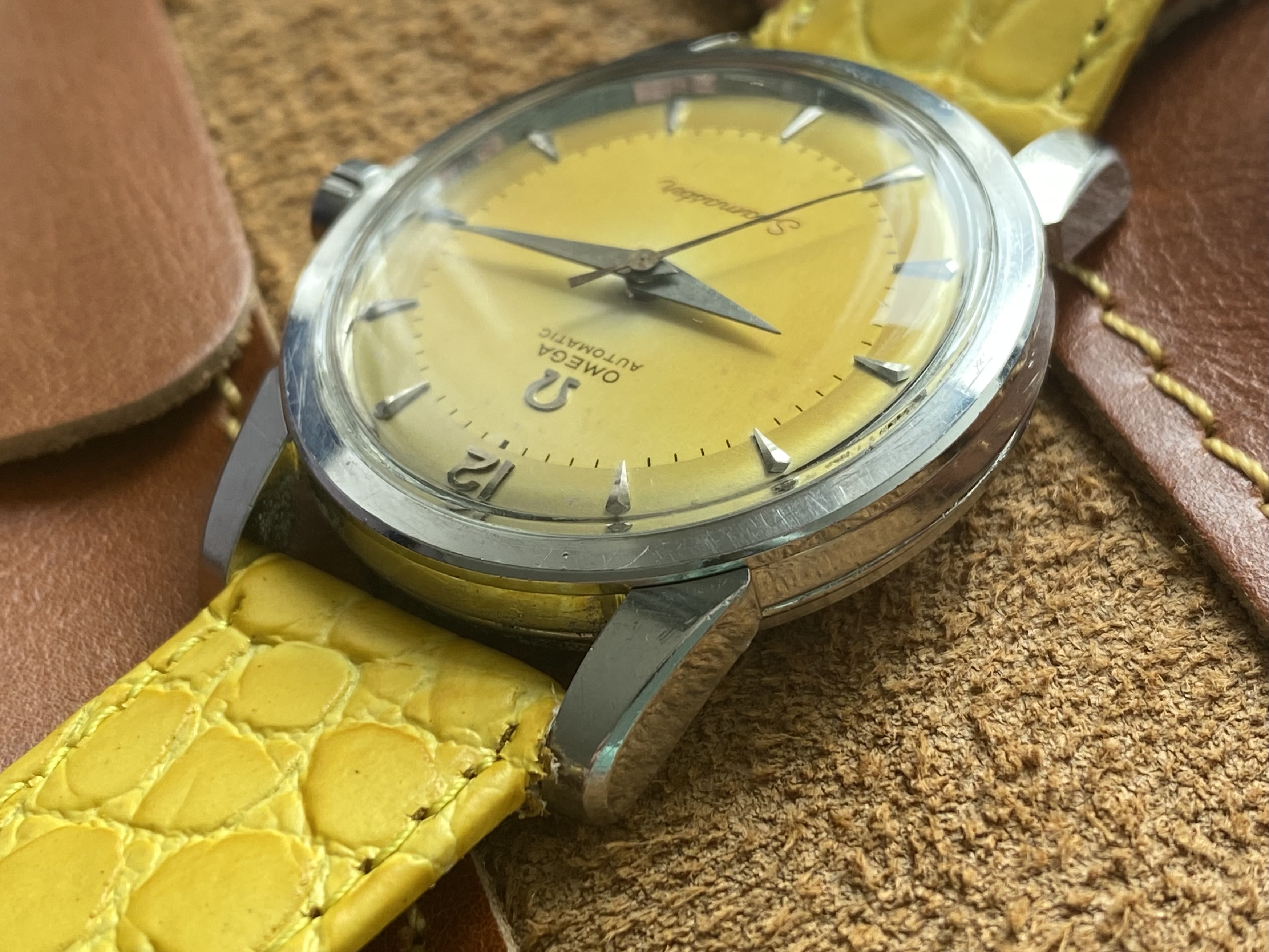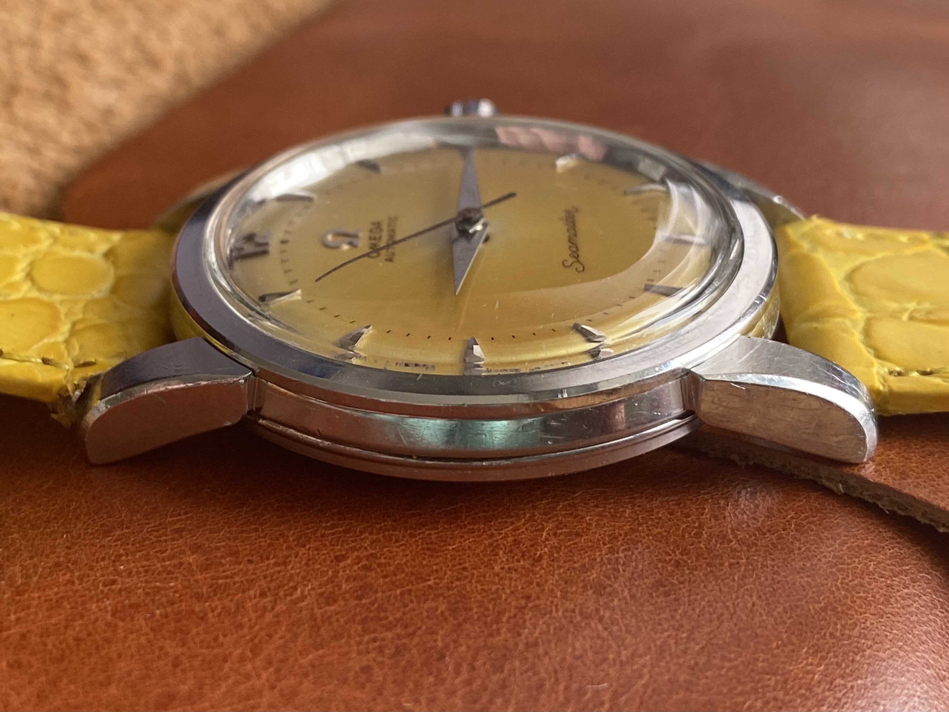 Dial: a deep yellow, with a brighter spot towards the middle which hints to the factory white. No lume, SS furniture, applied omega logo.