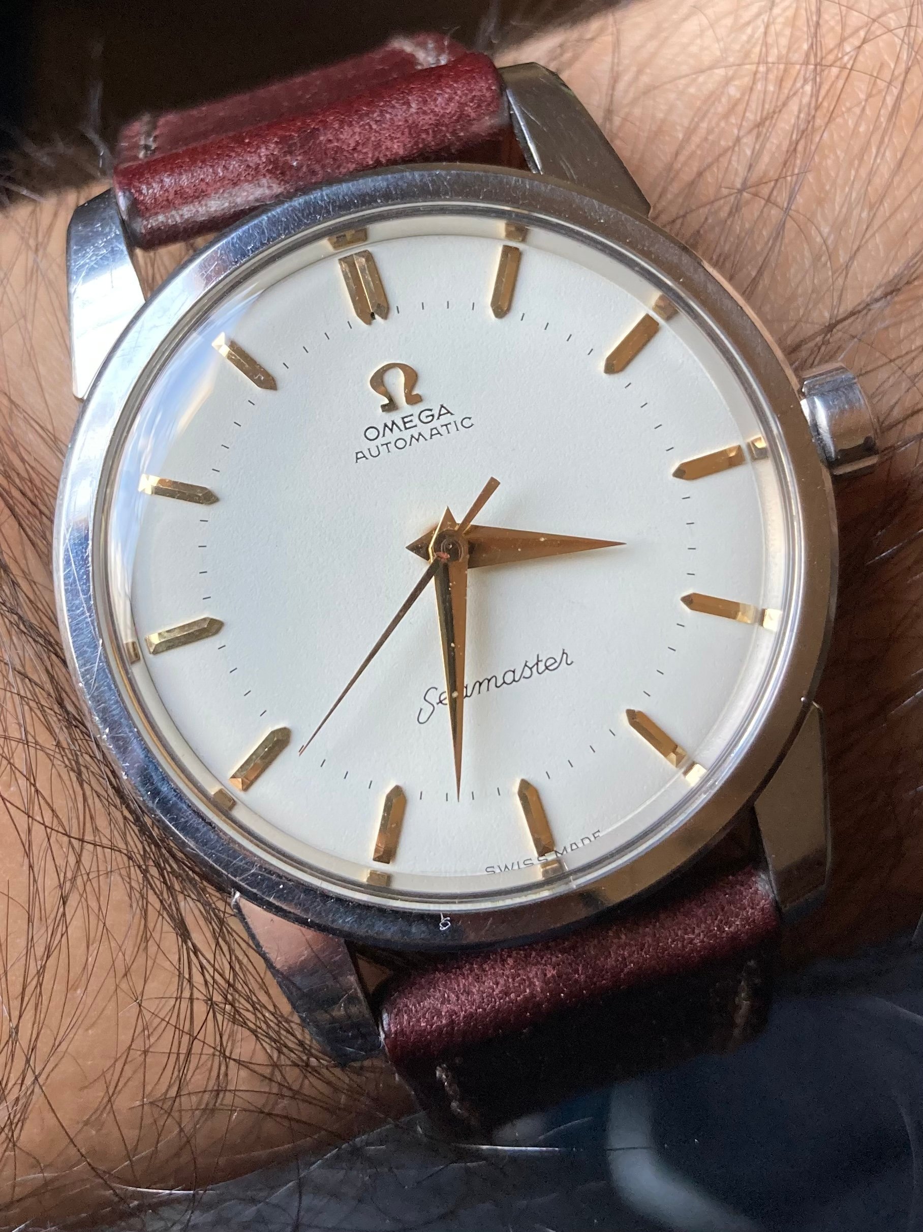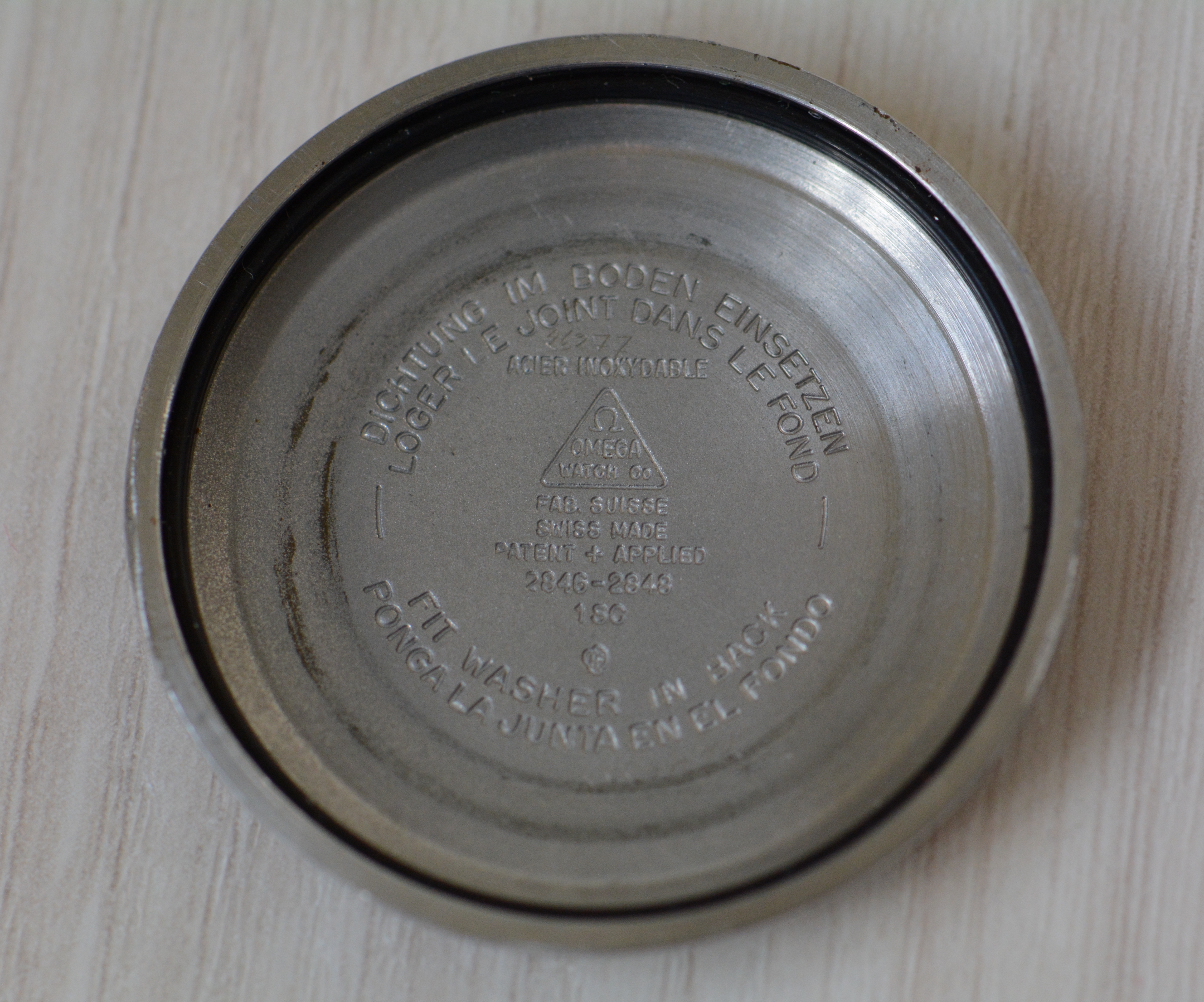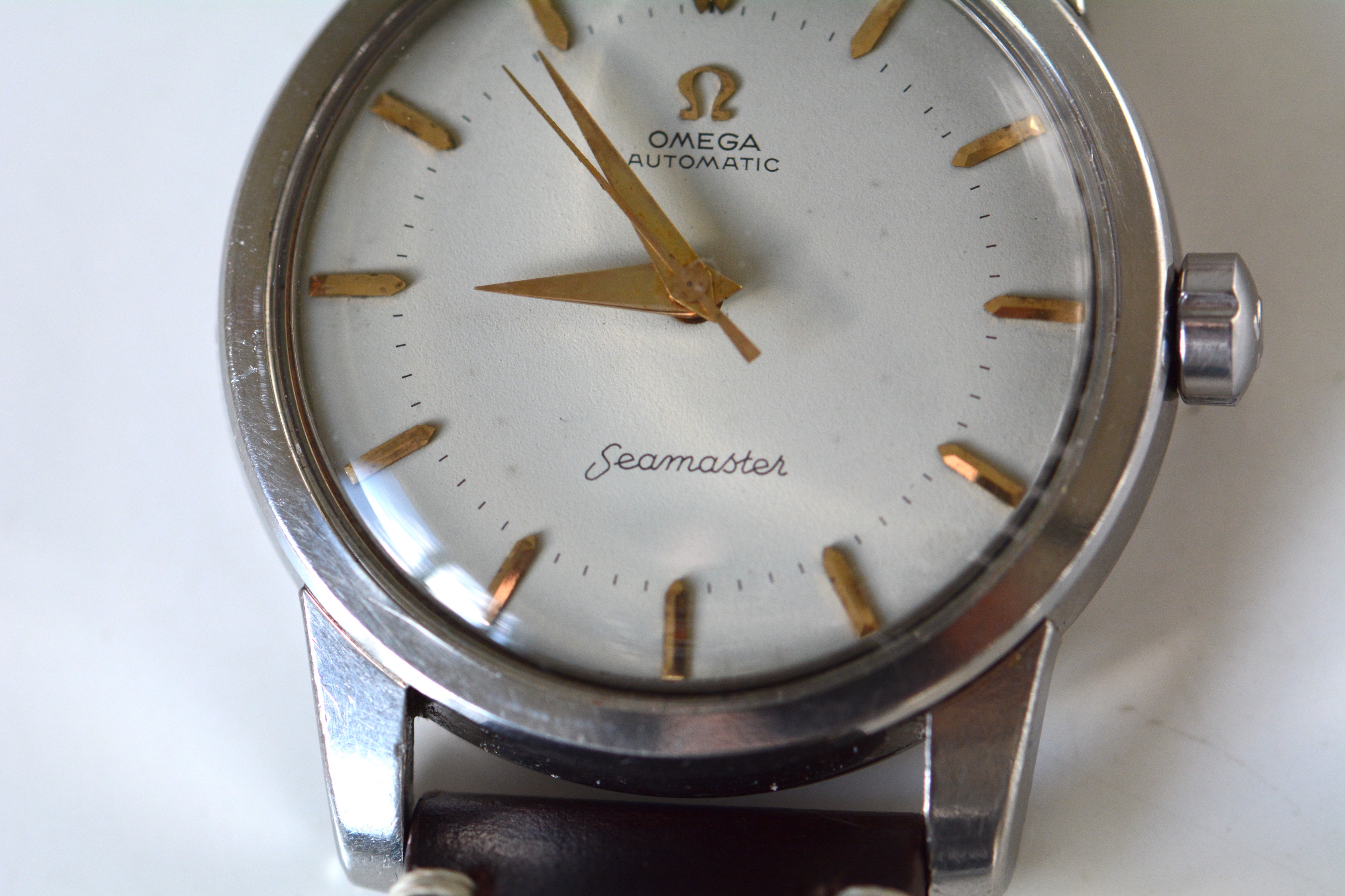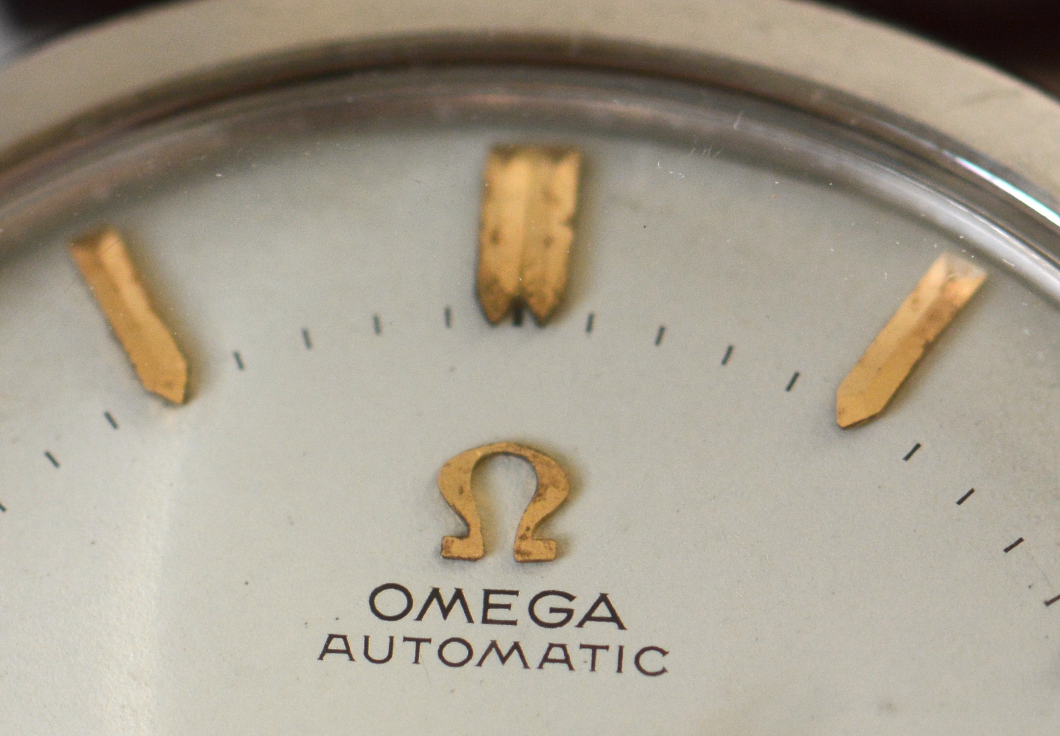 Crystal: Generic, with some scratches. Some "genius" tried to edge the Omega logo onto the glass visible on my wrist shot as the sunlight casts a shade onto the dial.