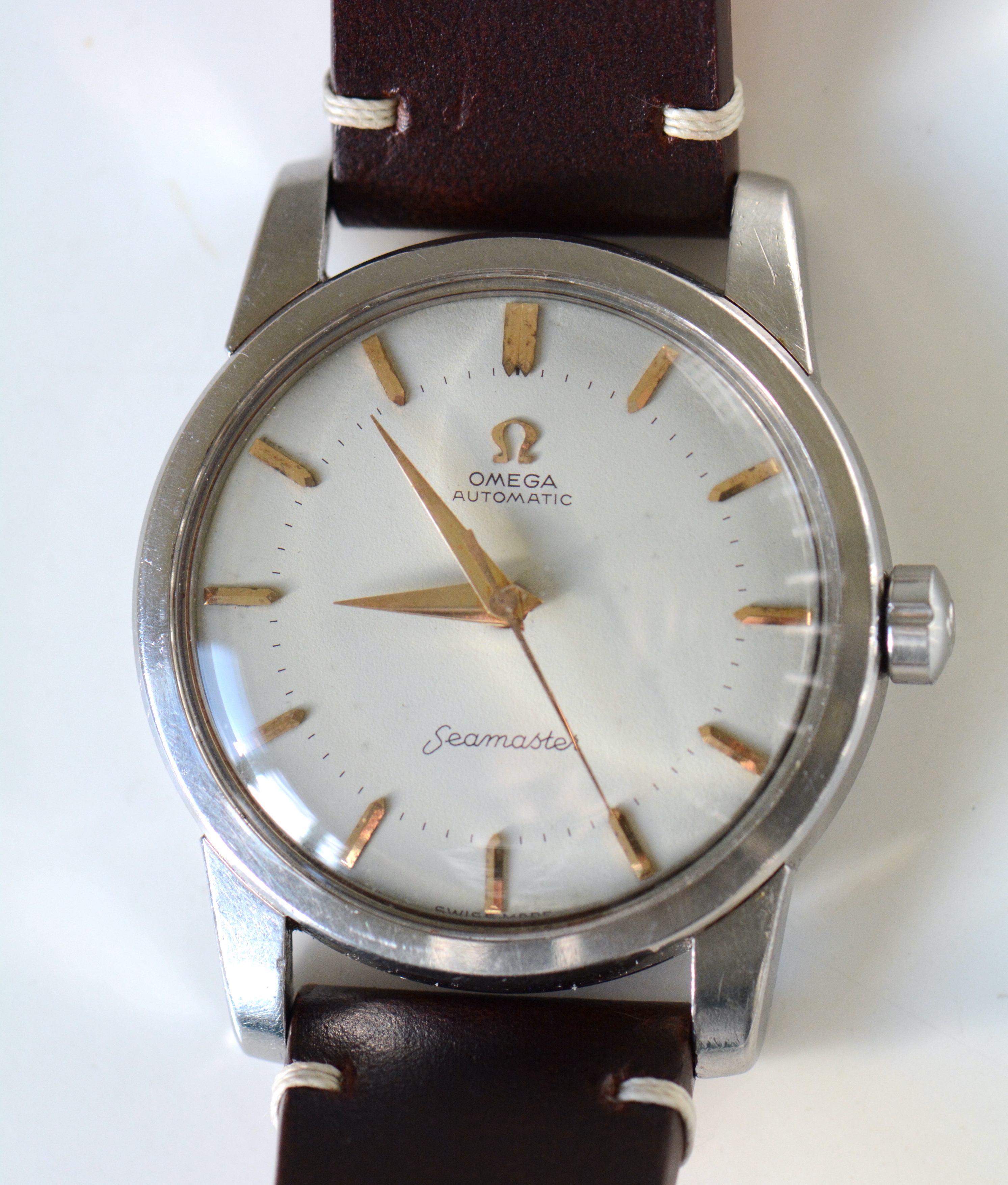 Crown: Signed clover leaf crown, but a modern production, not the period correct variant with the flat feet Omega logo.