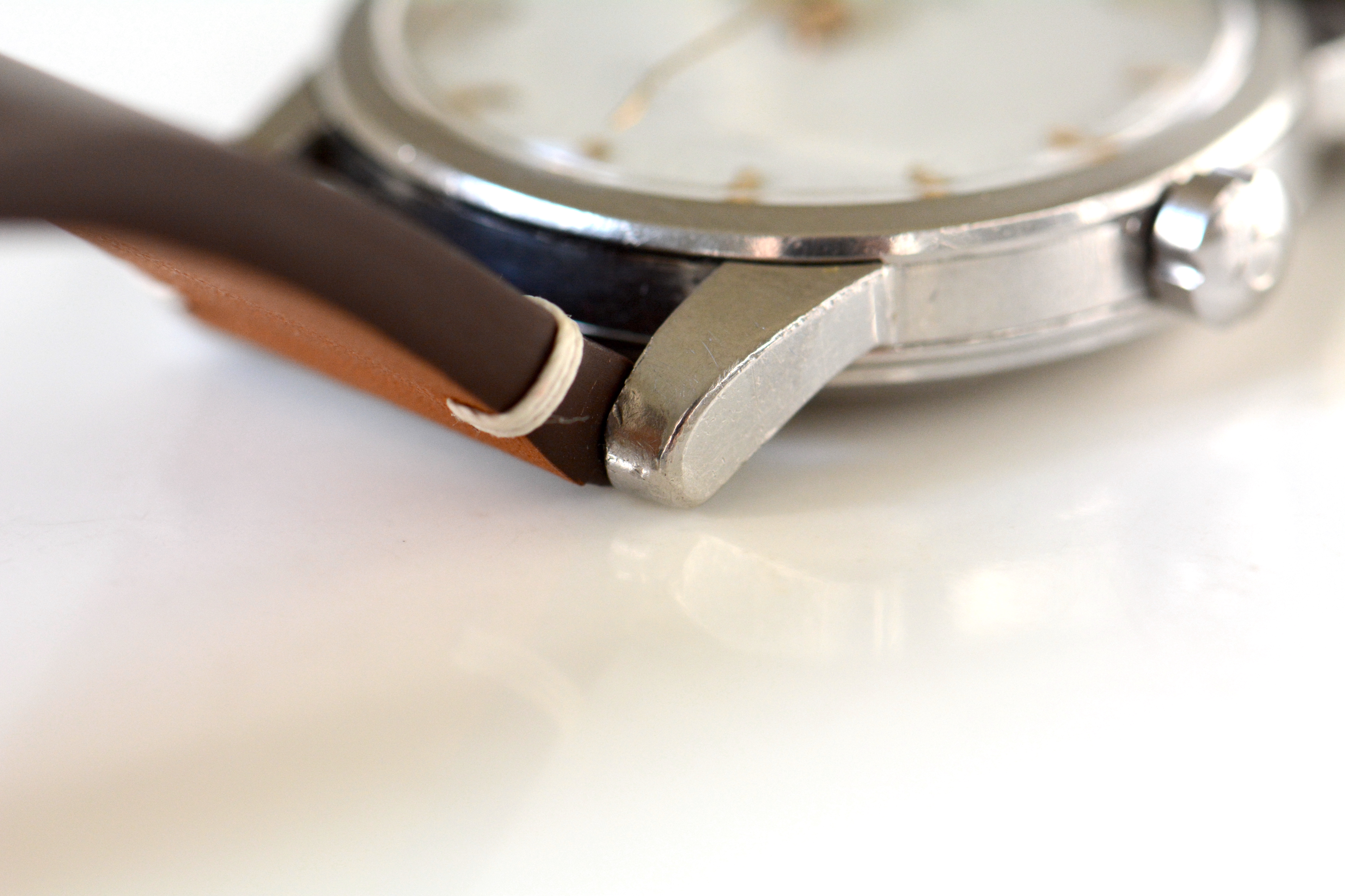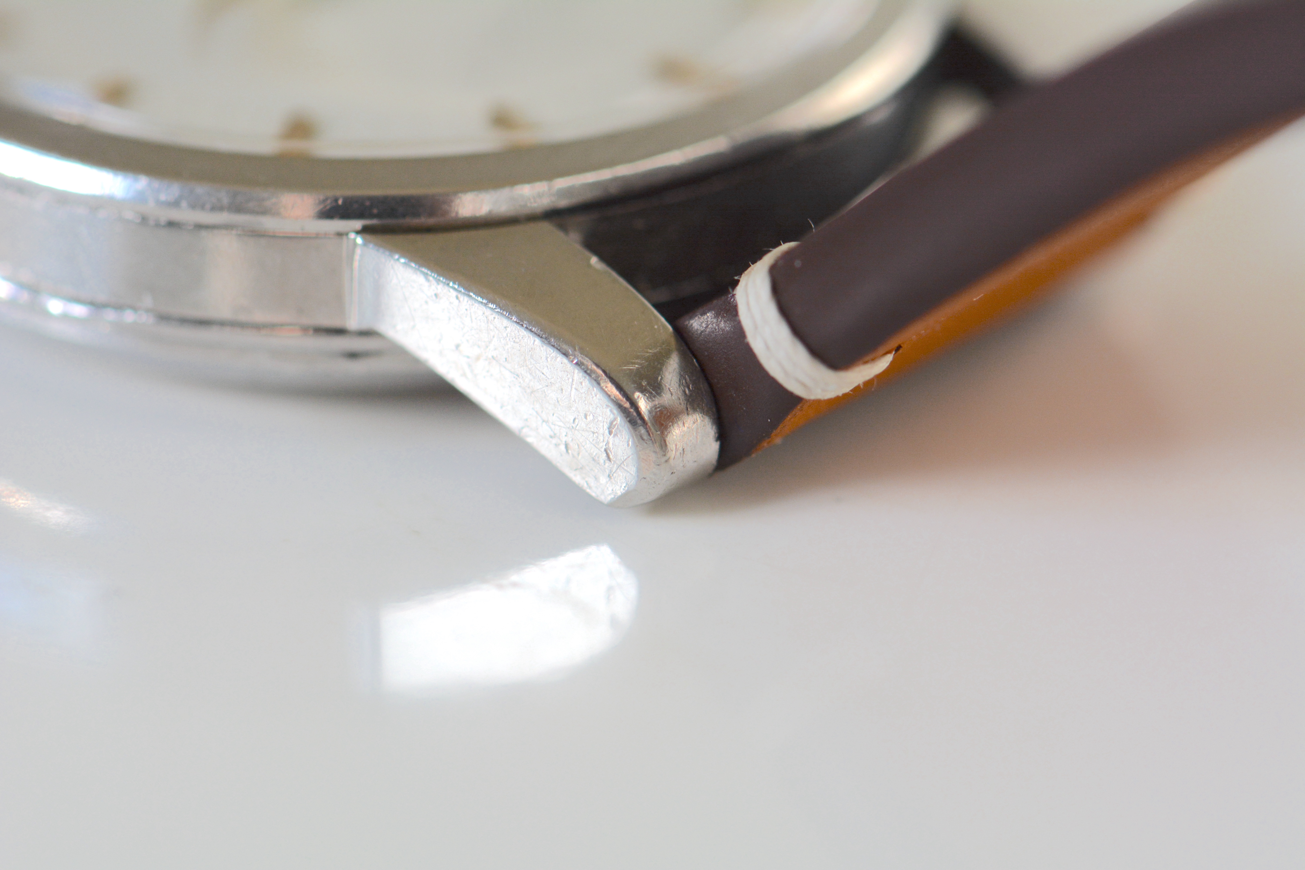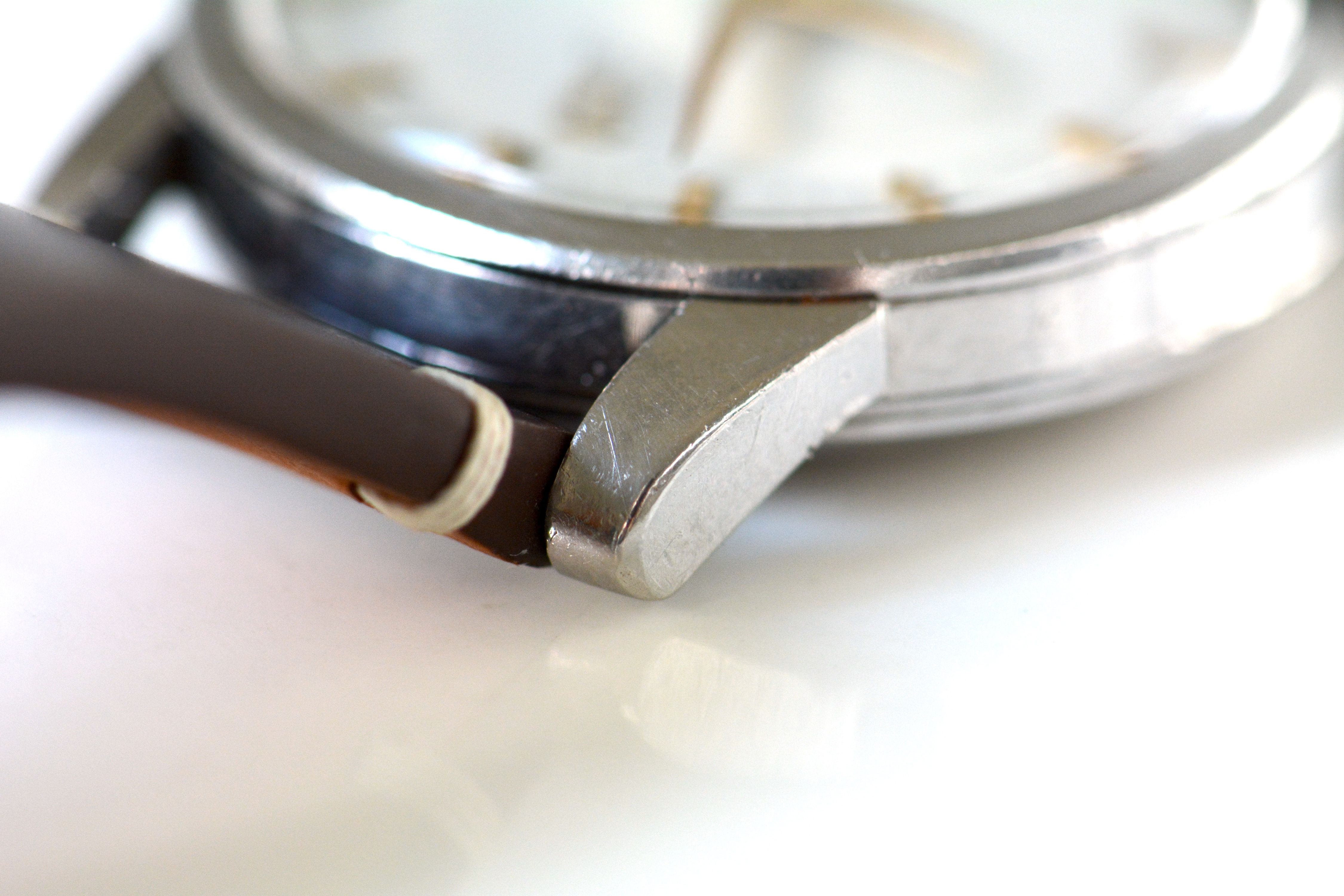 Case: Stainless steel. It's an honest case with signs of age such as dings and scratches here and there. It’s definitely not sharp as a knife, but neither is it over-polished. The original facets on the lugs are still clearly visible and hence I think it’s a presentable piece. The macro shots reveal a dent on the inner edge of the lower right lug, but it's hardly visible with naked eye, especially when a strap is put on, which is normally the case 😀
