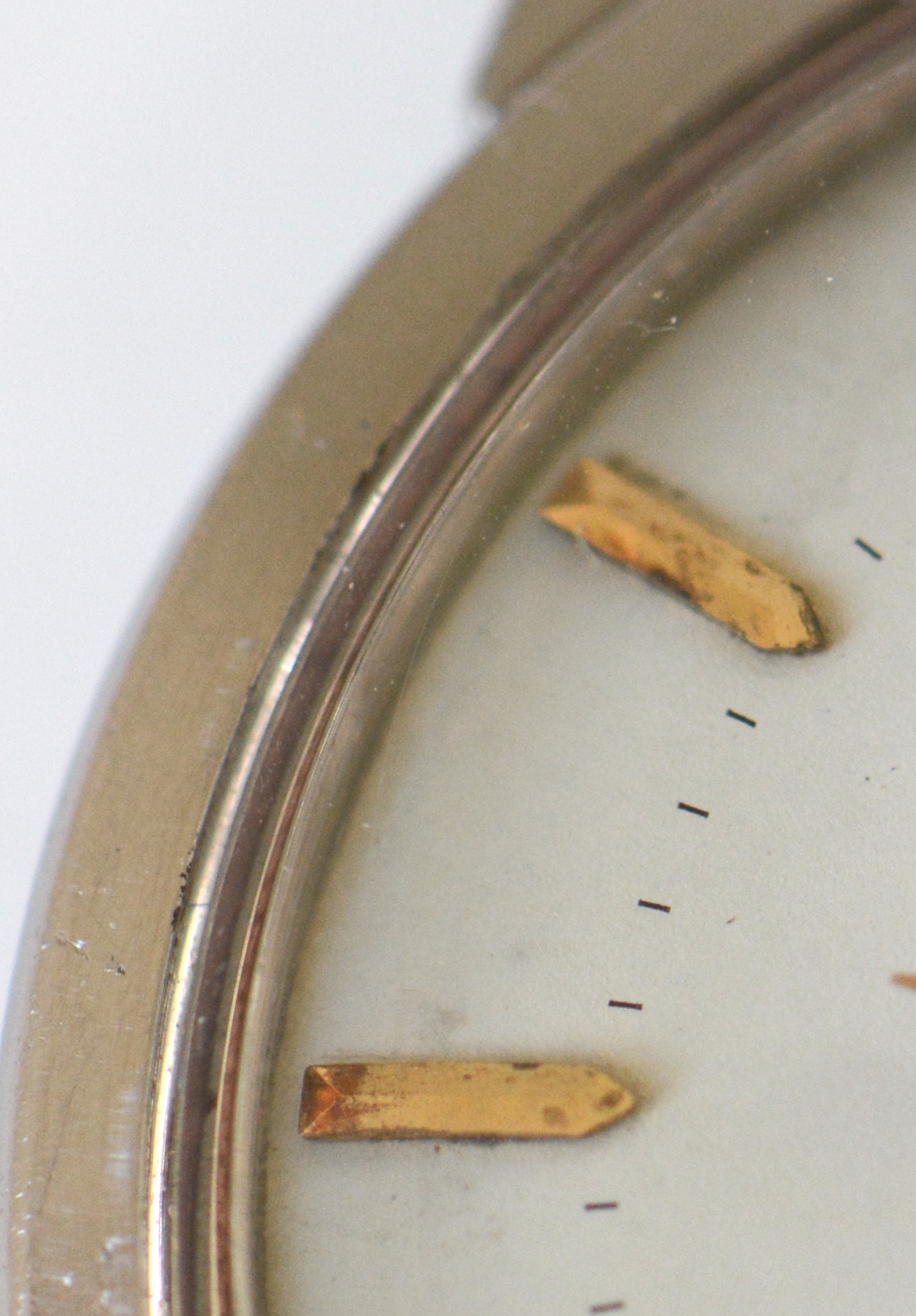 Dial: White dial with some spotting that are visible with the naked eye but are not really distracting. Hands and markers are gold plated with some oxidation here and there. It's a dial without lume (i.e. no radium), which is a plus in my book.