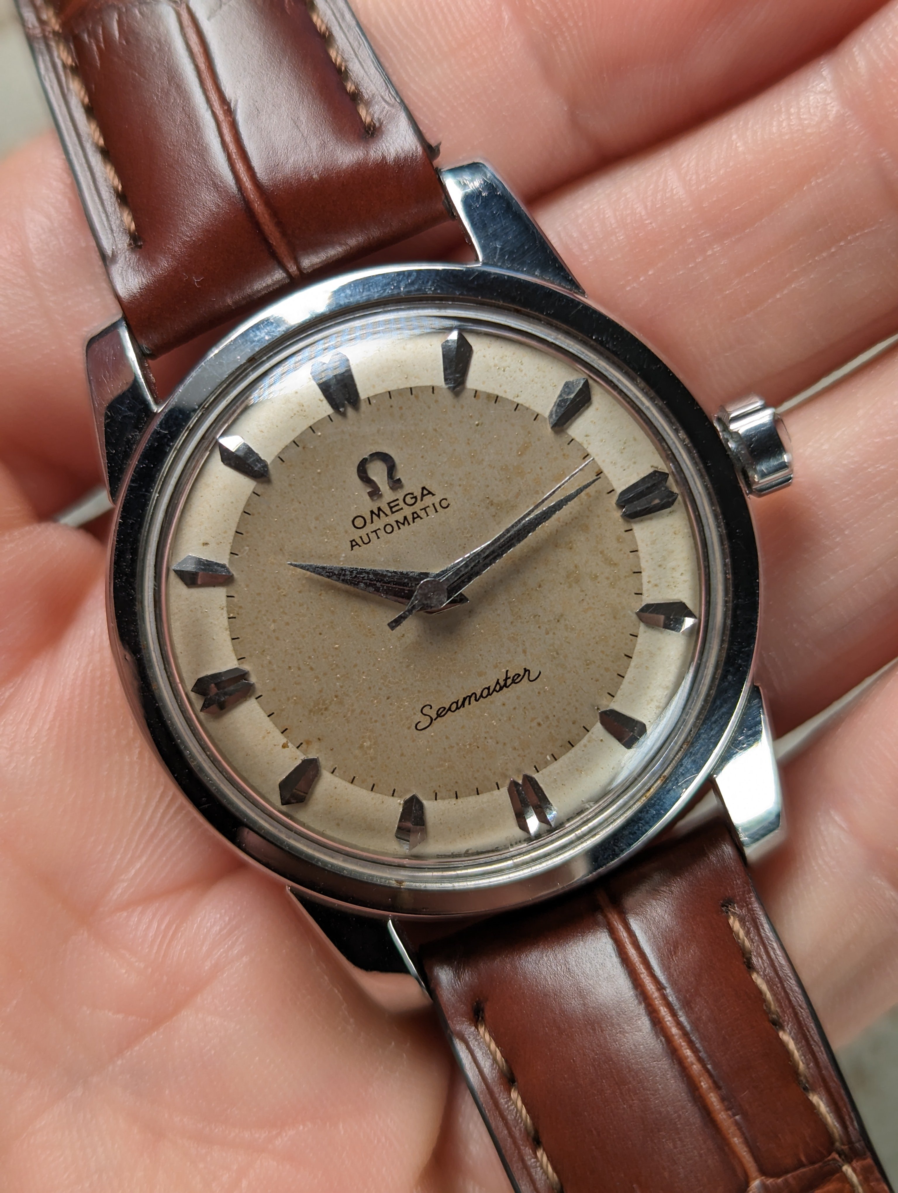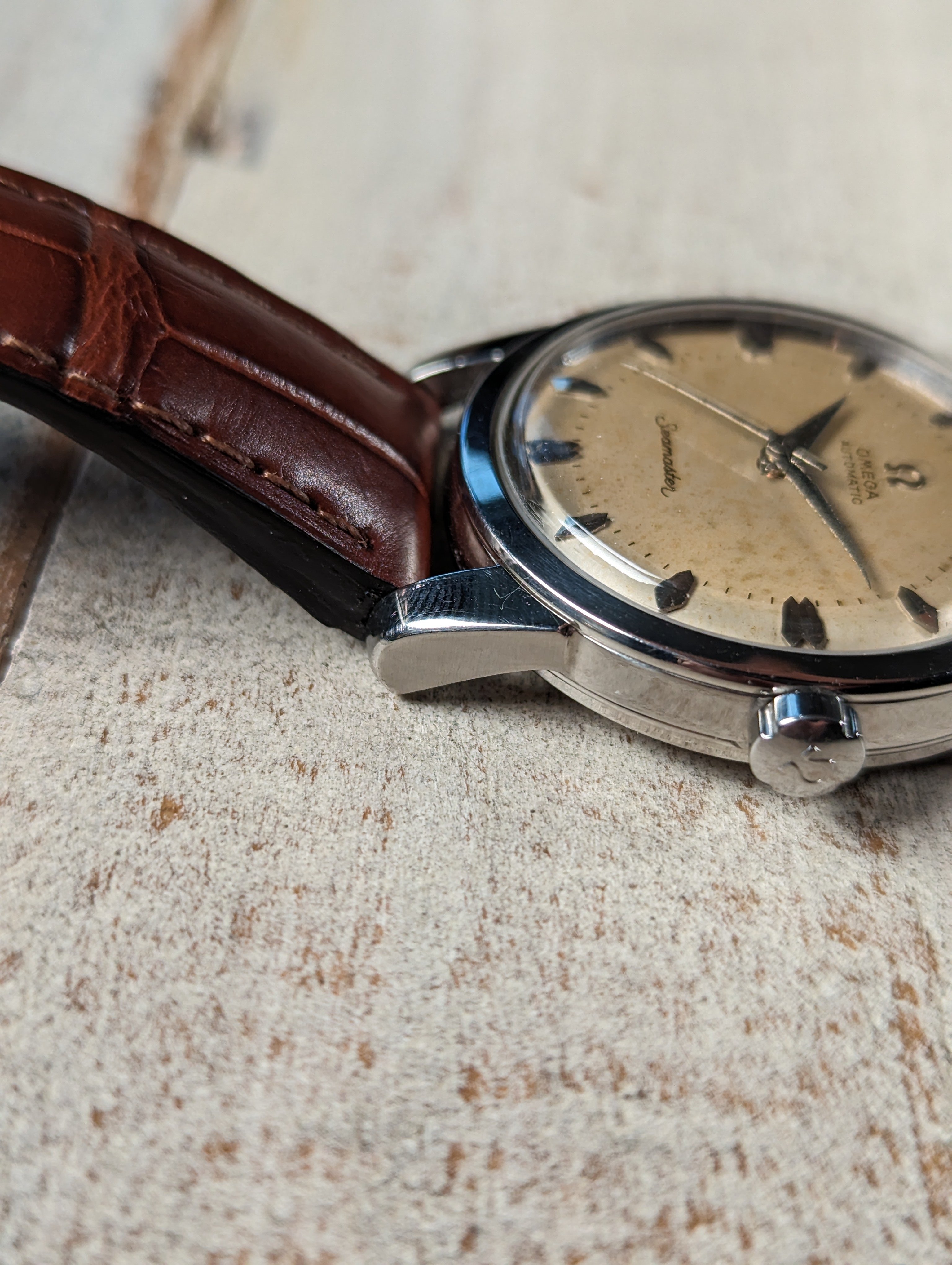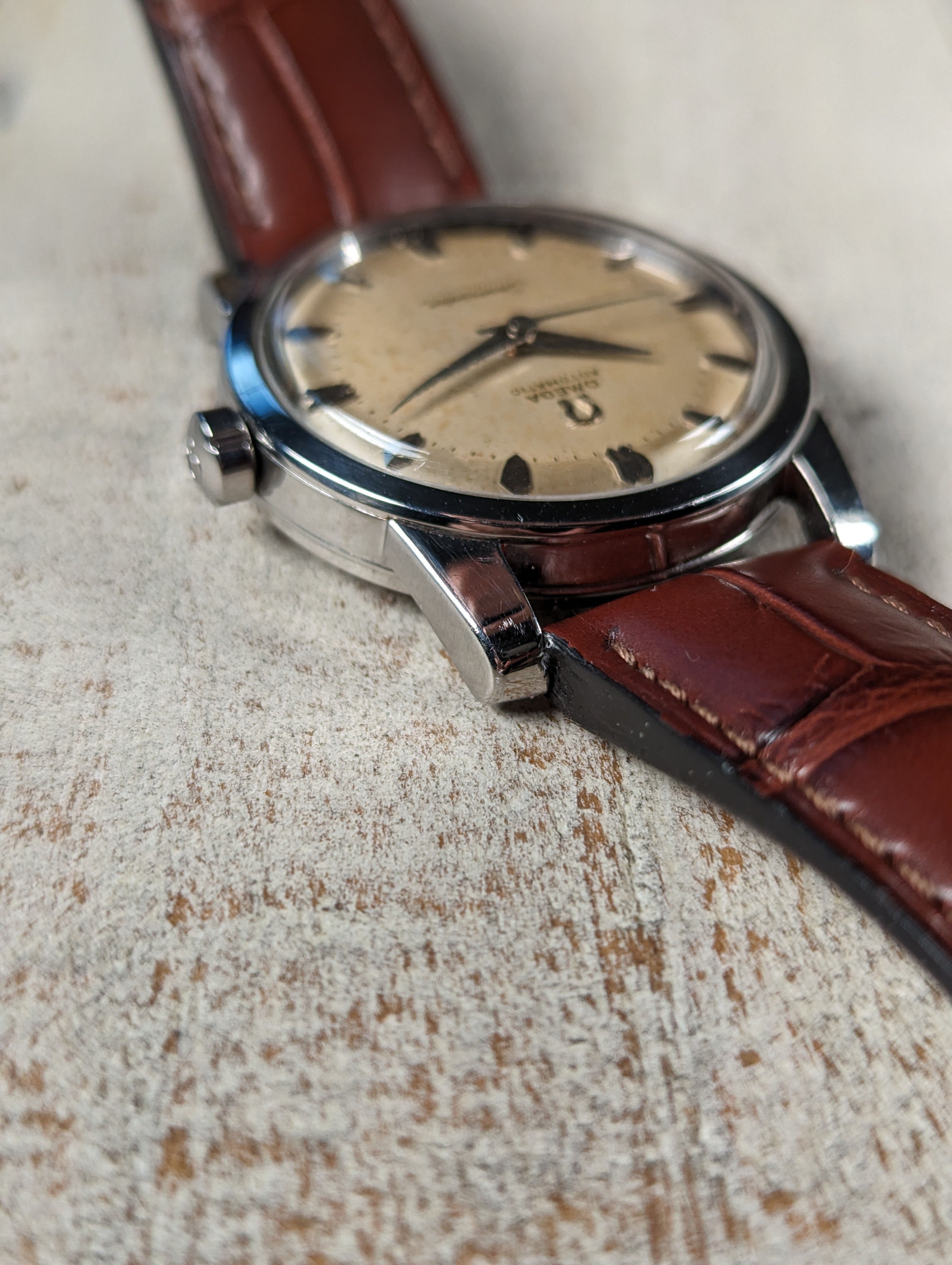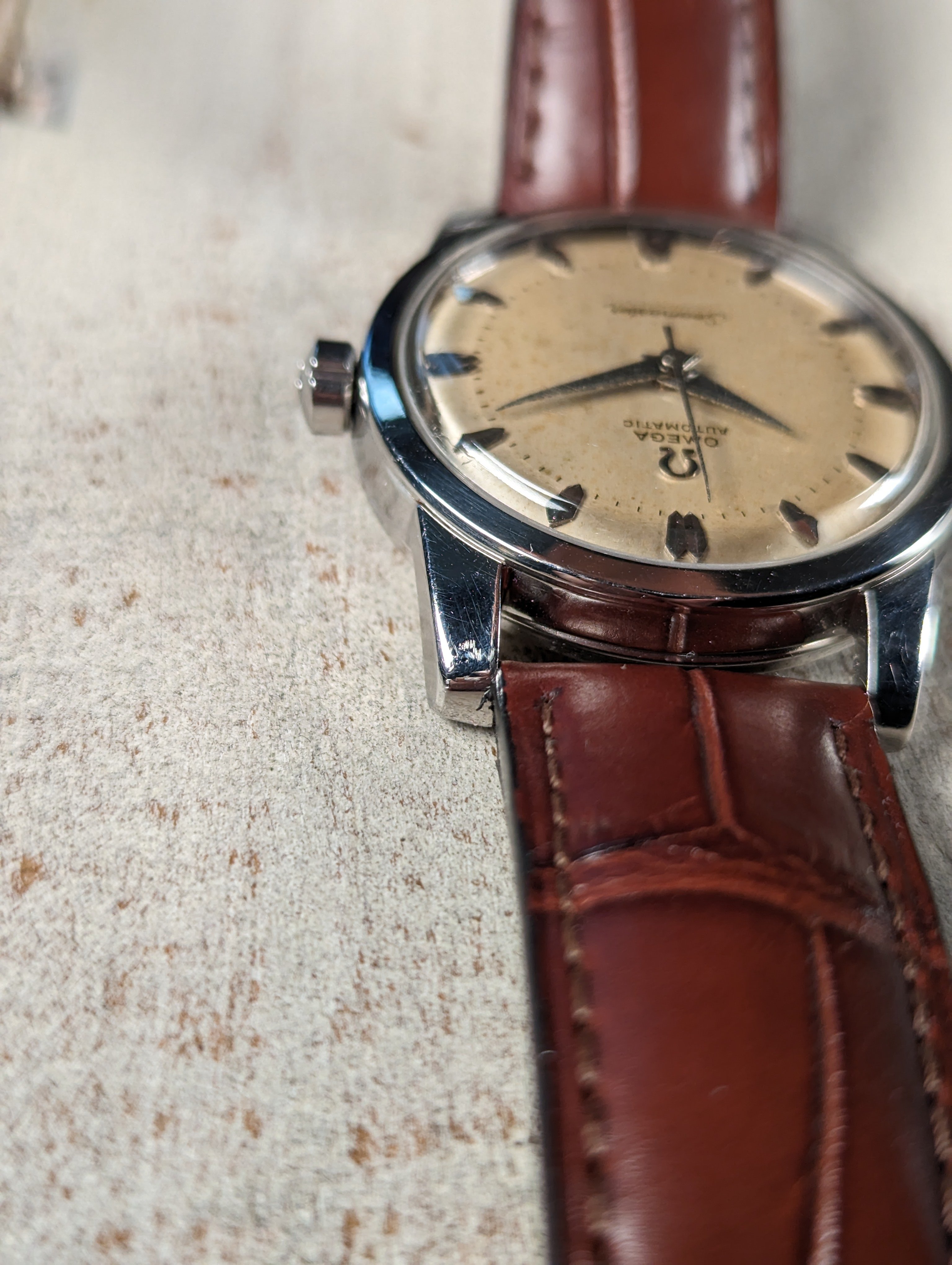 DIAL: An original silver dial with contrast brushing around the outer edge giving the watch a two tone appearance in certain lighting. The dial presents with even patina in the center while the outer edge remains relatively clean. The dial is a non-luminous variant and features coffin style hour markers with dauphine hands.