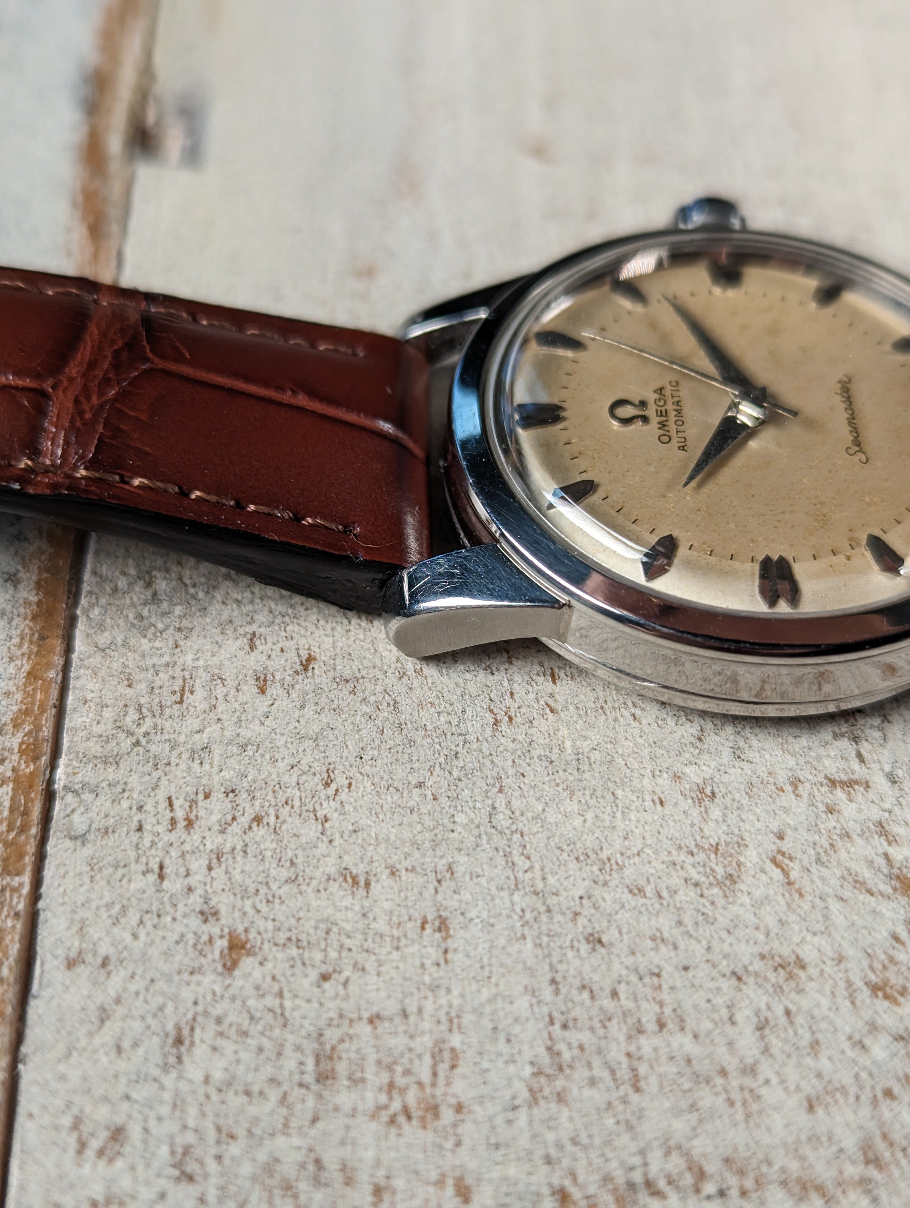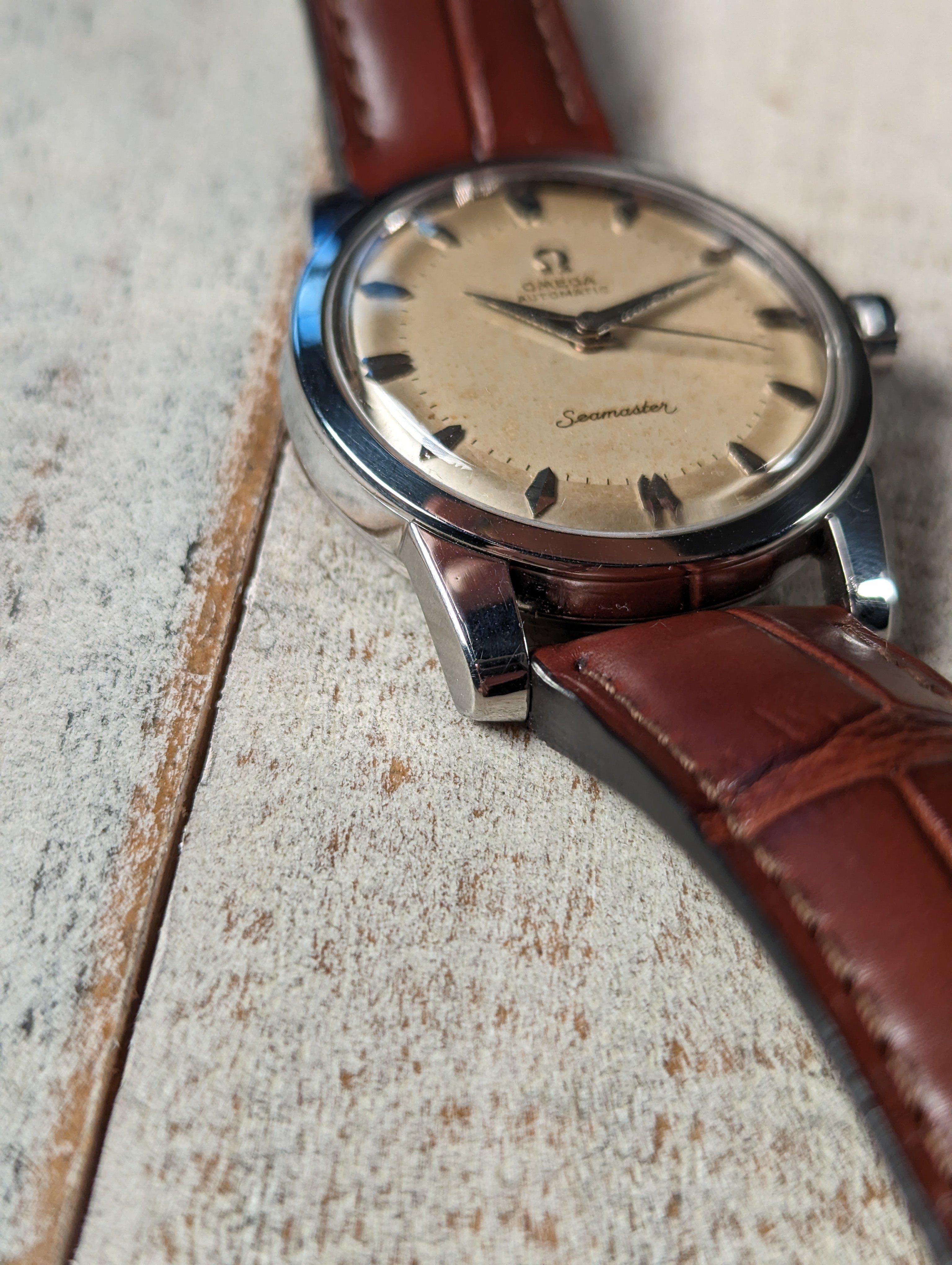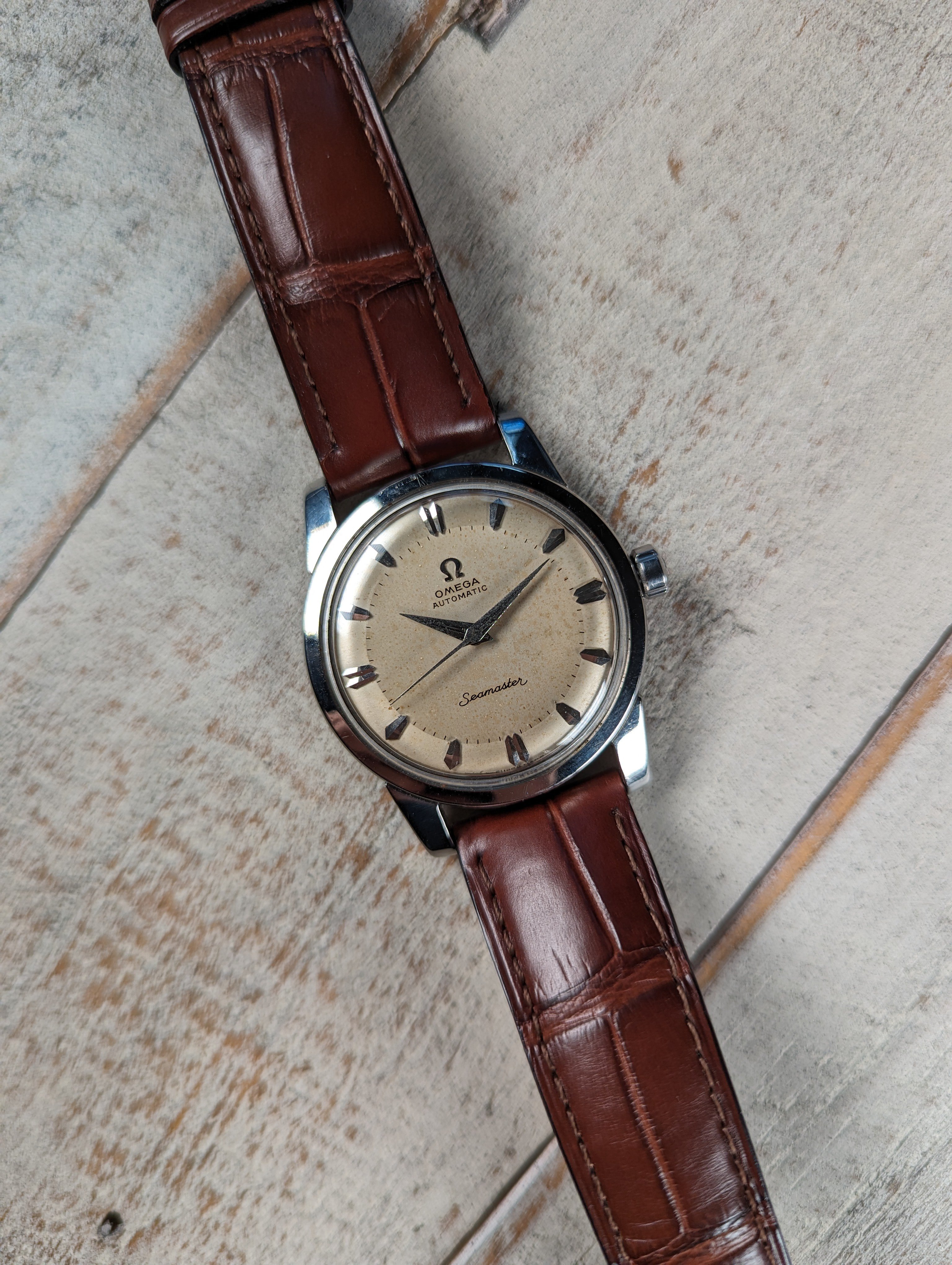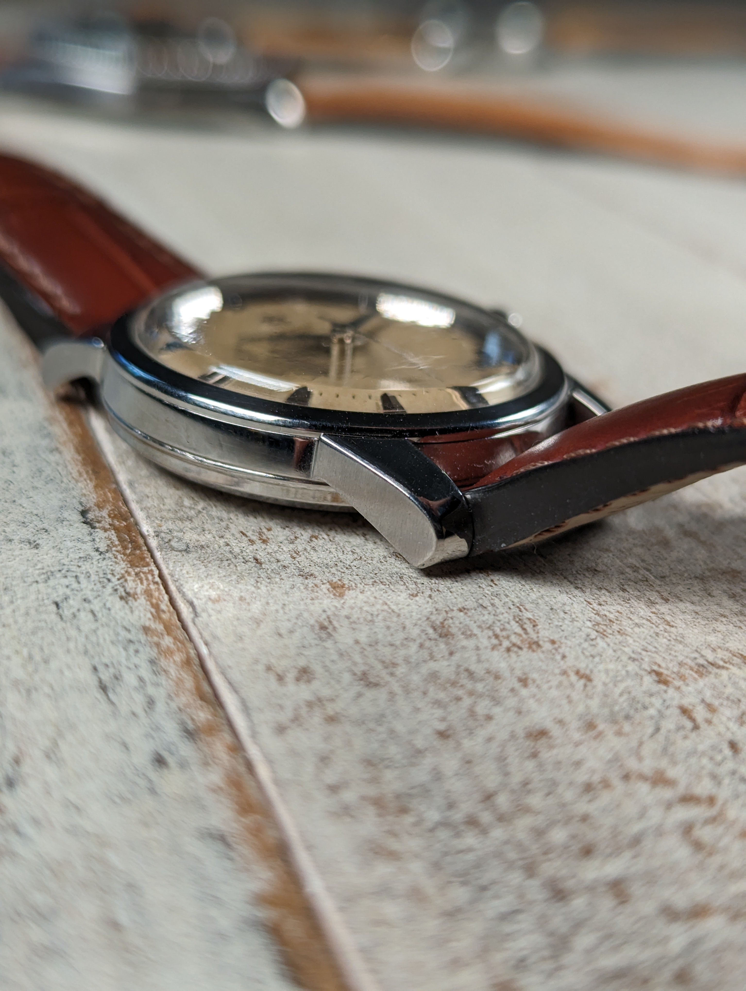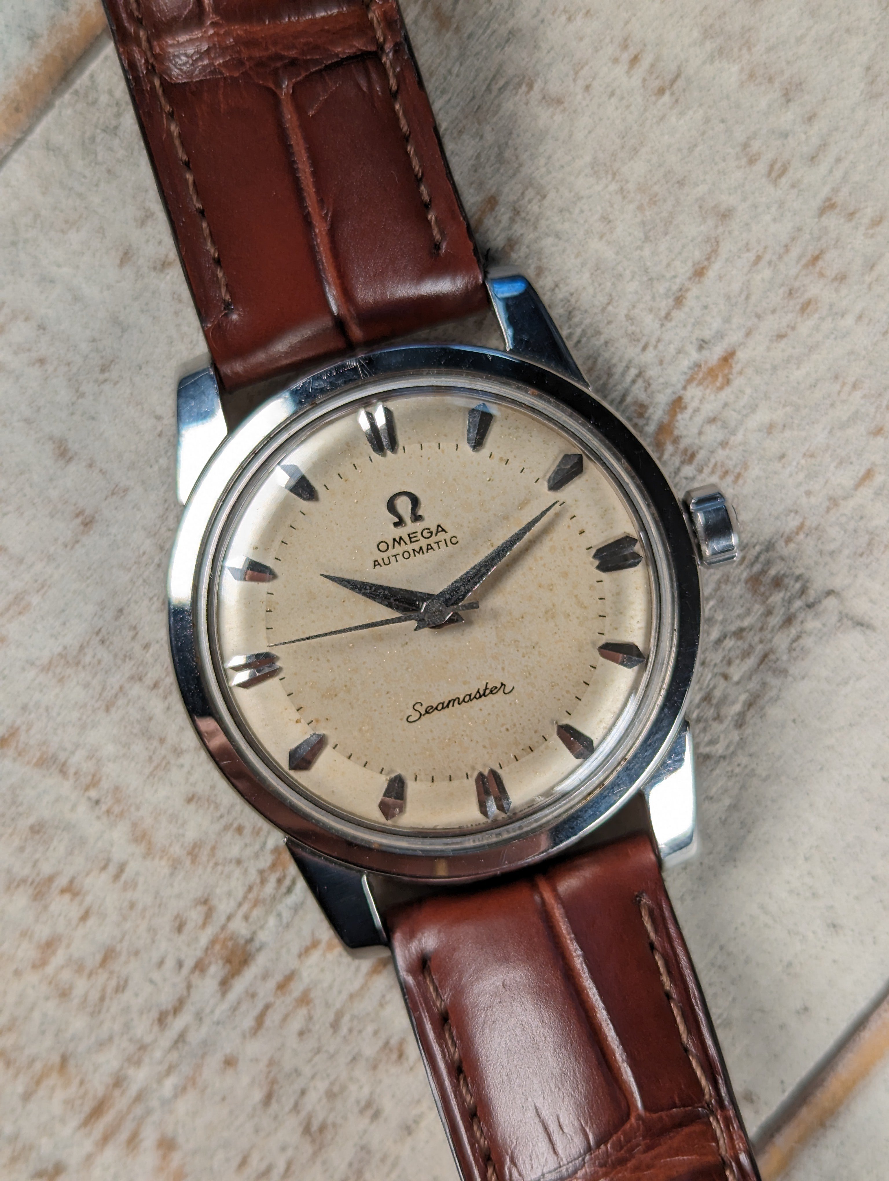DIAL: An original silver dial with contrast brushing around the outer edge giving the watch a two tone appearance in certain lighting. The dial presents with even patina in the center while the outer edge remains relatively clean. The dial is a non-luminous variant and features coffin style hour markers with dauphine hands.