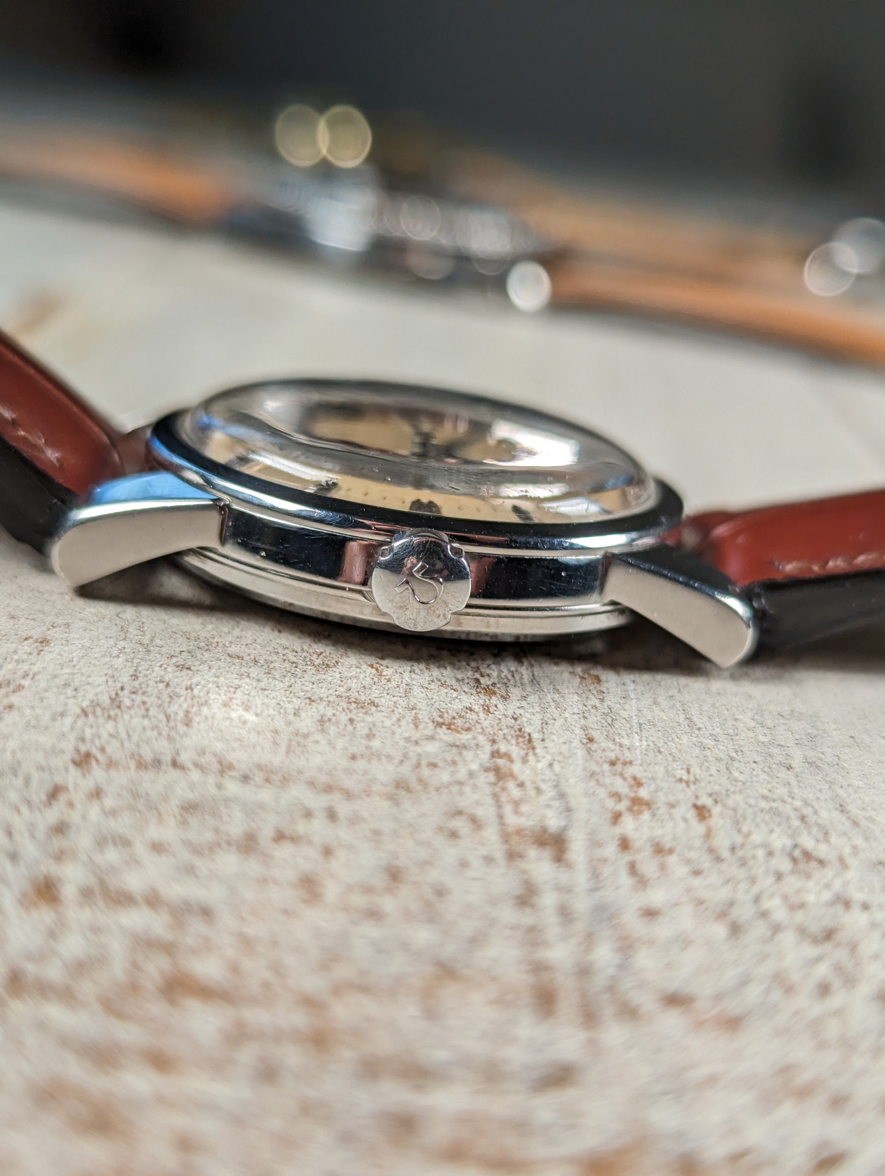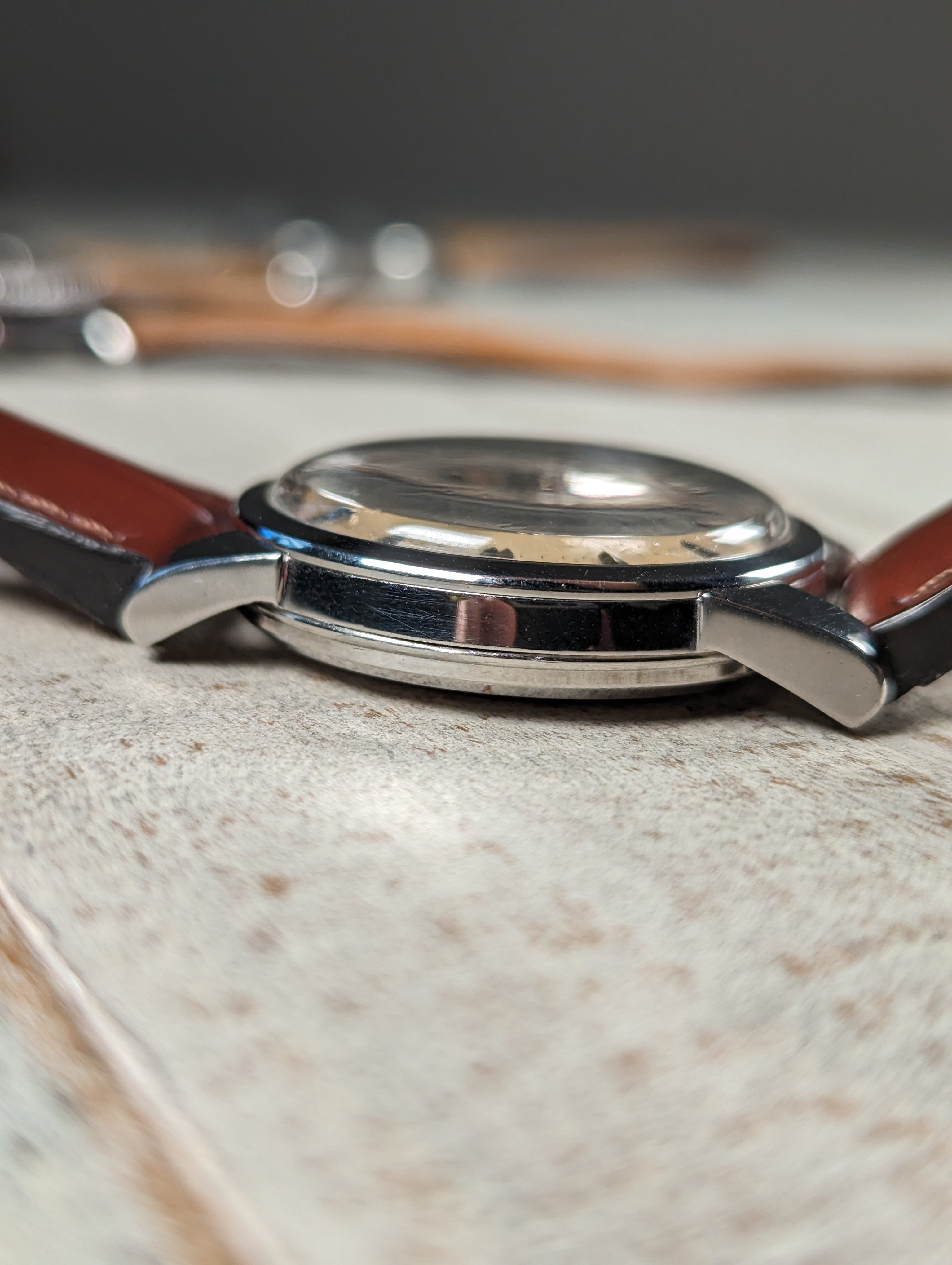 CASE: The 34mm stainless steel case is in good shape. The factory original bevels remain intact and can still be appreciated. The case has been polished in the past. The crystal has been replaced sometime in the past. The case is completed by the watches original crown.