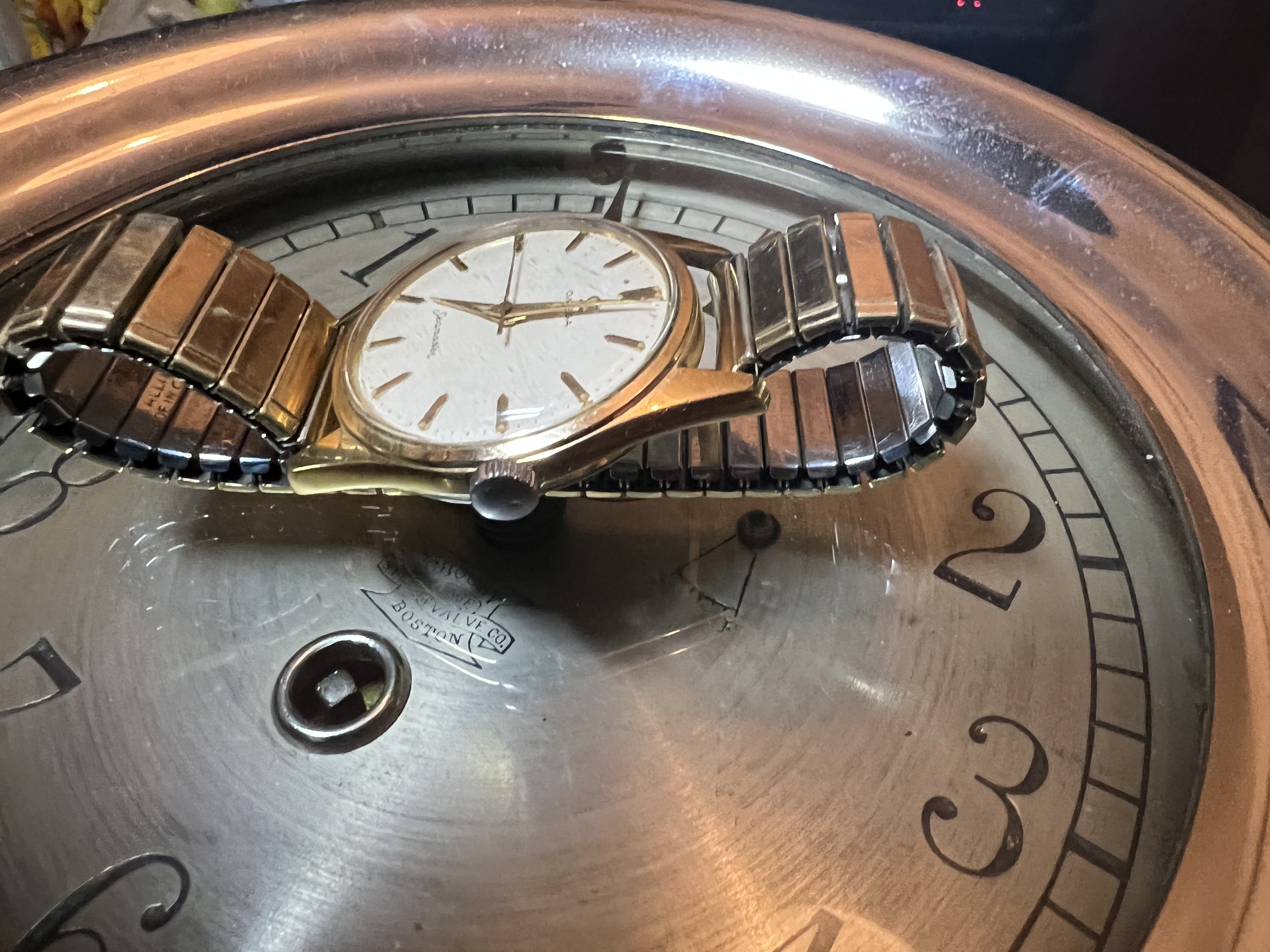 For your consideration... Seamaster PK 2996 in YGP . overall nice condition Omega signed crown lost most of its gold fill . Original surface dial ( original dial) 16.9 million s/n caliber 284 . I dont know service history keeping time. 36 mm ESPA compressor Snapback case with 18mm lugs space . I will include the Flex gold plated bracelet if you want it ... I love them, classic fun and period.