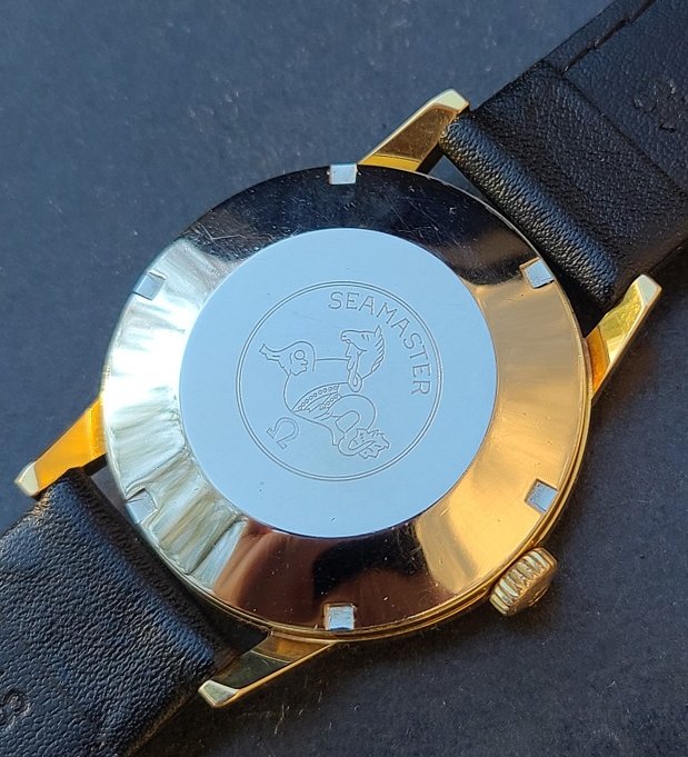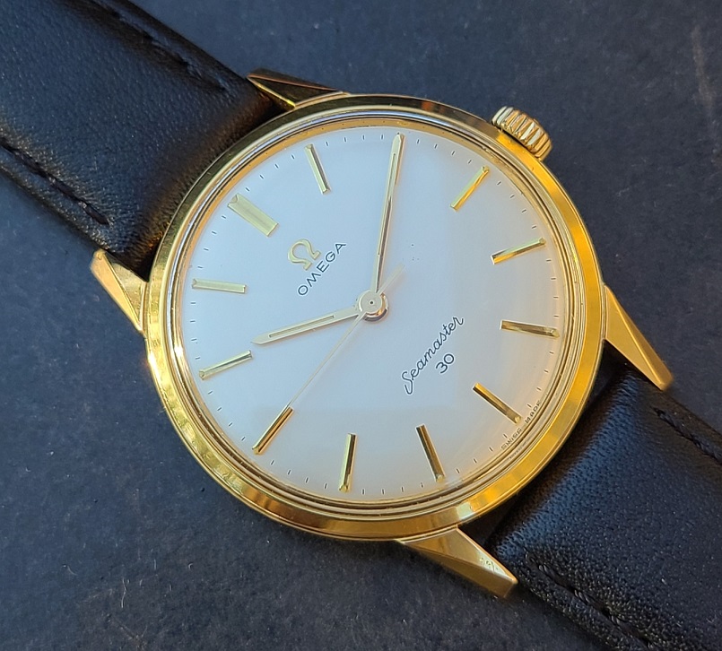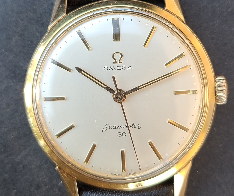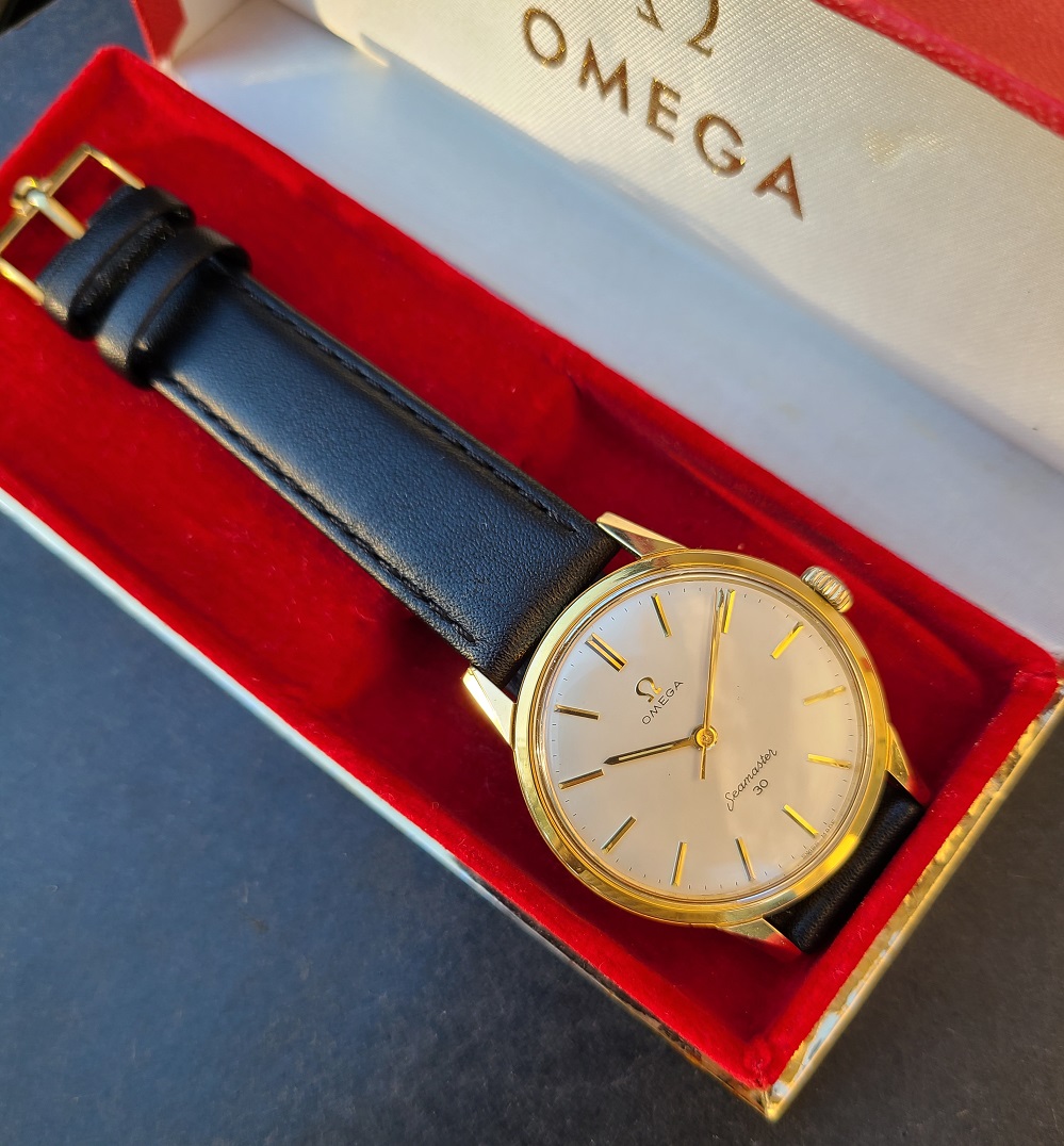 ·Omega Seamaster 30 with 40 micron yellow gold top in excellent condition - Very well preserved example for 60 years old. View the pictures for the actual condition. Excellent factory original dial and gold hands. Crystal is original and signed. The case measures 35 mm in diameter excluding the crown by 42 mm from lug tip to lug tip. Case model is 135.003 - 62. Freshly serviced, absolutely pristine Omega caliber 286 manual wind movement and has a serial number 19795975 dating this timepiece to 1962. The watch is working perfectly and keeping accurate time. The crown is original and signed. Top left hand lug is showing very minor wear through at the tip. Comes with the brand new black leather strap + original gold plated Omega buckle and original Omega box.