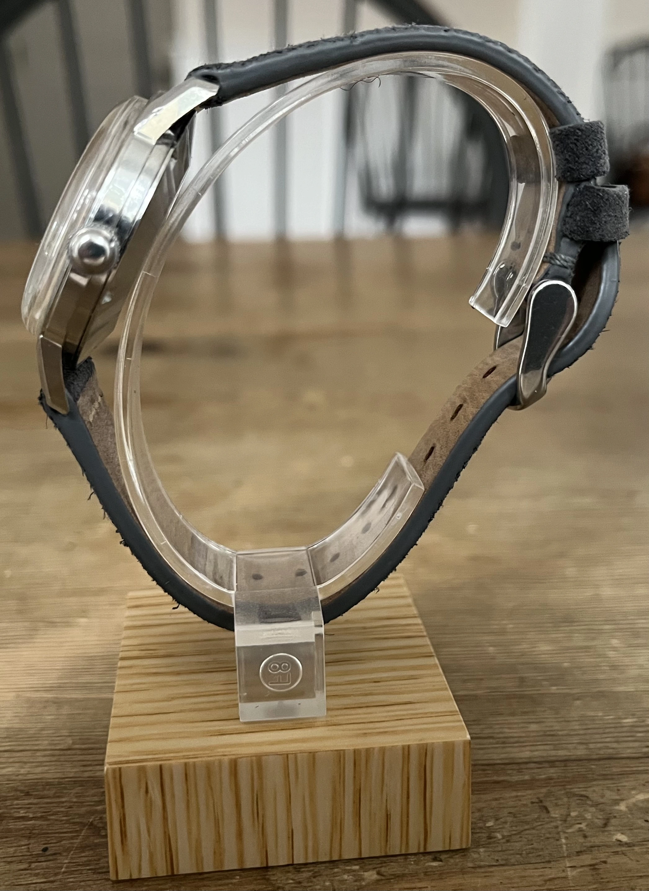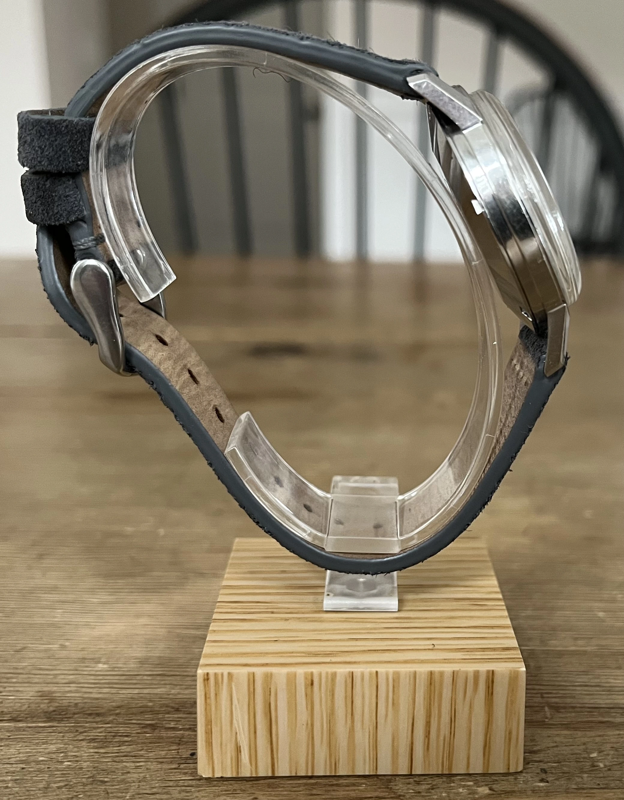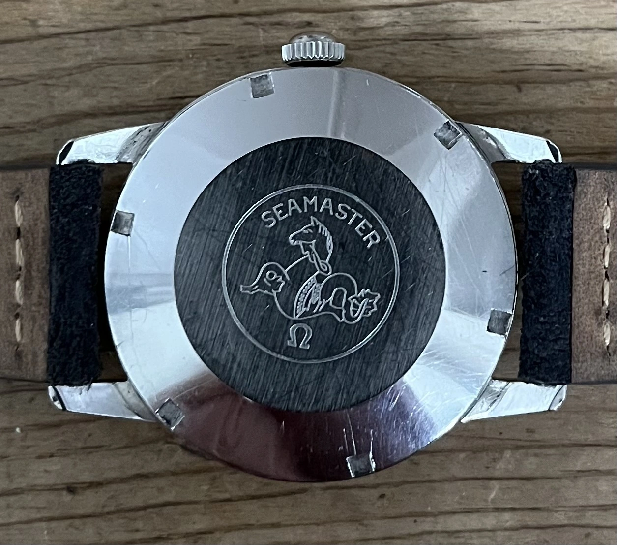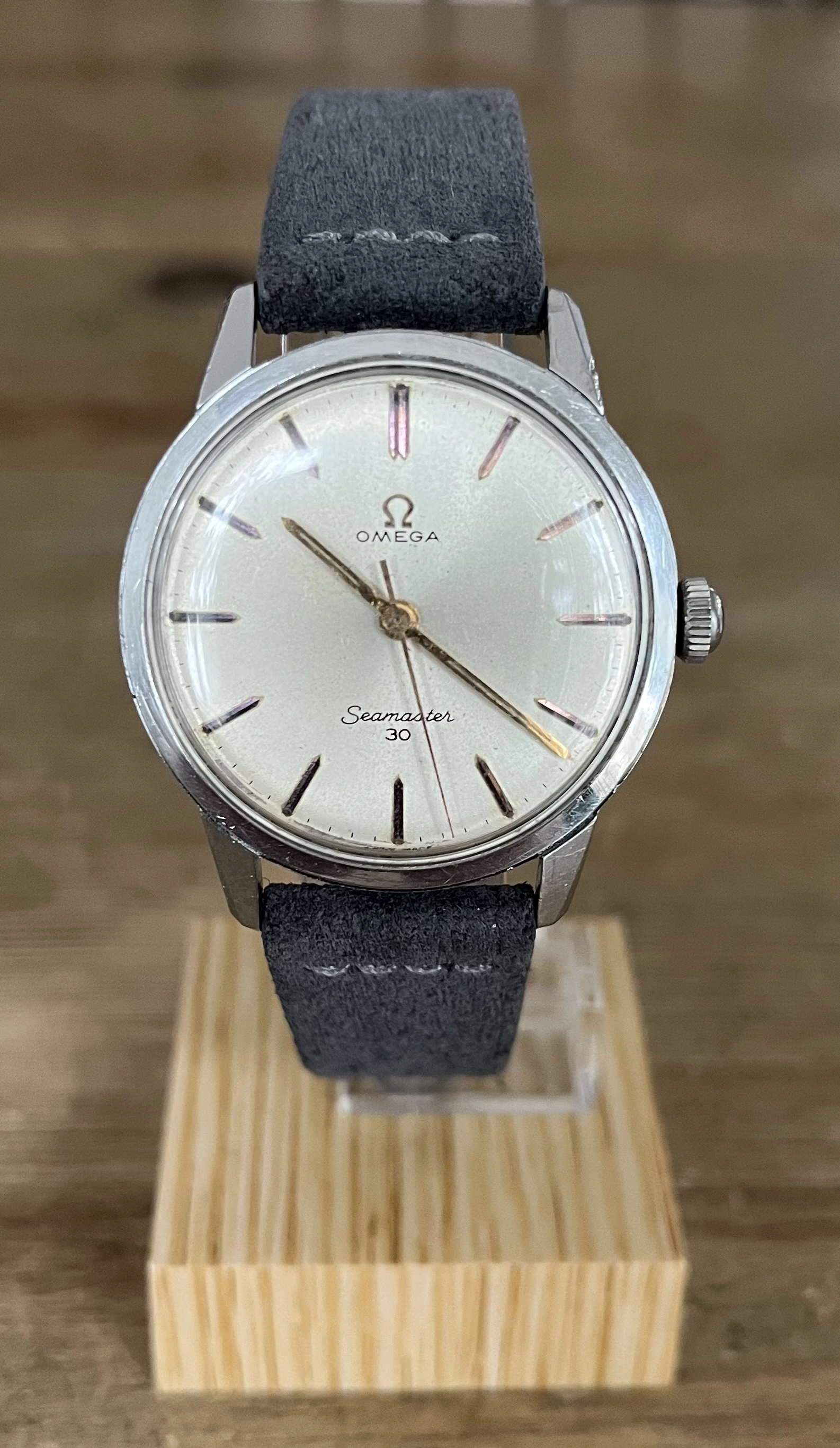 ·Omega Seamaster 30 ca. 1963 utilizing the venerable cal. 286 manual wind, three-hand movement with water resistance to 30m. The creamy silver dial shows some mild patina and is accented by rose gold tone hands and indices, original lume is present on both dial and hands, while the 35mm X 42mm X 18mm Calatrava style all stainless steel beefy lug case appears to have never been polished, as all edges remain crisp and sharp, as does the Hippocampus on the screw-down case back. Watch was recently serviced at the cost of $475 (documentation will be included), at which time the crown was replaced, but I will include a genuine Omega replacement. Timekeeping is spot on, power reserve is terrific and the movement winds/sets smoothly with no issues. Will come on a buttery smooth Benchmark Basics gray suede strap with stainless steel clasp.