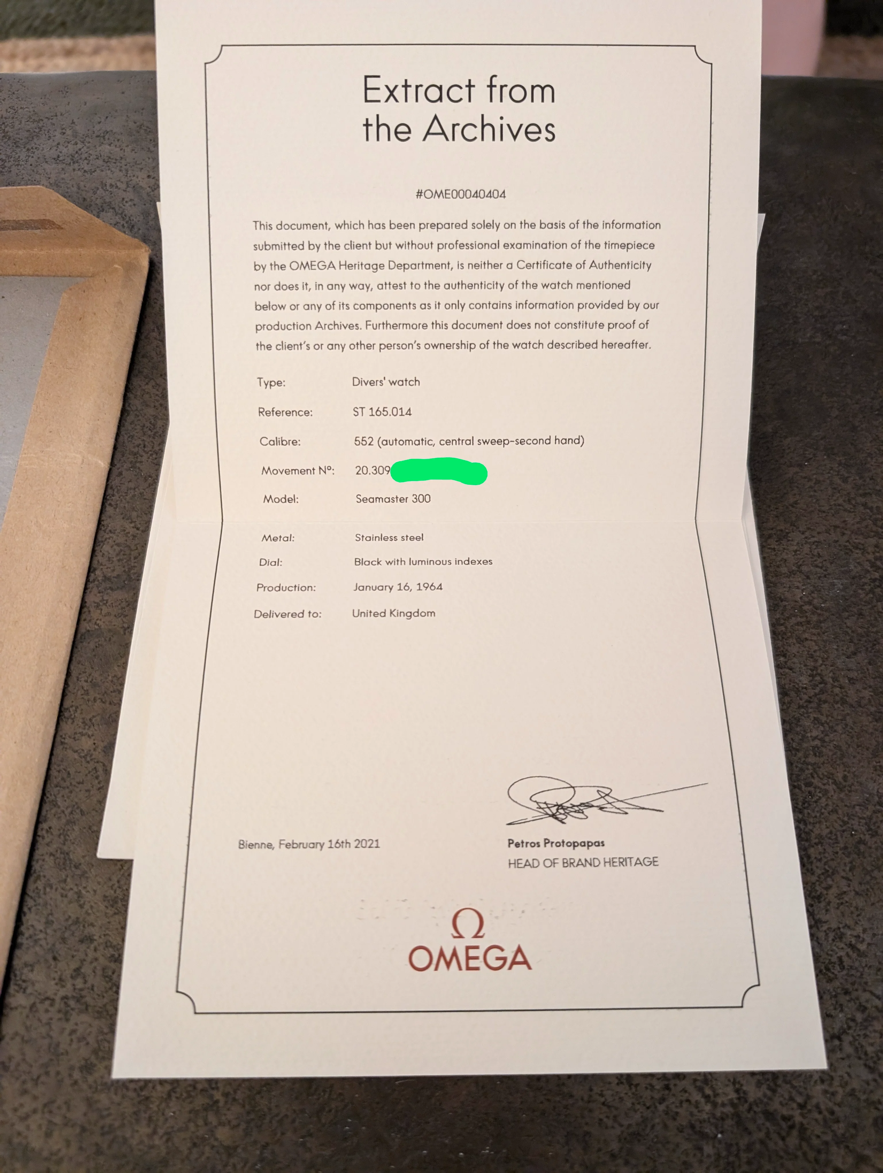 Model: It’s a double stamped 14755-165014. The watch is in superb condition and comes with an Omega extract dating the watch to January 16th 1964. The calibre 552 movement was last serviced in April 2021 by Simon Freese. More details can be found in the original sales post from January 2022: https://omegaforums.net/threads/ome...e-stamped-serviced-with-omega-extract.141340/