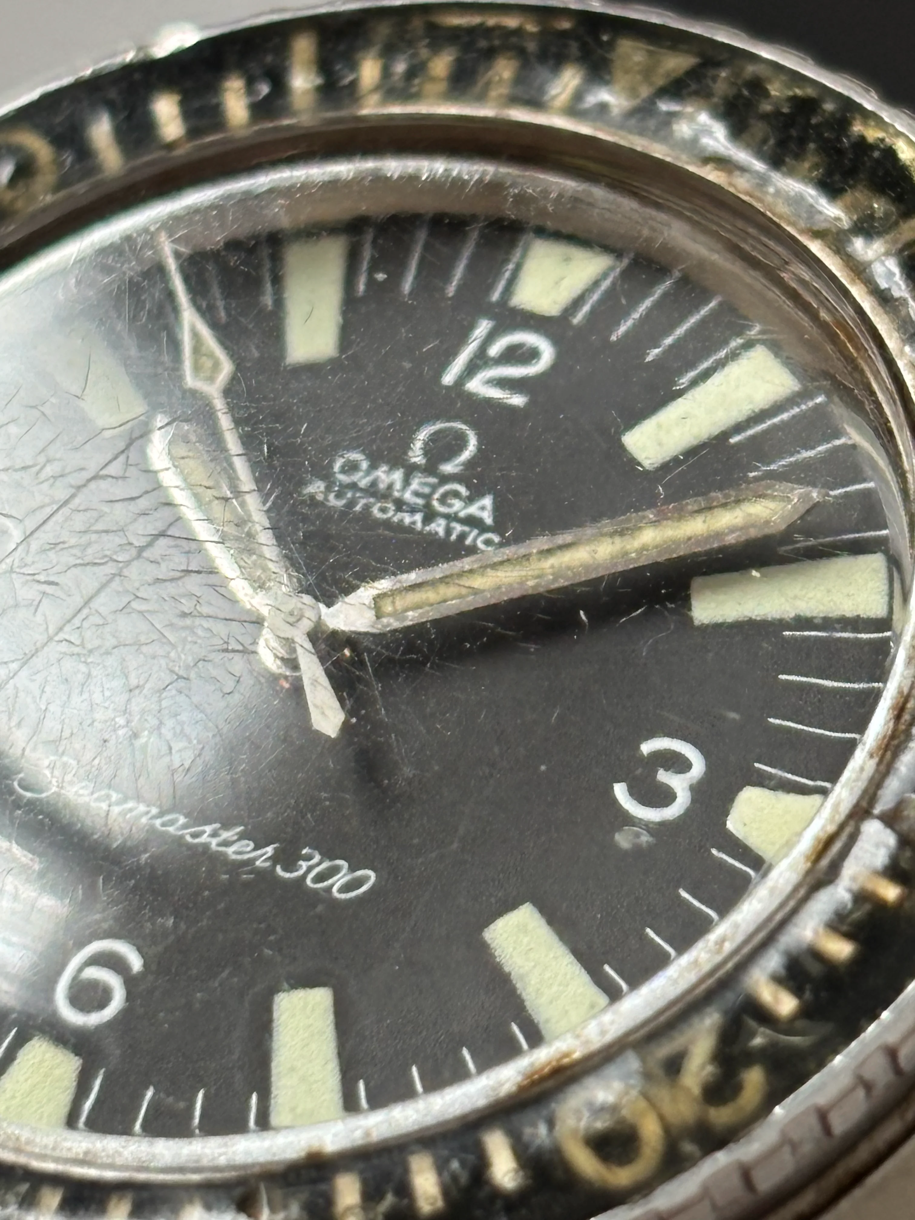 I got convinced that the watch is from '68 (serial is in range, bezel is period correct) and that in the '70's it got a service (probably due to water inside the watch) where dial, hands and crown were replaced. This should be part of the history of this watch, which remains a fine example of 165.024 after all.