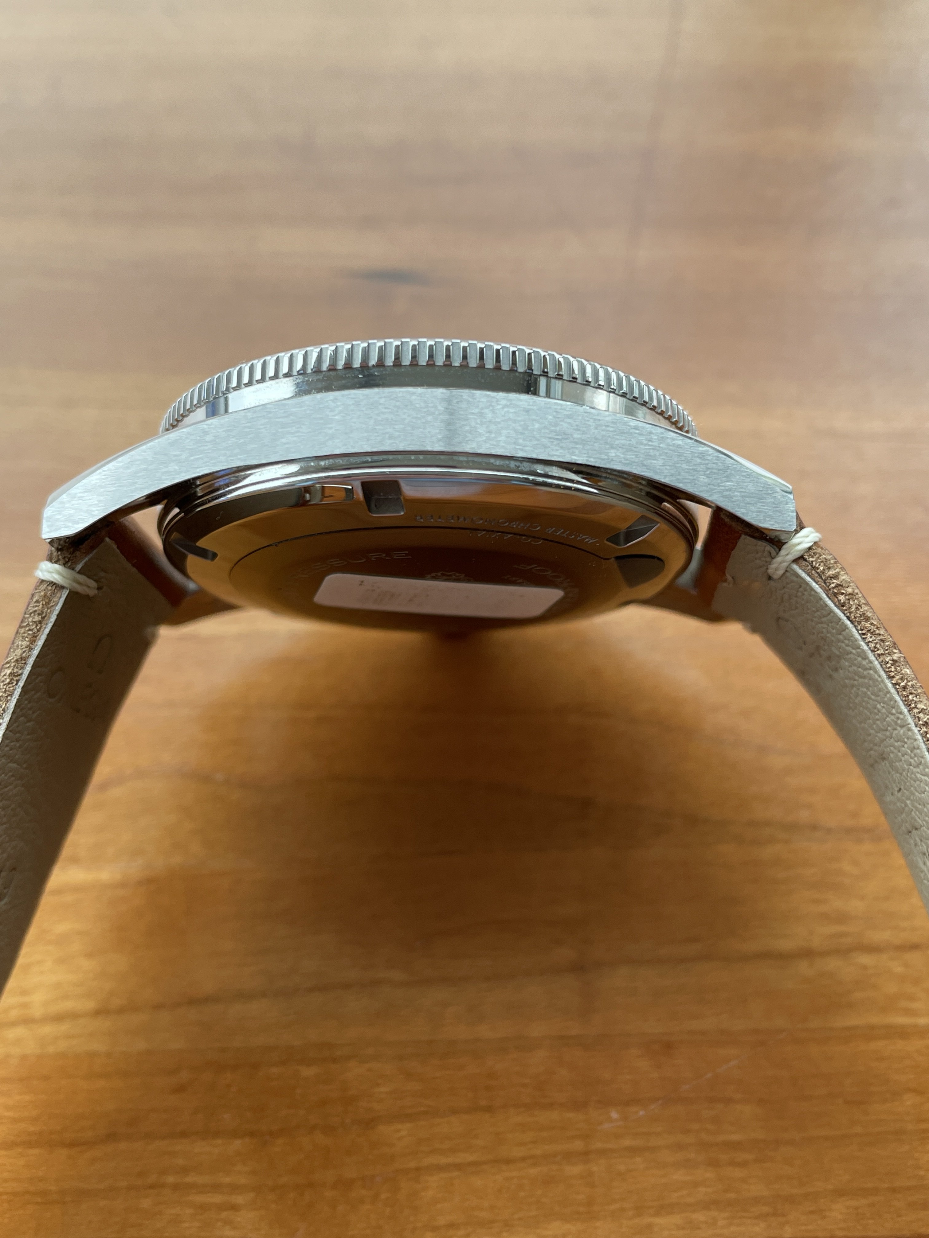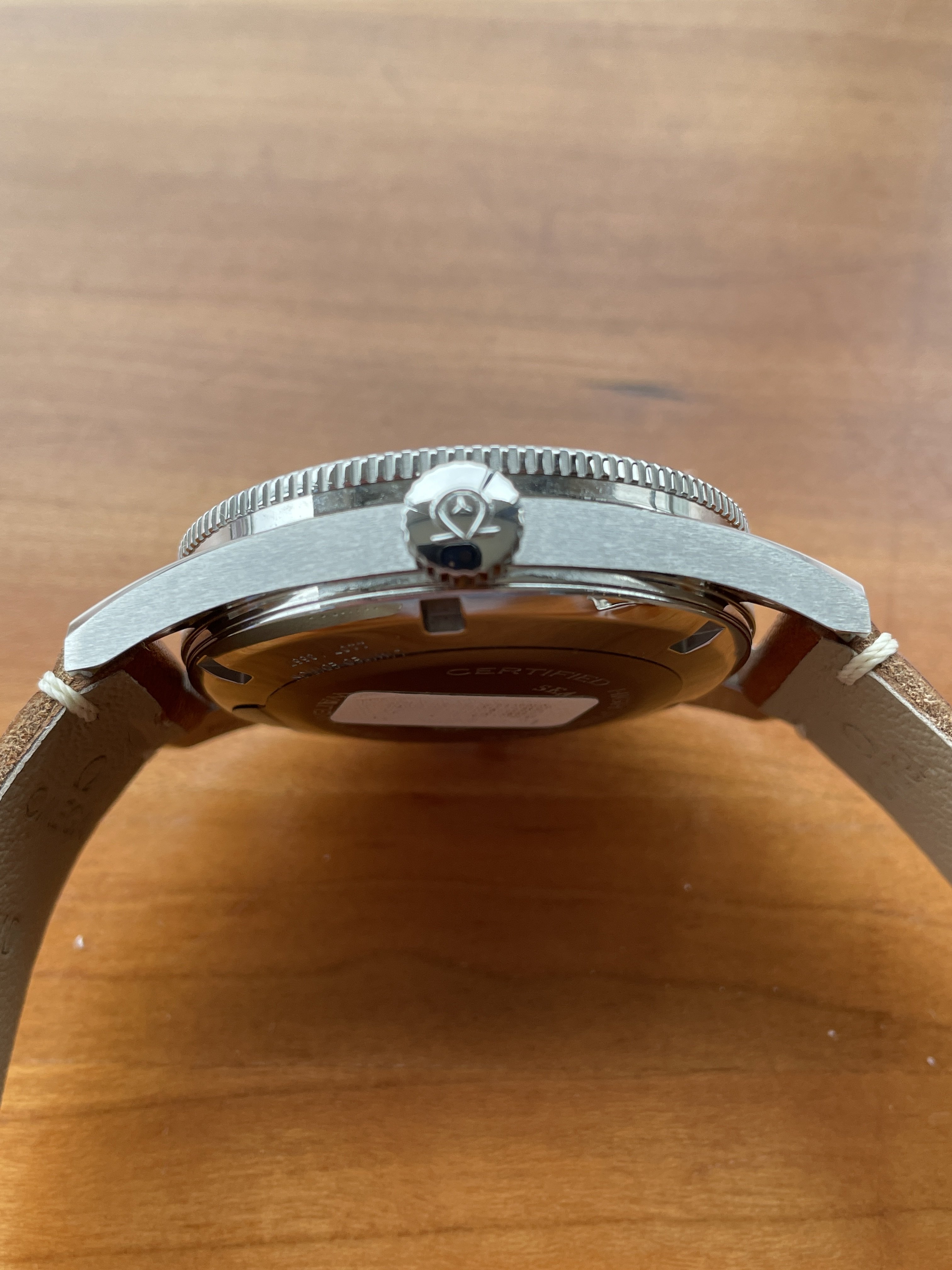 Watch is in excellent condition as seen in the pictures and still has the protective plastic on the back. There are some very minor scratches on the back of the lugs, probably caused when putting on the leather strap.