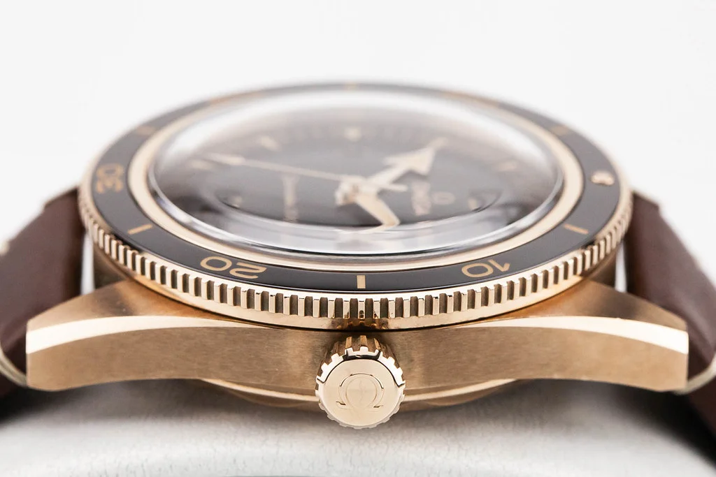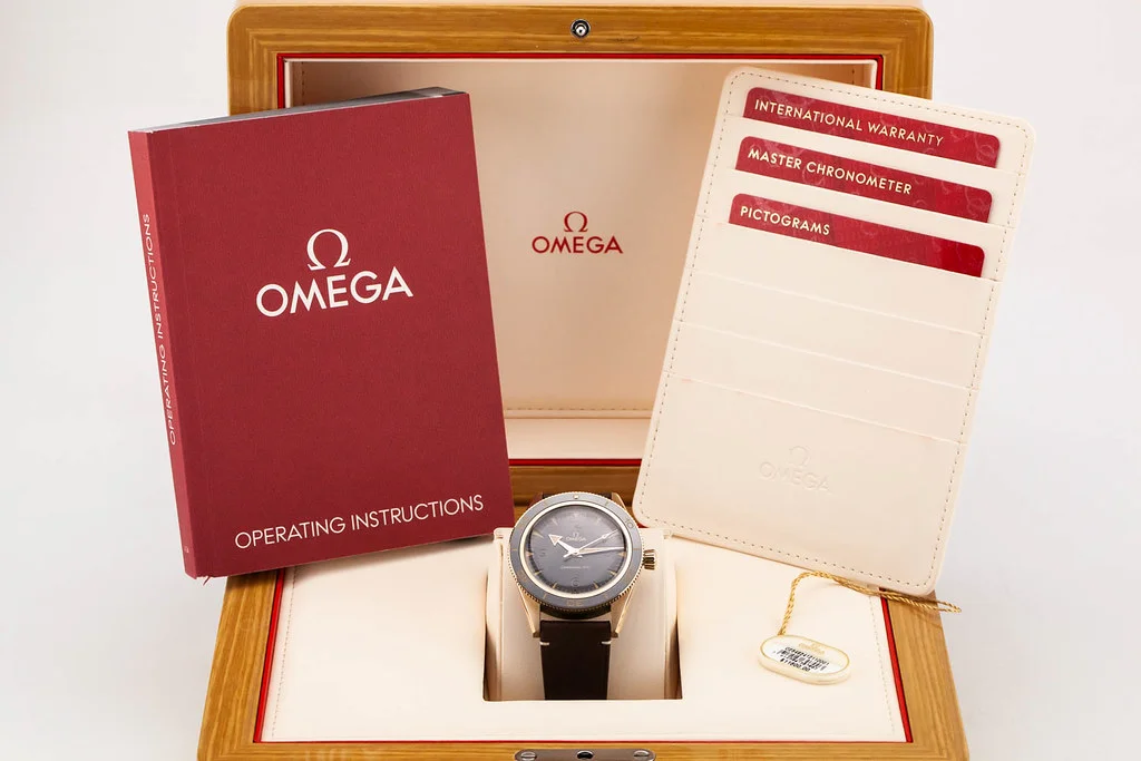 Up for sale is an excellent condition Omega Seamaster 300 41mm Bronze Gold on leather strap, reference 234.92.41.21.10.001. It comes complete with all boxes, papers, booklets, hang tag, and Omega Warranty Card dated June 2021.