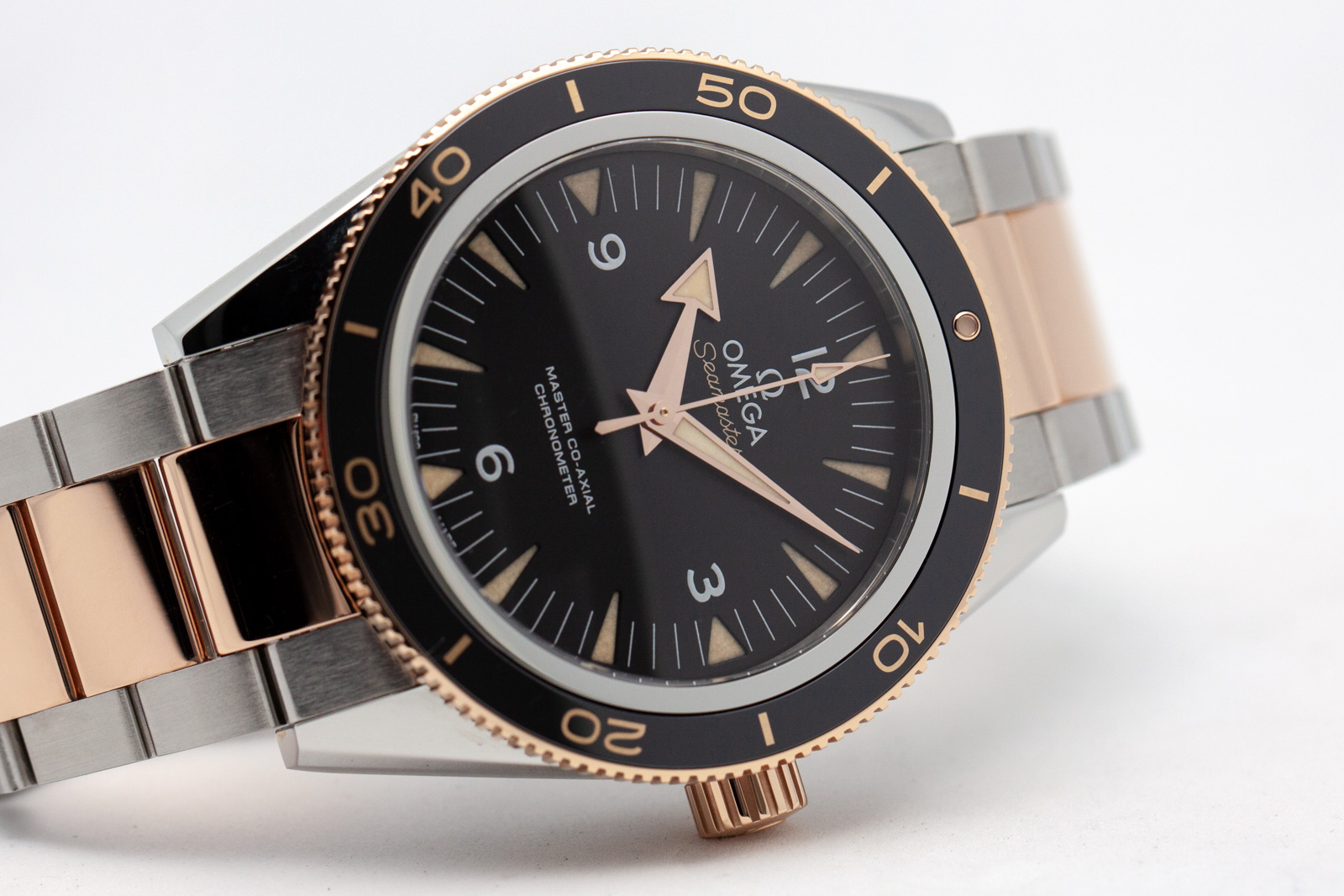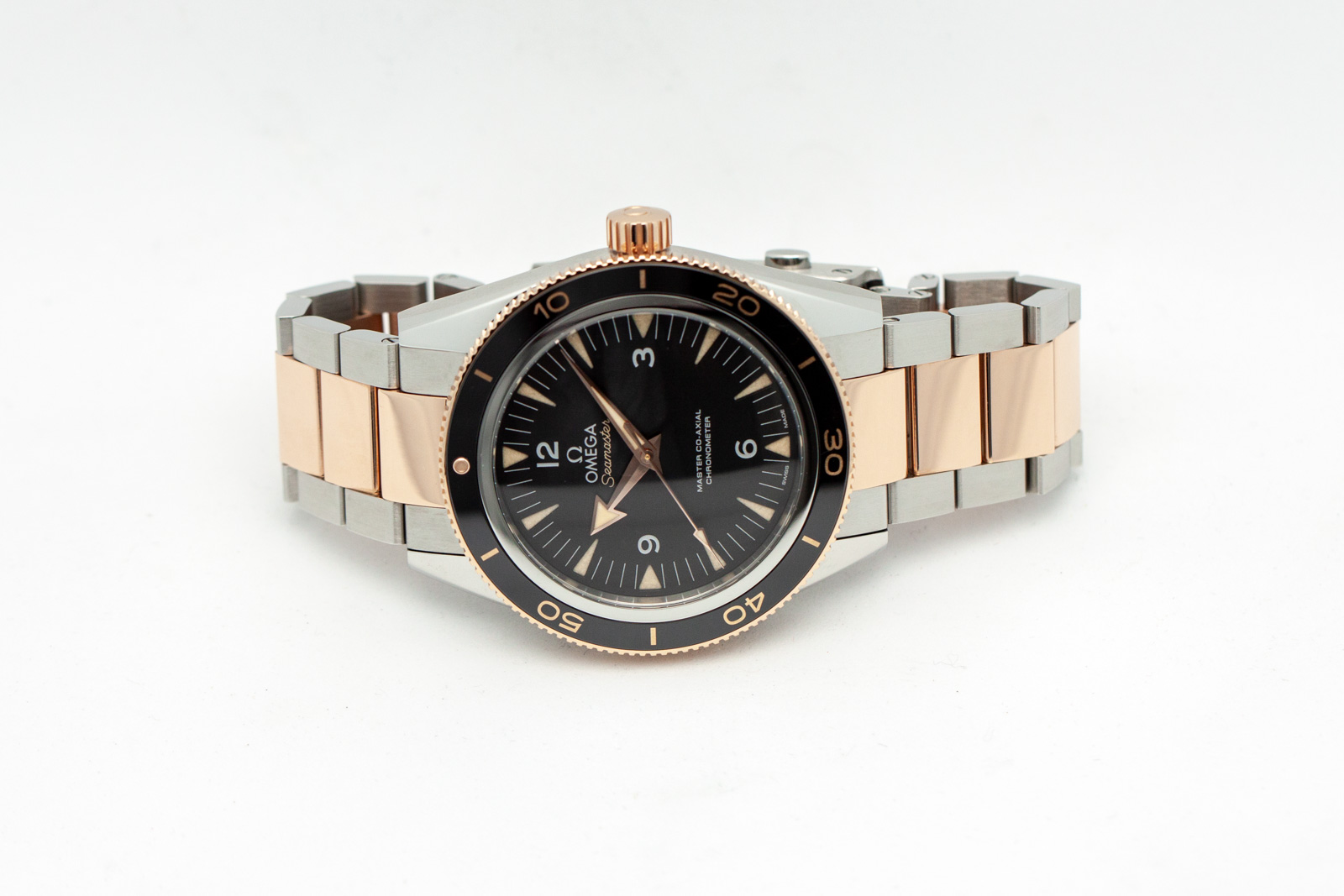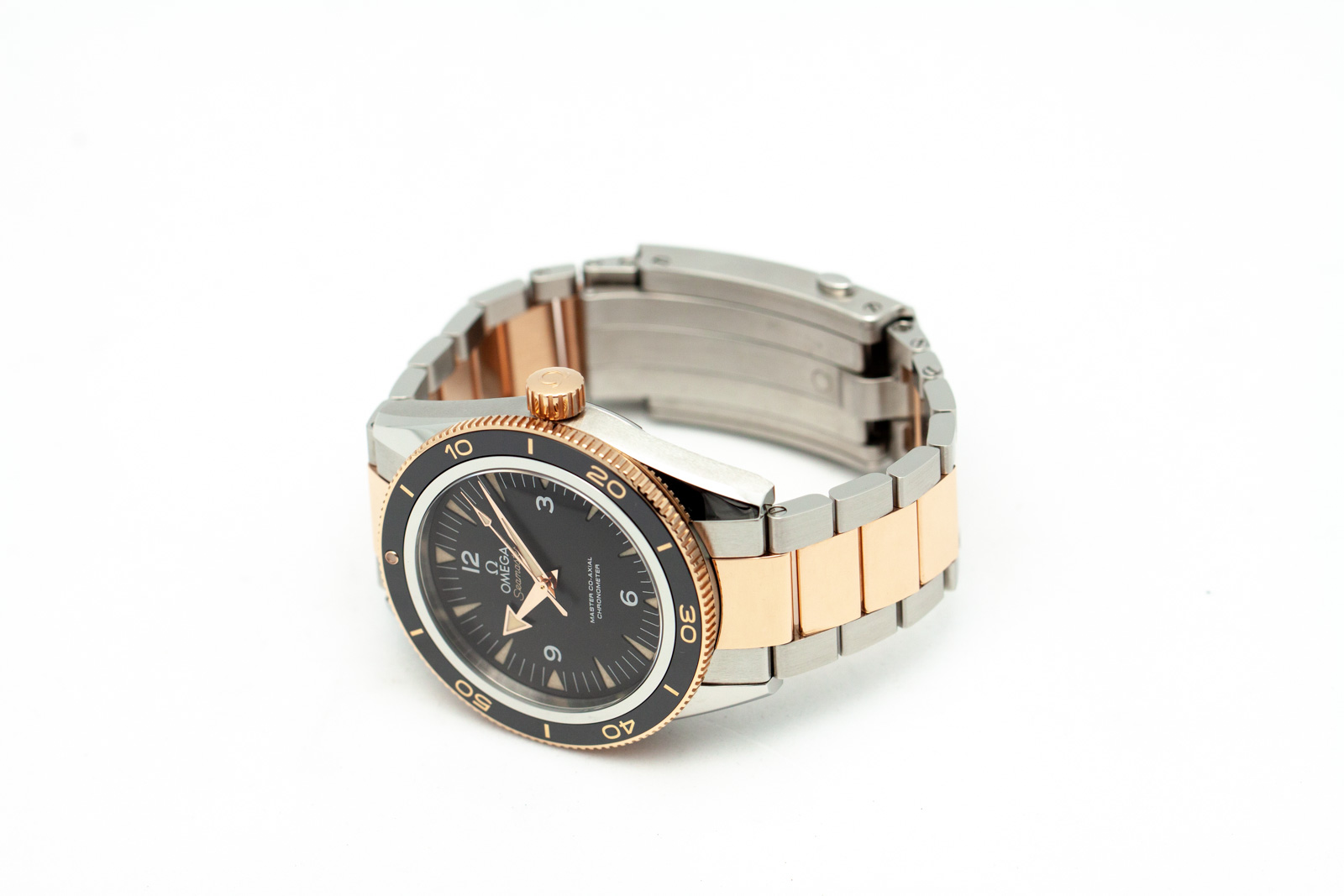 ·Omega Seamaster 300 Co-Axial 41mm, Steel and Sedna Gold, Ref 233.20.41.21.01.001. Watch is in BNIB/unworn condition with full Omega warranty, crystal is scratch free, running excellent. Powered by Omega Cal Co-Axial Cal 8400, antimagnetic to 15k gauss, 60 hour power reserve and water resistant to 300m. Includes everything in photos including inner/outer Omega boxes, hang tag, Omega manual/book, all bracelet links, Pictogram and Omega International Warranty card, stamped by US Omega AD, dated July 2018. Photos are of actual watch for sale, serial numbers removed from photos, but intact and matching on actual watch for sale. I am a watch collector and independent seller and not affiliated with Omega, guaranteed authentic. Accepting trades on Rolex, IWC, Zenith, Breitling, Omega, Tag Heuer and most luxury brands.