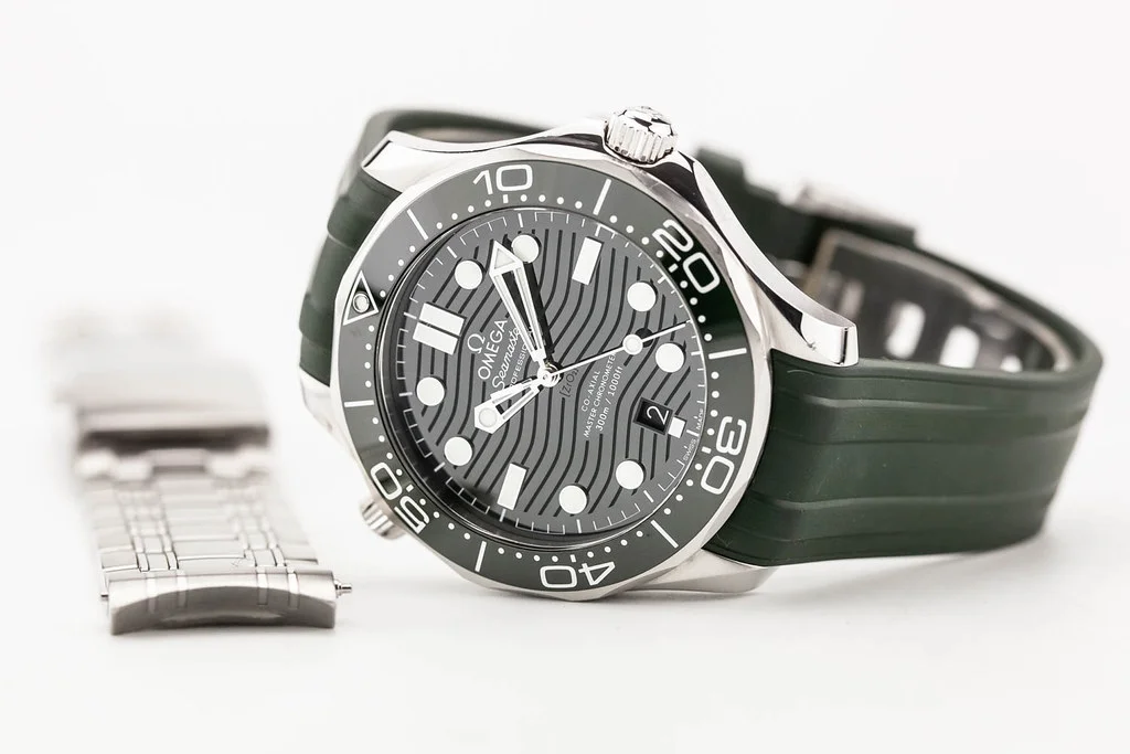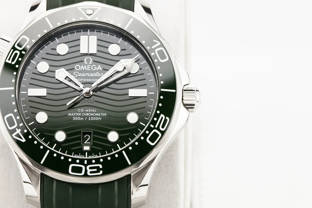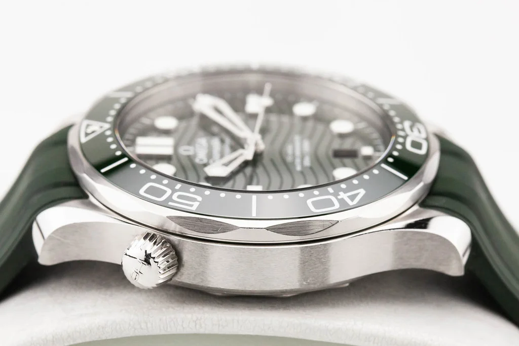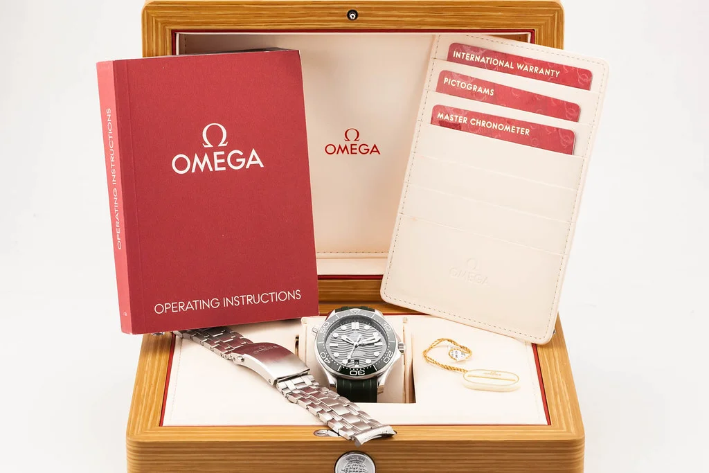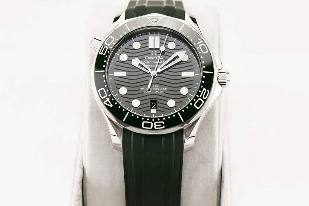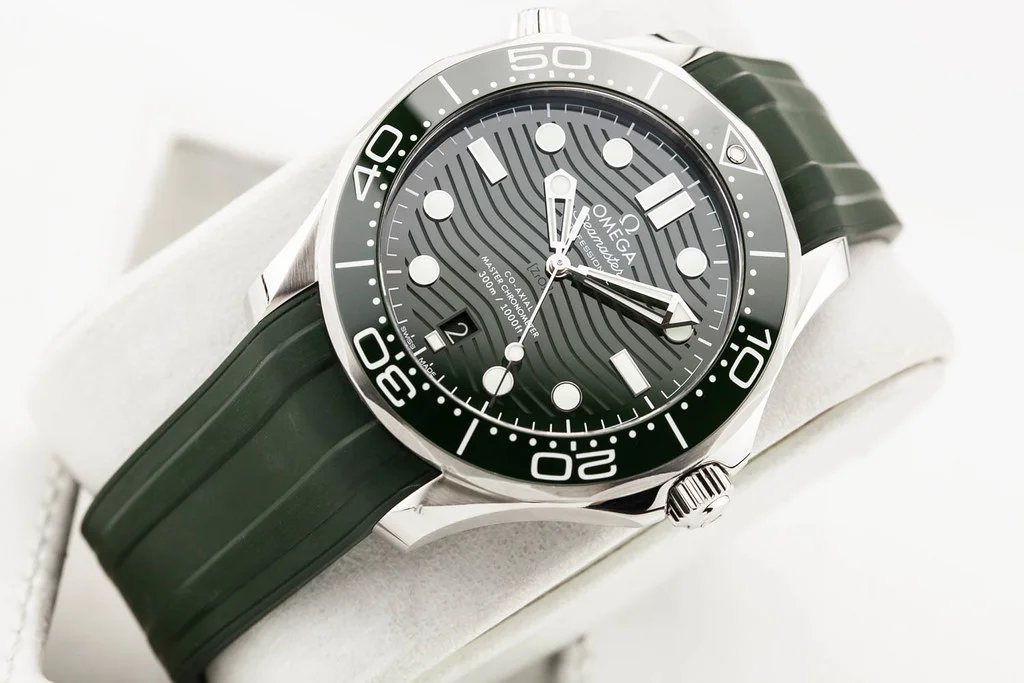·Up for sale is an excellent condition Omega Seamaster 300 Green Wave Dial on Rubber Strap, reference # 210.32.42.20.10.001. It comes complete with all boxes, papers, booklets, hang tag, OEM bracelet and Omega Warranty Card dated June 2024.