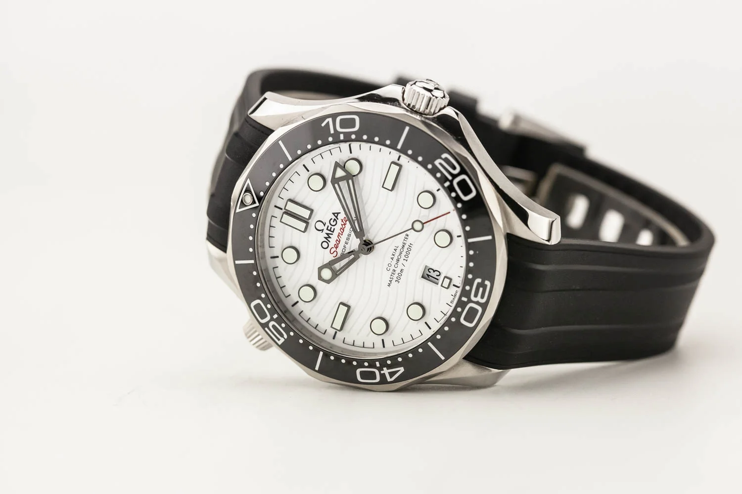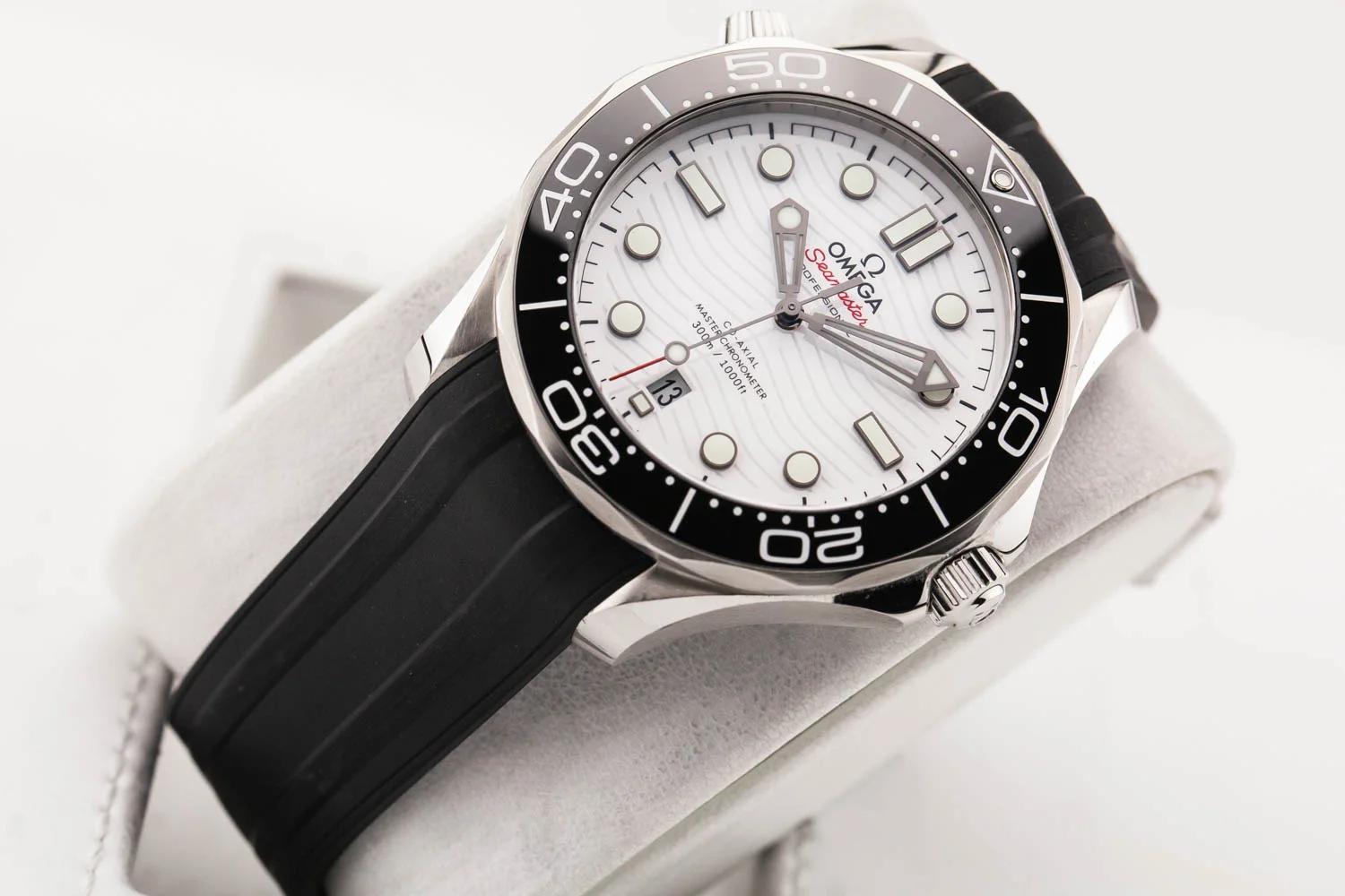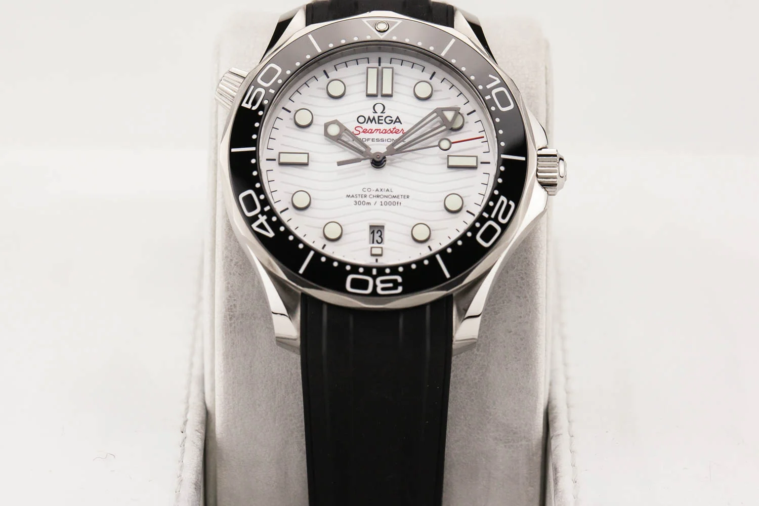·Up for sale is an excellent condition Omega Seamaster 300 White Wave Dial on Rubber Strap, ref # 210.32.42.20.04.001 It comes with all boxes, papers, booklets, and Omega Warranty Card dated August 2021.