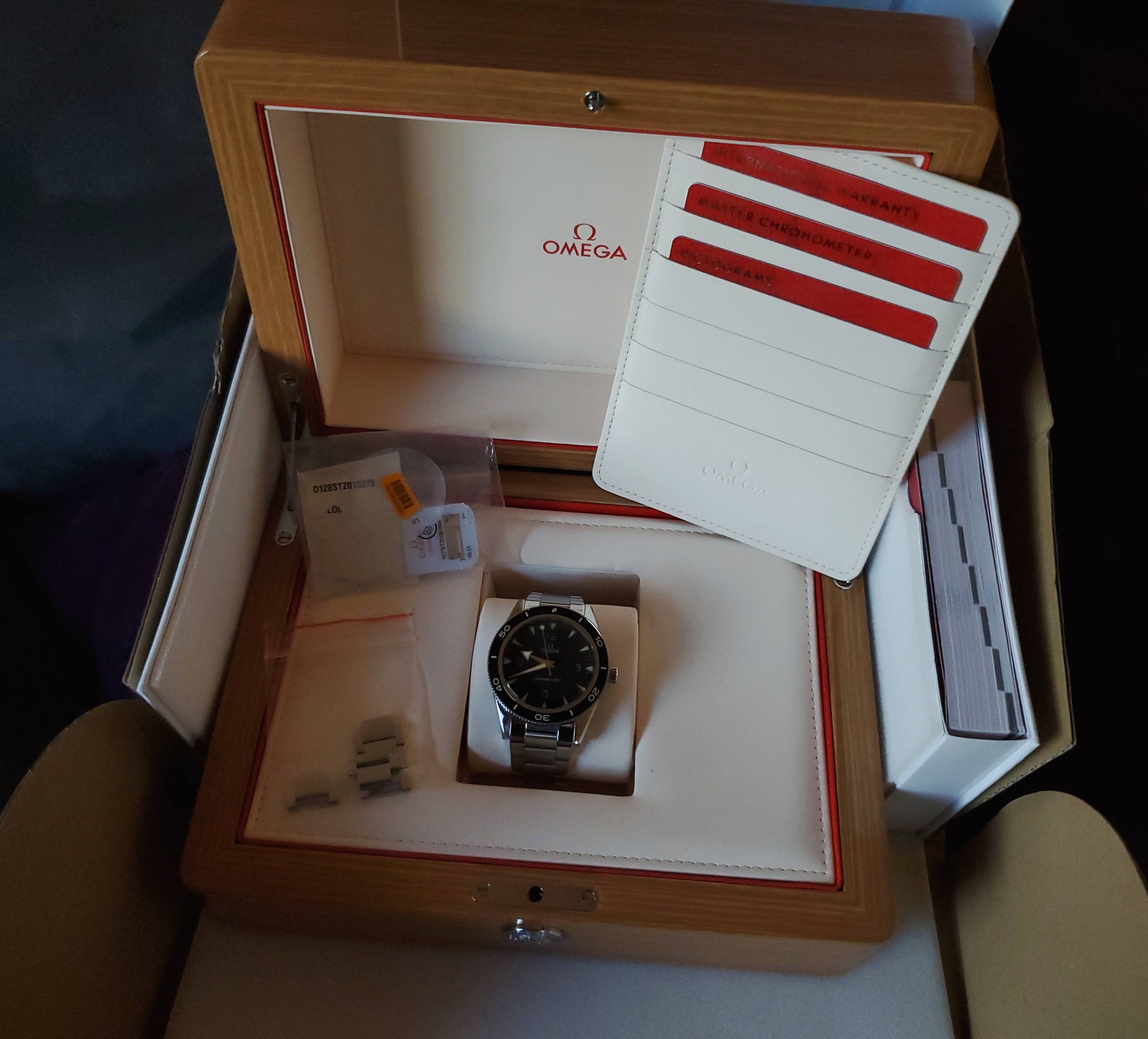 Watch, spare links + bonus of extra Omega OEM link pins & screws, cards/sleeve, display box, inner & outer boxes -- it's all there and it's ready to roll out on your wrist for all the great adventures of life: dinner at Howard Johnson's, a trip to the hardware store, bargain hunting at TJ Maxx, week's vacay at Sea World or even a hard day's shopping at Amazon... it can handle all that and more.