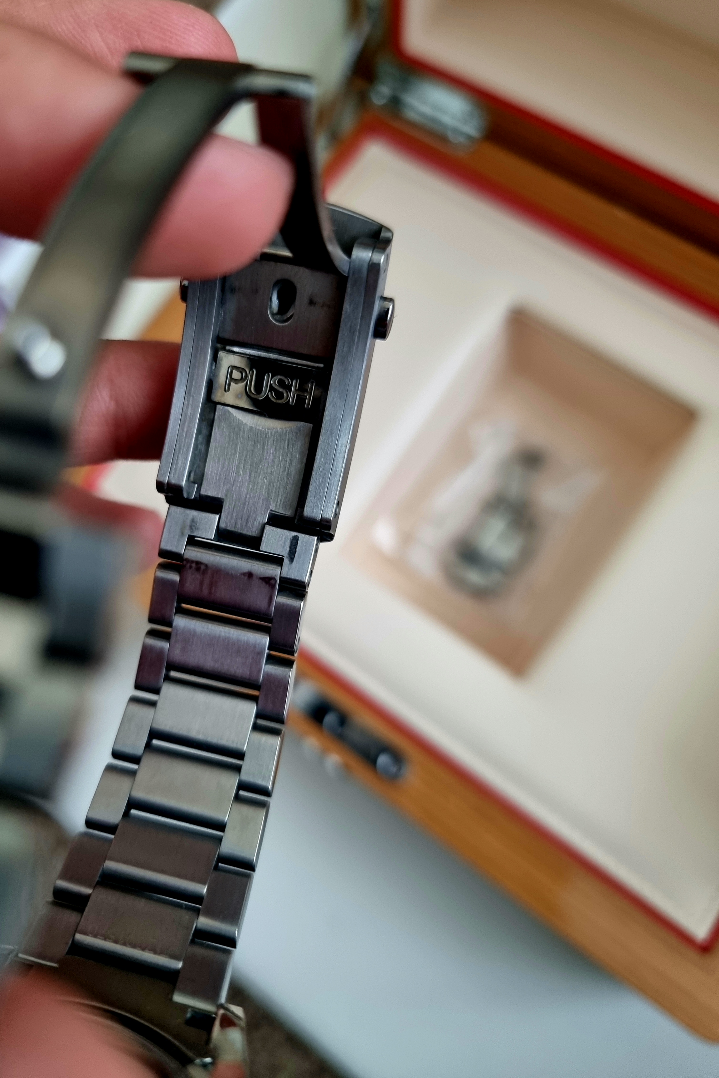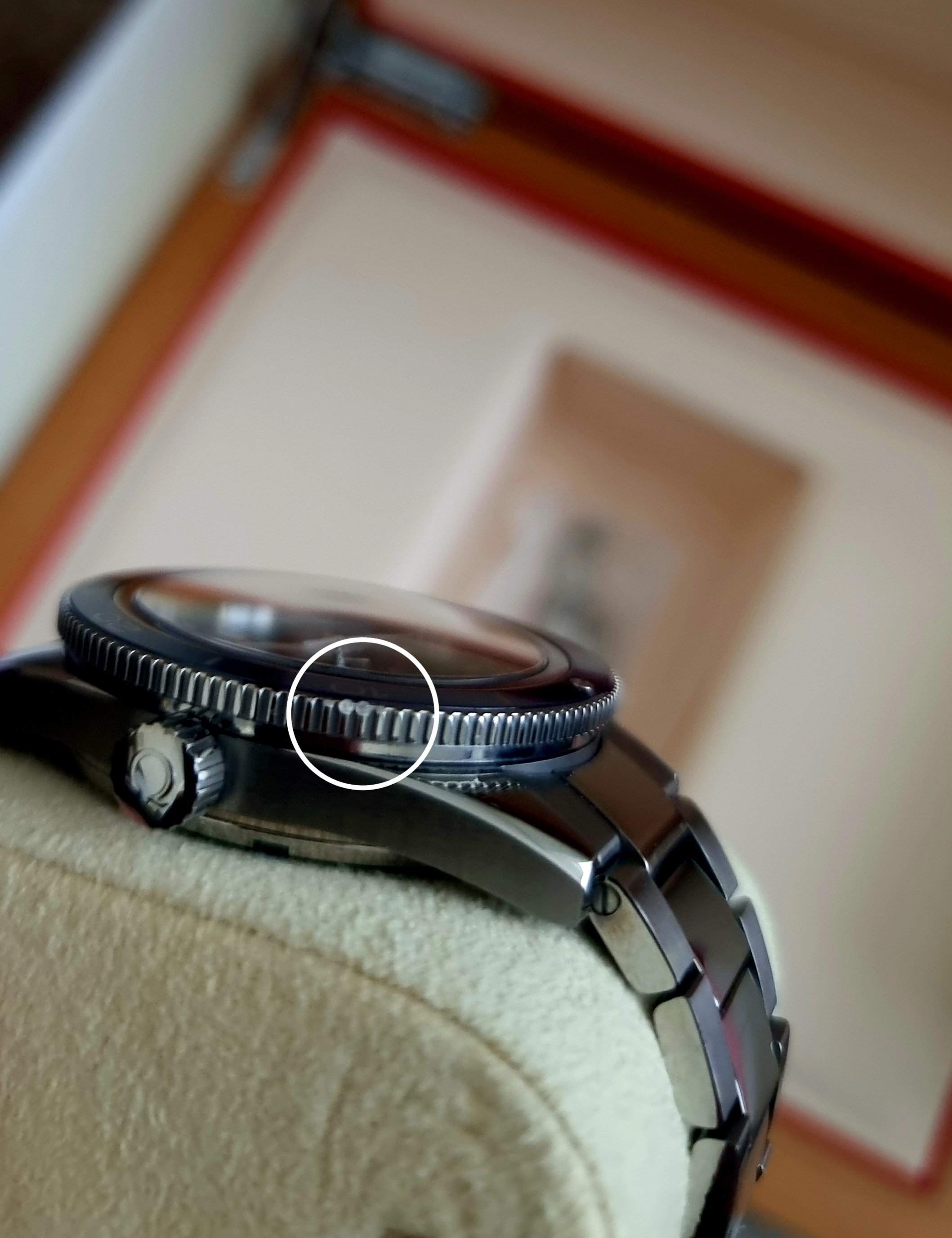 However there are a couple of dings, one on the very edge of the top link of the bracelet & on the coin edge of the bezel, where two of the knurls have been dinged in; please do refer to the photos in regards to these.