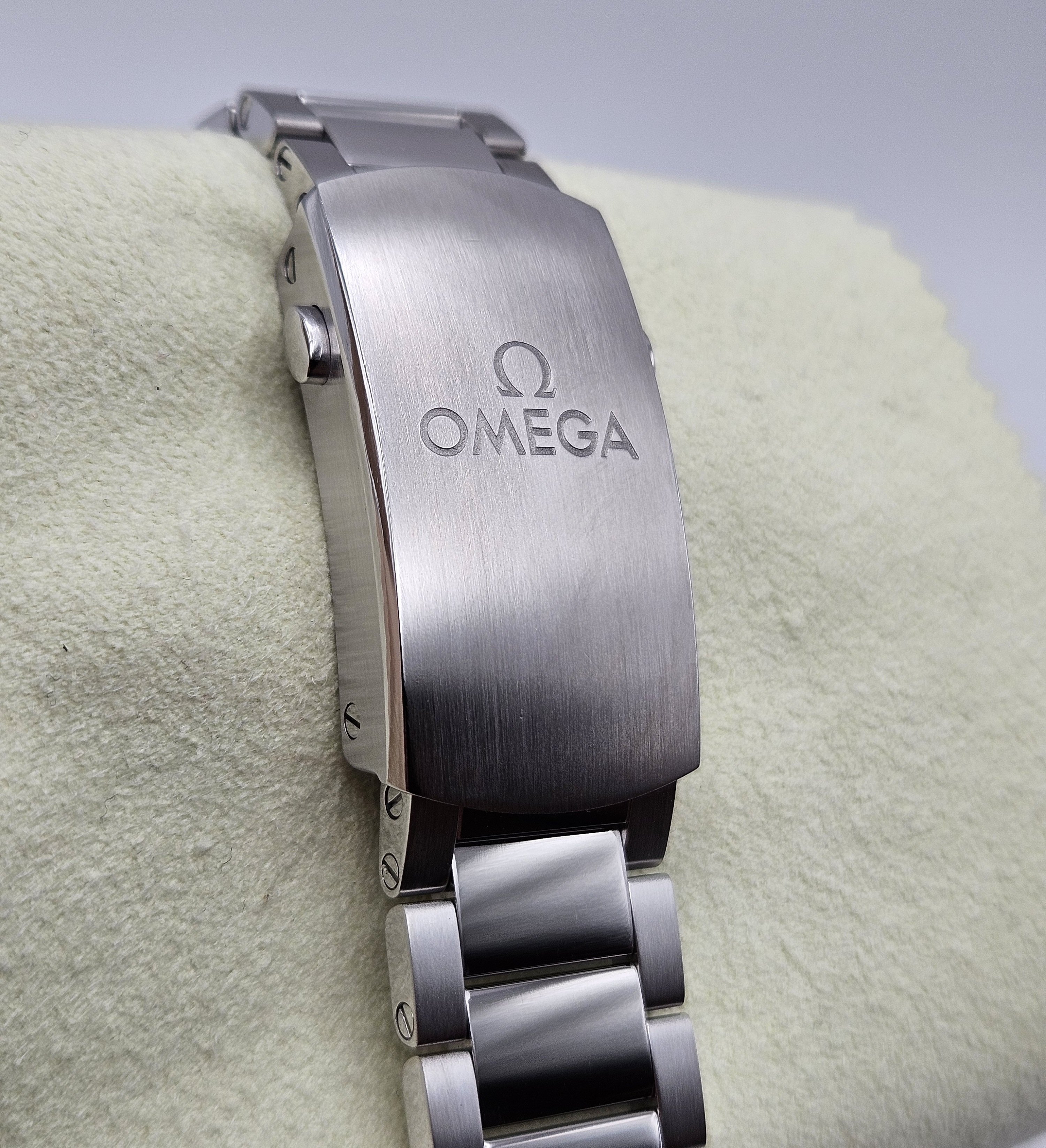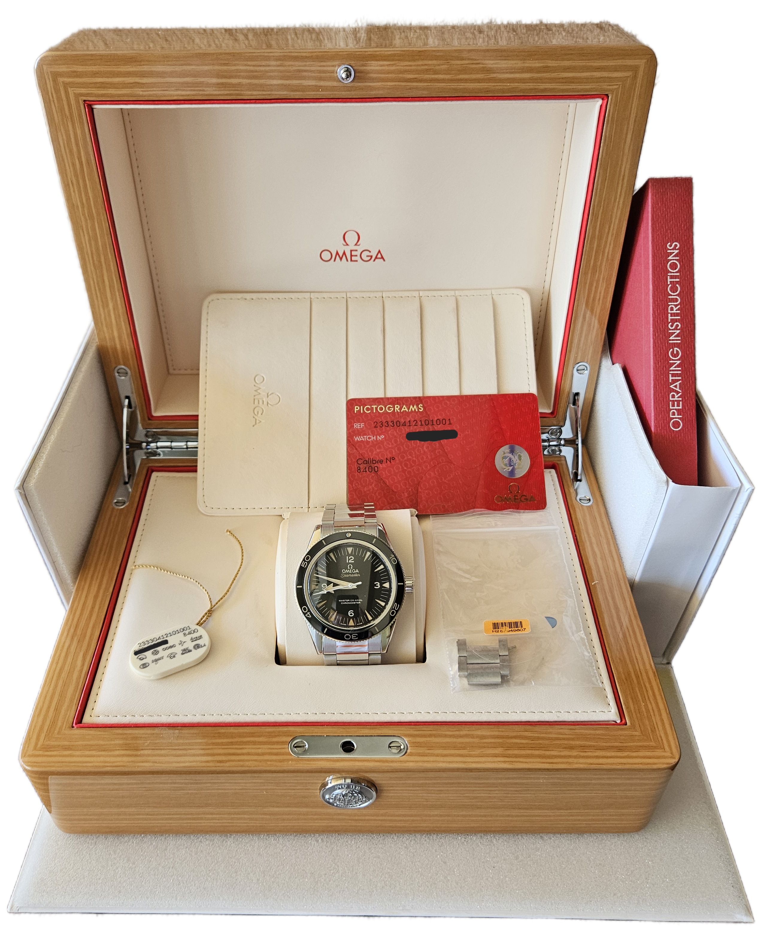 Box & Cards: white outer cardboard Omega box, lacquer wood presentation box & watch pillow, white serialized hangtag, pictogram card, operating instructions/booklet, and Omega microfiber pouch