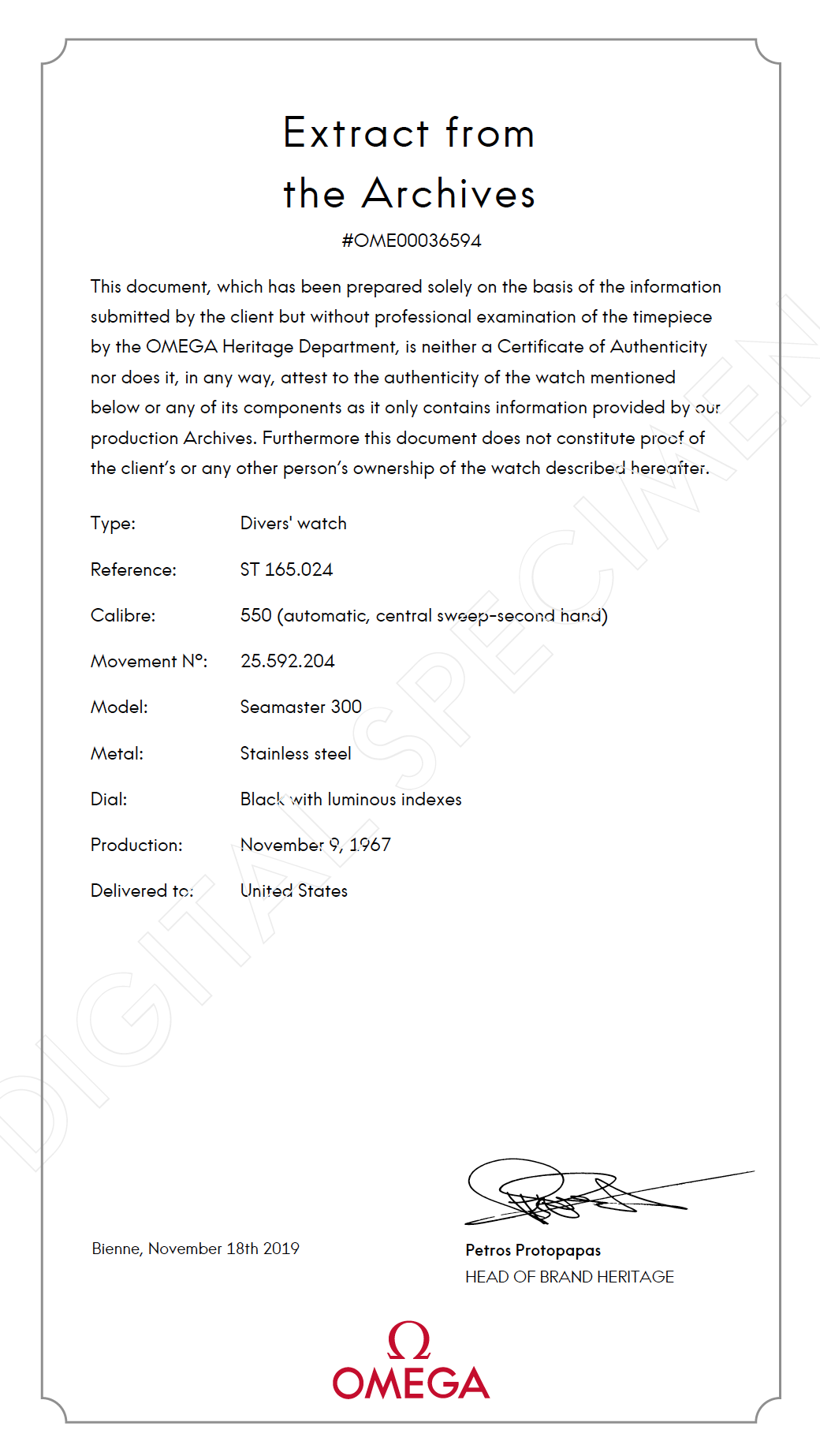 ·For sale, I have an Omega Seamaster 300 reference 165.024. Equipped with the Omega 550 Calibre Movement. The case measures 41mm without the crown. The watch is working extremely well and all functions are working properly as they should. The watch was serviced in December 2019 by our very own Mr. Archer and a 93-page service record with pictures is available.