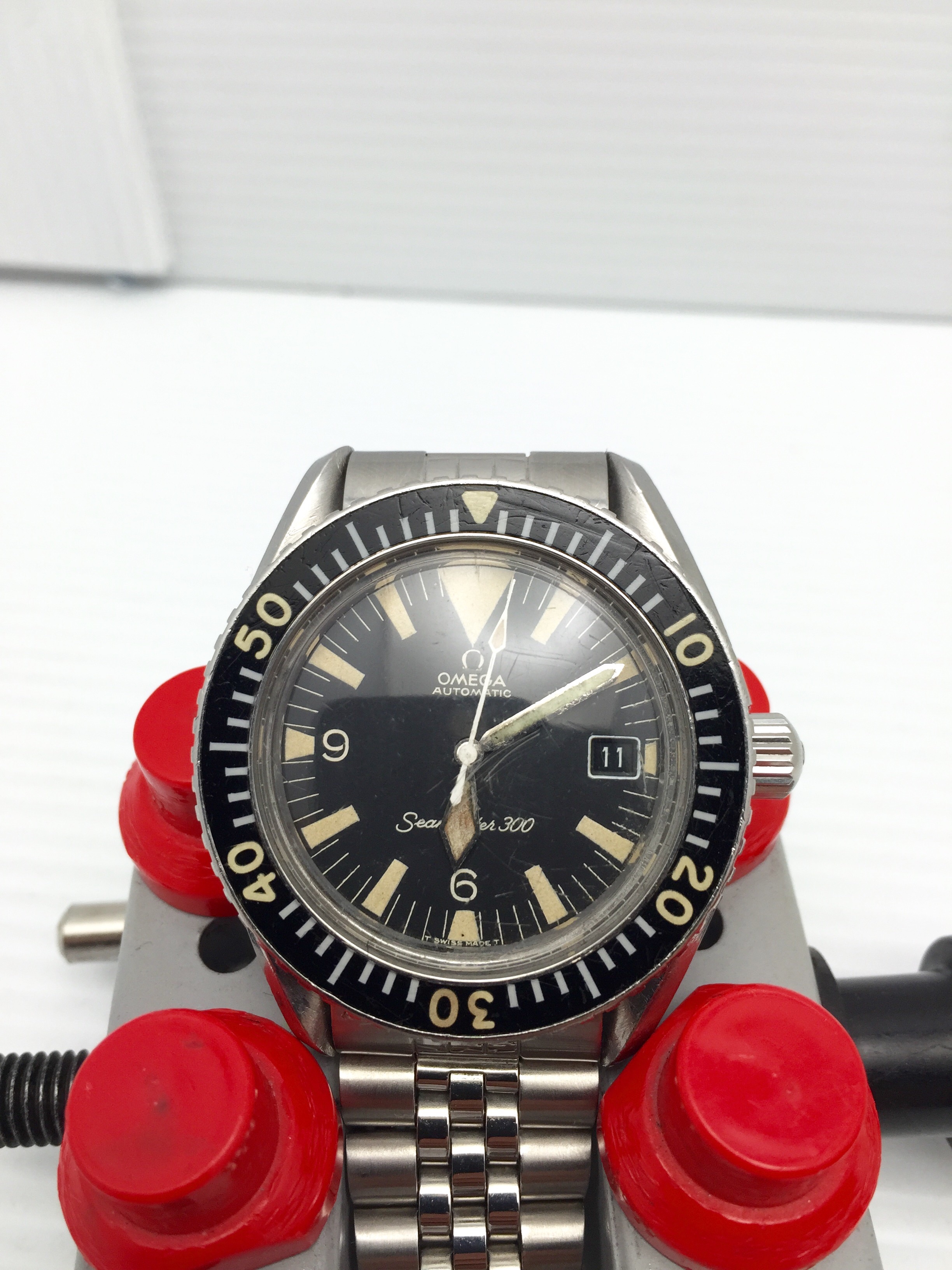 I have an Omega Seamaster 300m 166.024 Big Triangle. All parts have been checked to be 100% Original with nothing replaced with very small traces corrosion or pitting. Minute hand was relumed at some point a while ago the rest are original. Just serviced and left unpolished as you can tell the case is worn but still thick.
