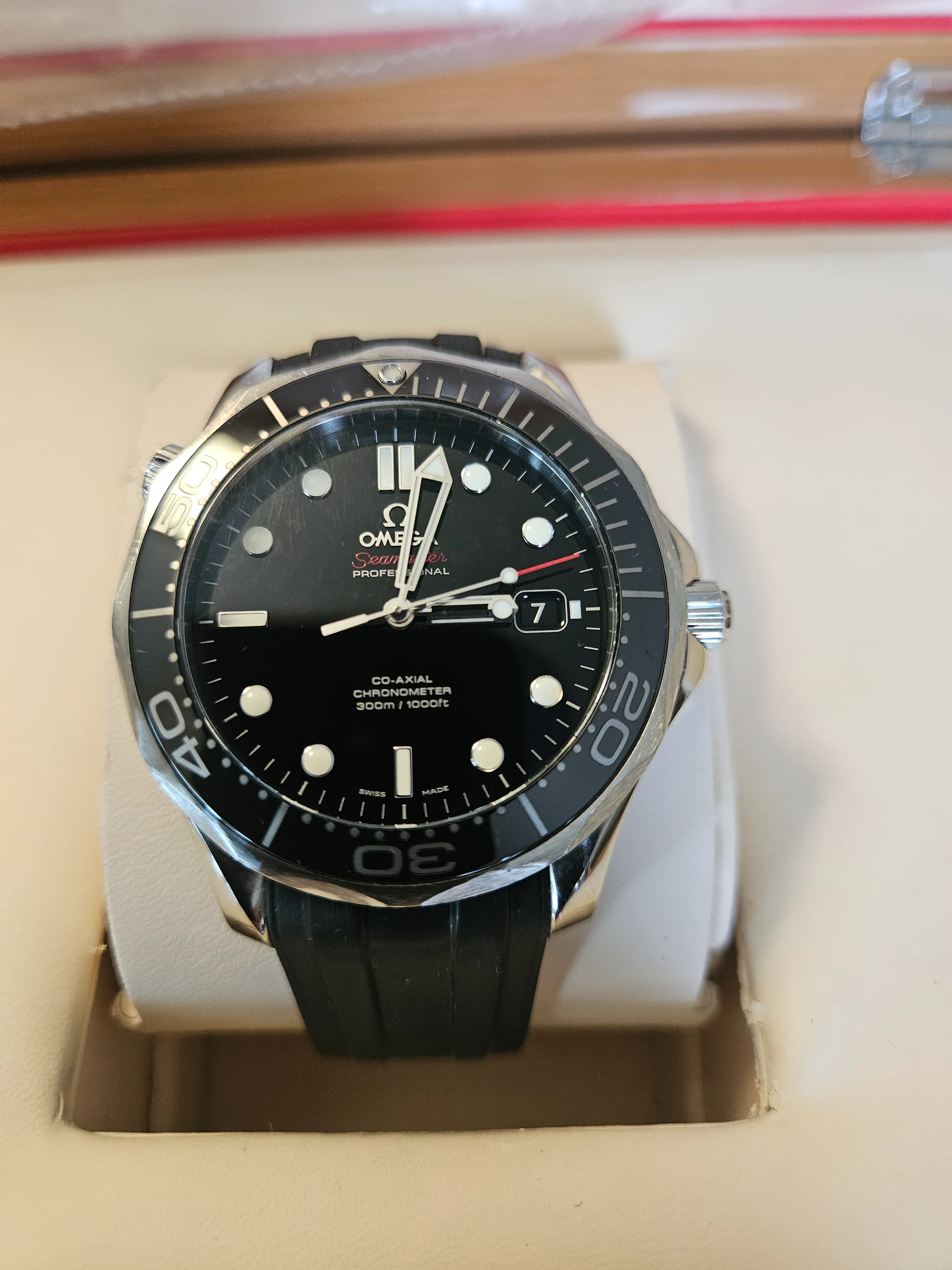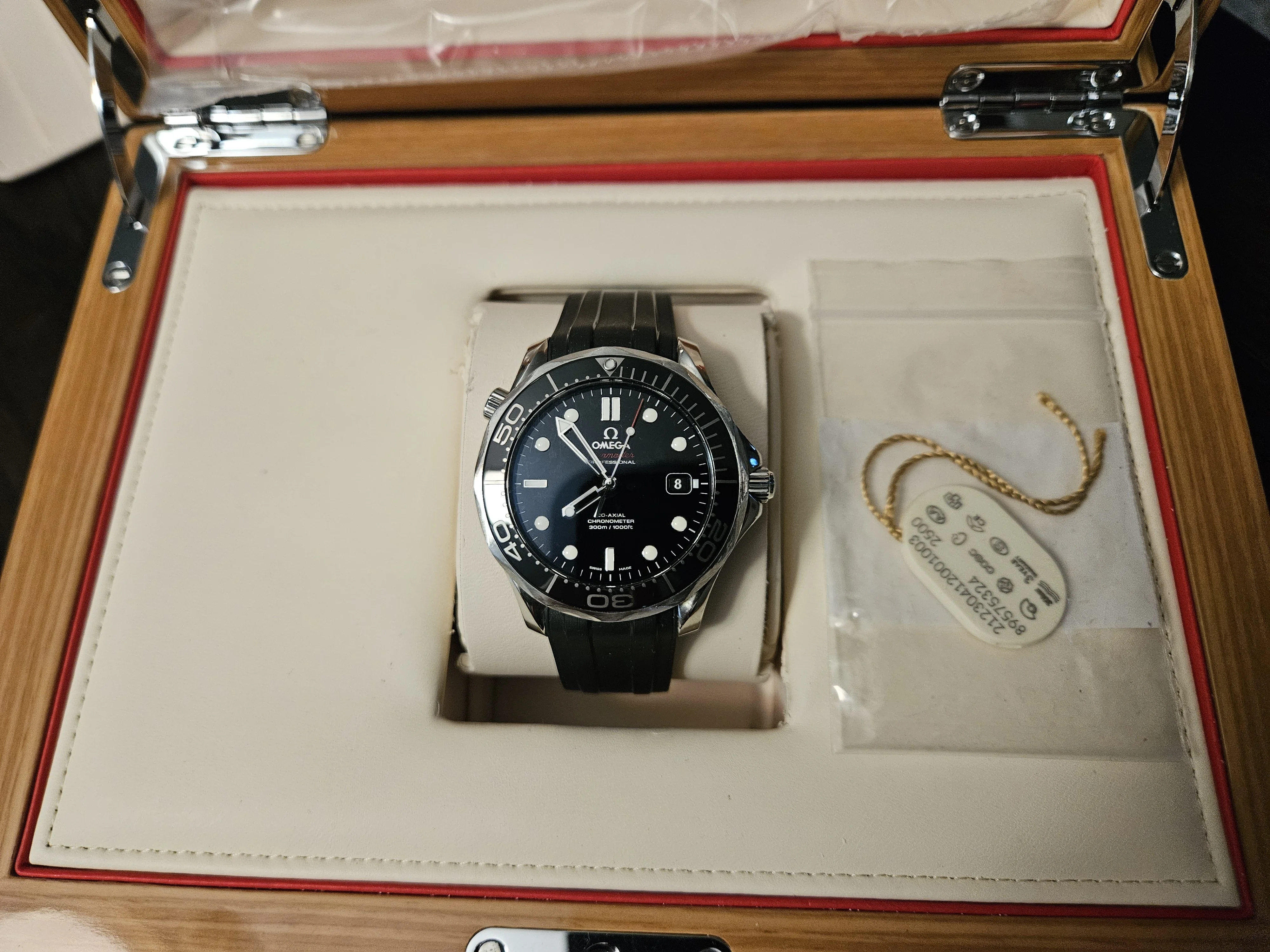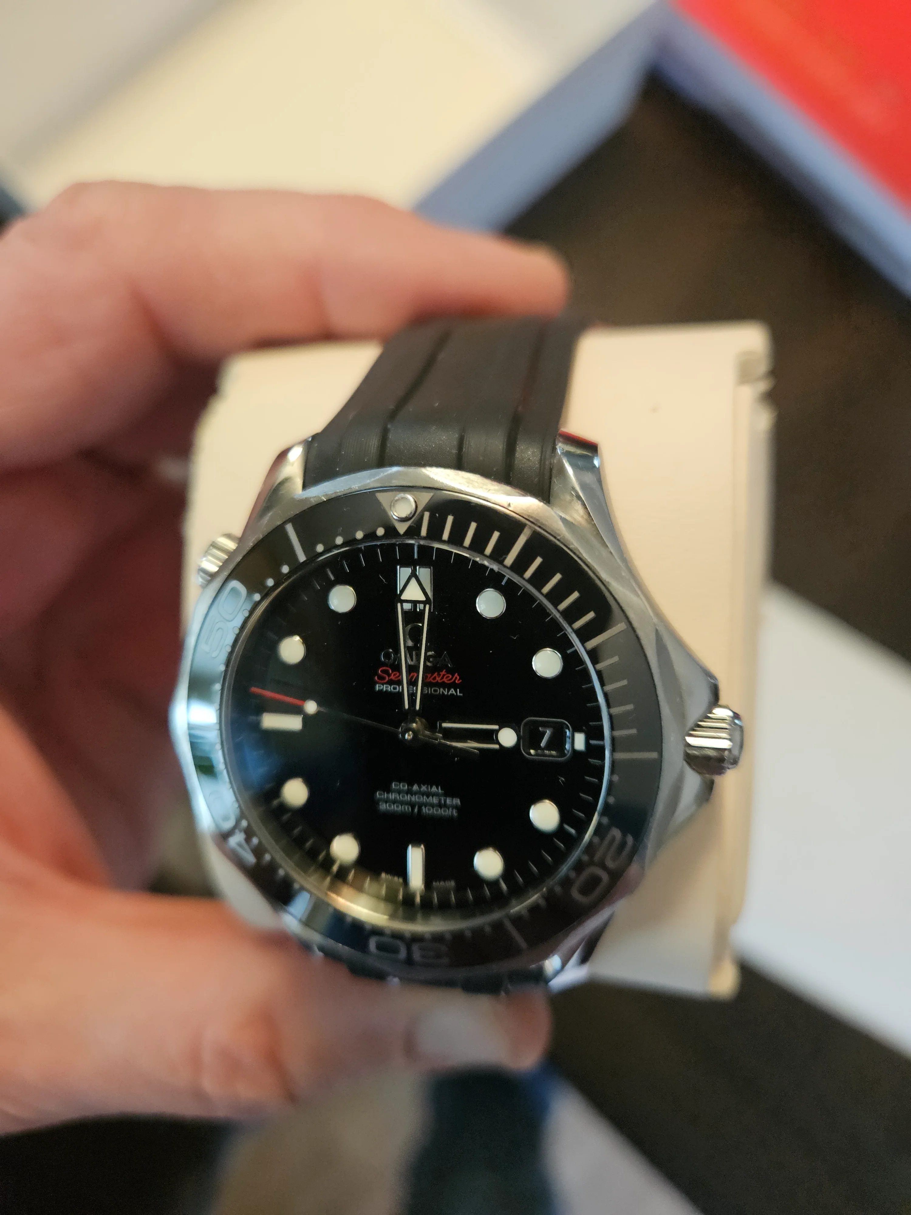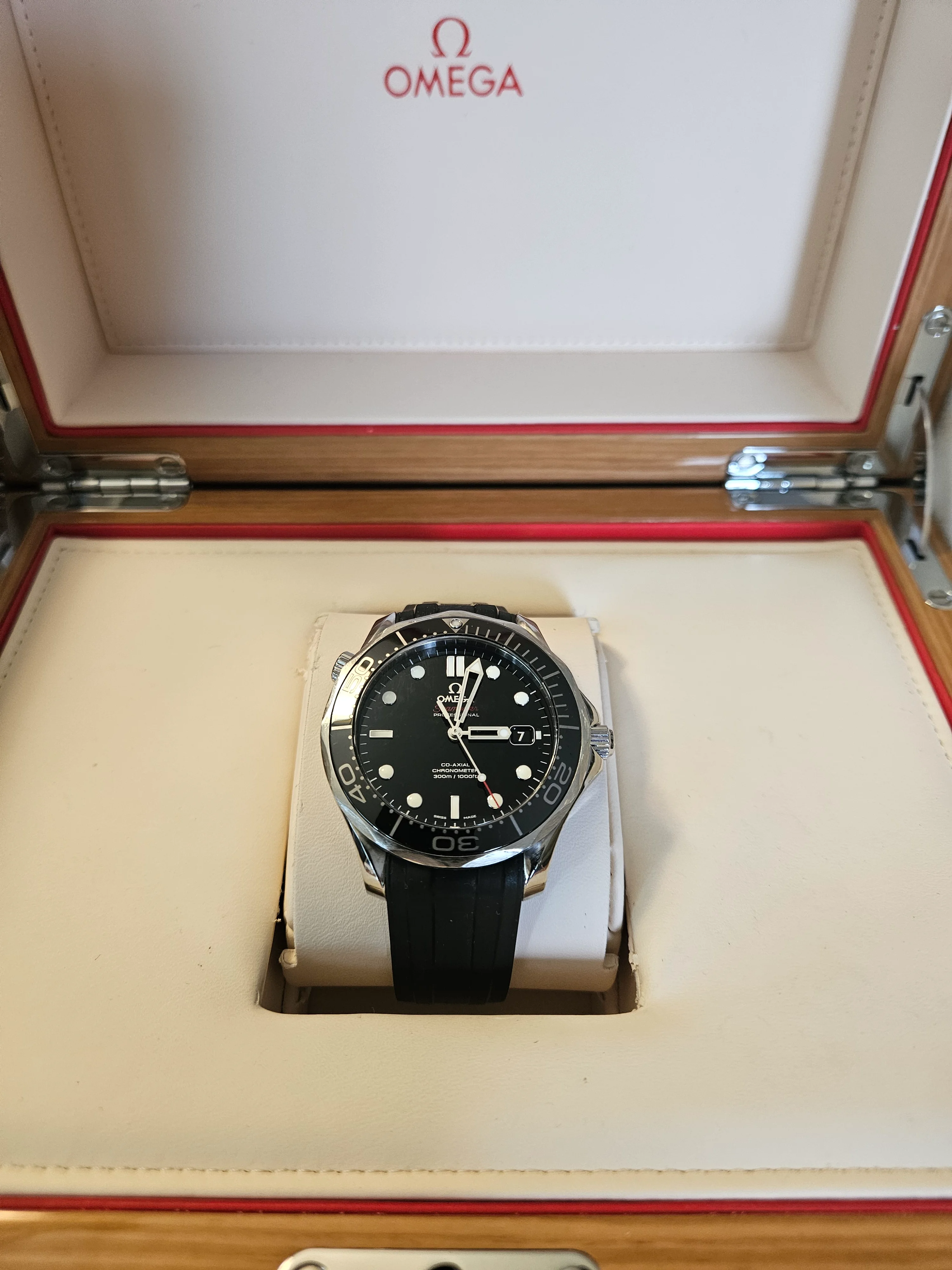 ·For sale Seamaster 300 41mm .Watch is in Very good / Excellent condition . Everything functions as it should - no issues . There are a couple of very small nicks on the bezel as shown in the pics . The rubber strap is not original Omega - the deployment buckle IS original Omega . Bracelet is in excellent condition as pictured . Wooden presentation case is excellent - outer white box has a few marks .