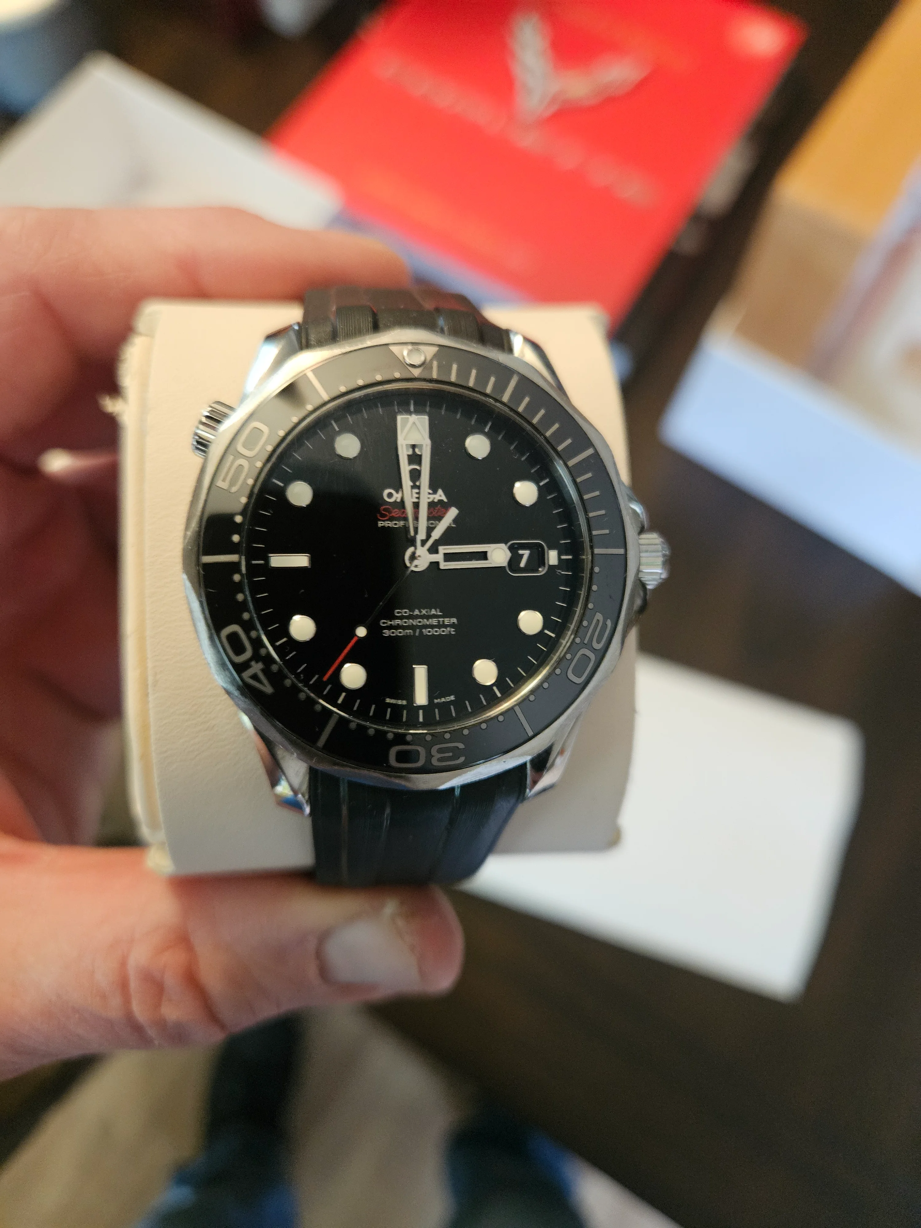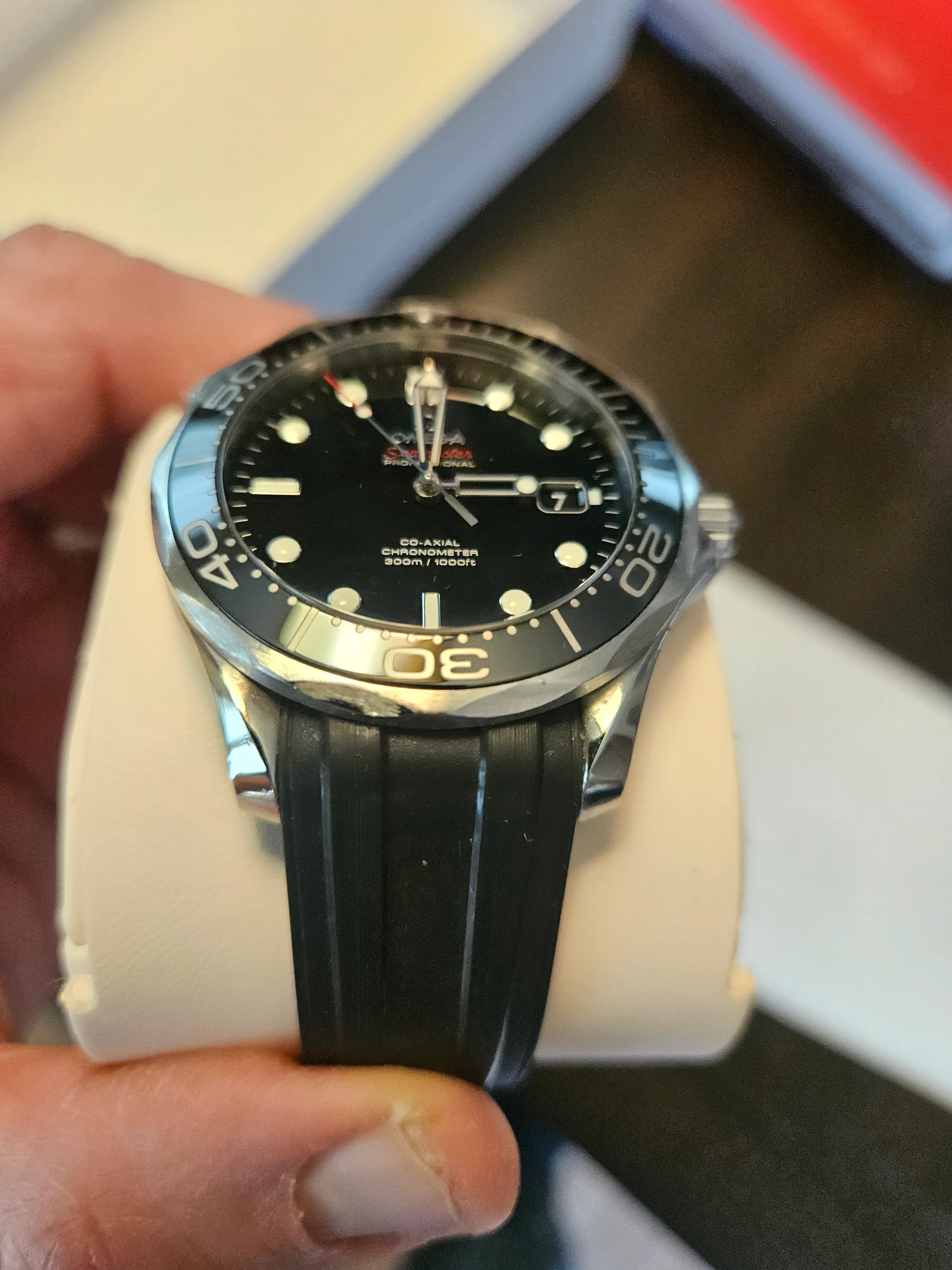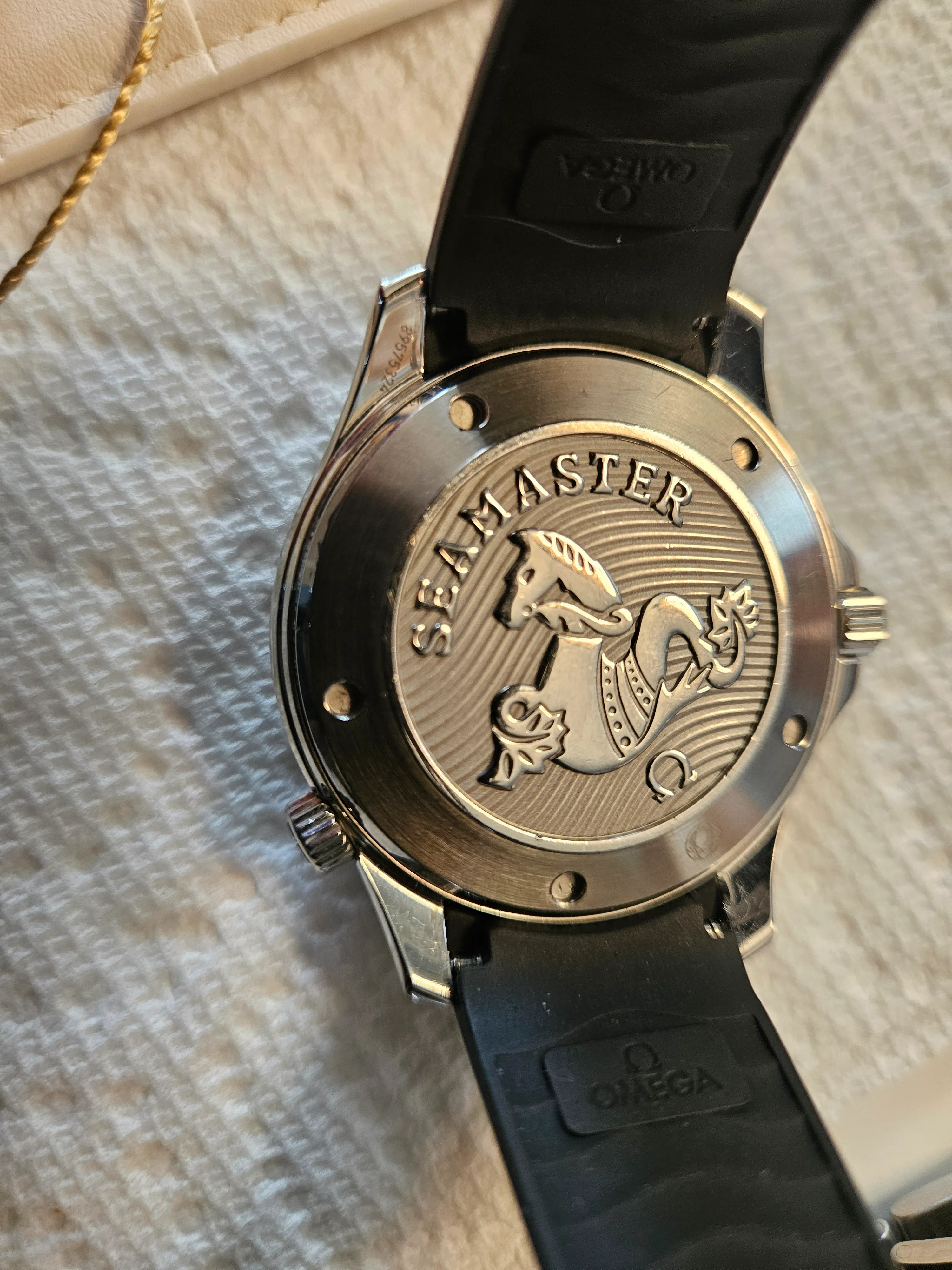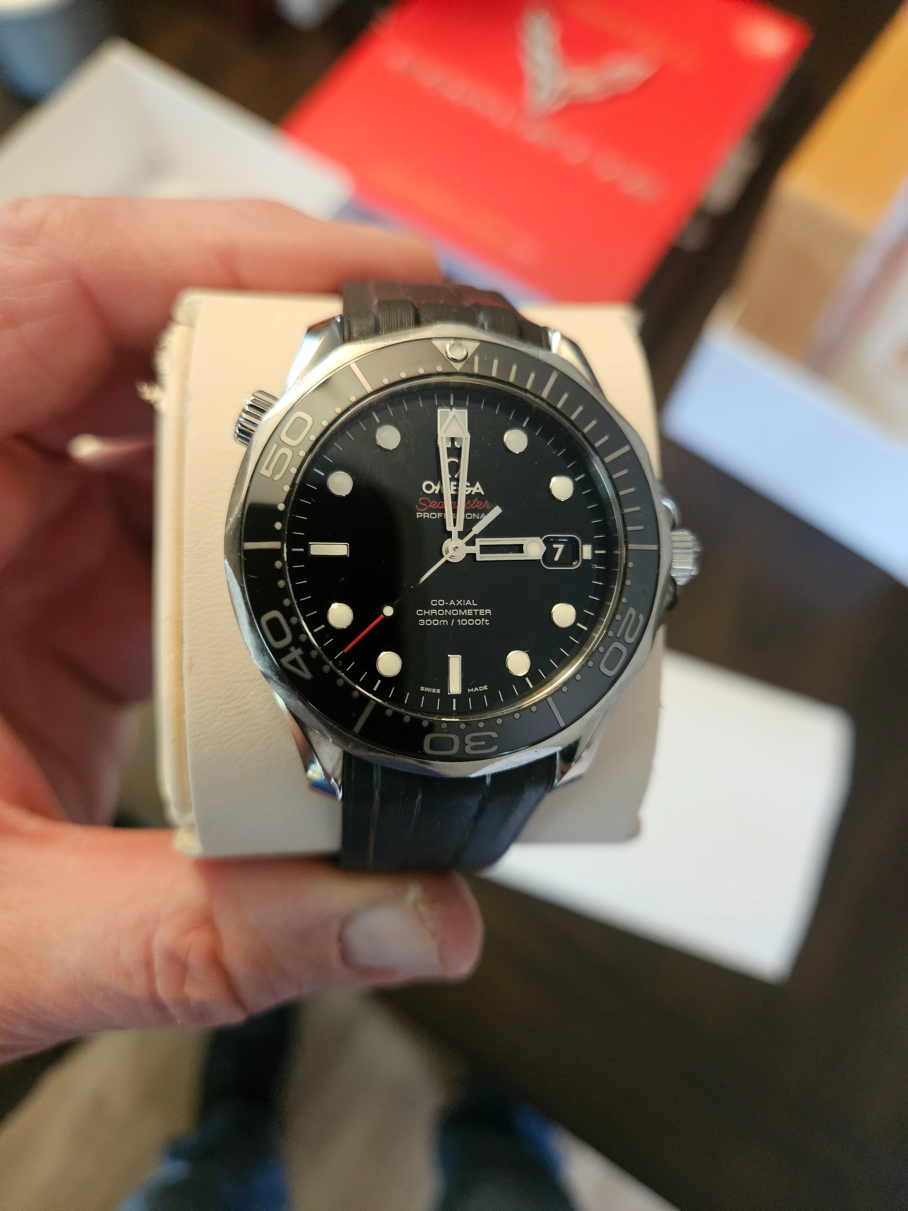 ·For sale Seamaster 300 41mm .Watch is in Very good / Excellent condition . Everything functions as it should - no issues . There are a couple of very small nicks on the bezel as shown in the pics . The rubber strap is not original Omega - the deployment buckle IS original Omega . Bracelet is in excellent condition as pictured . Wooden presentation case is excellent - outer white box has a few marks .