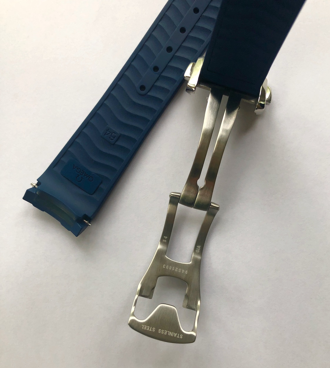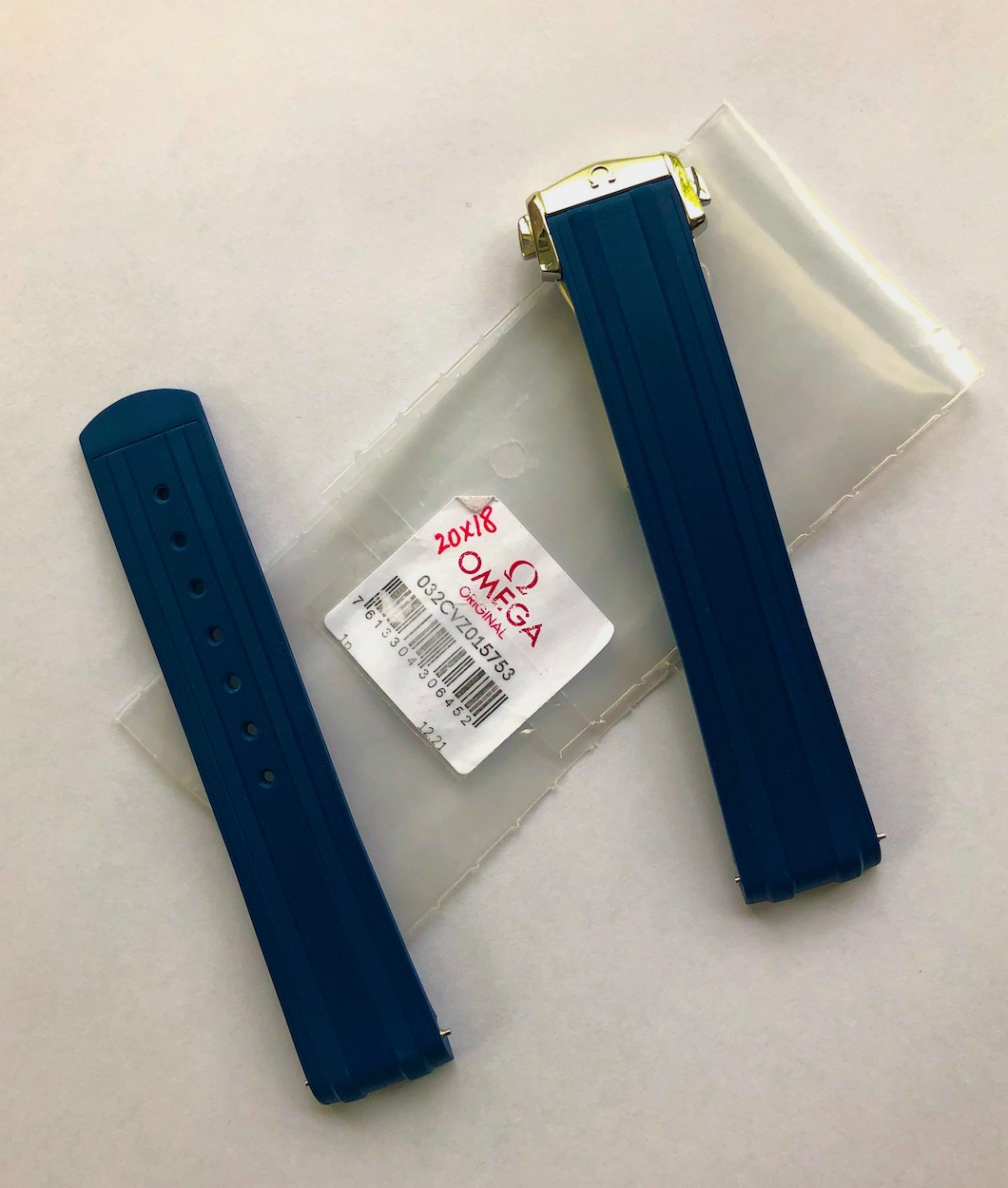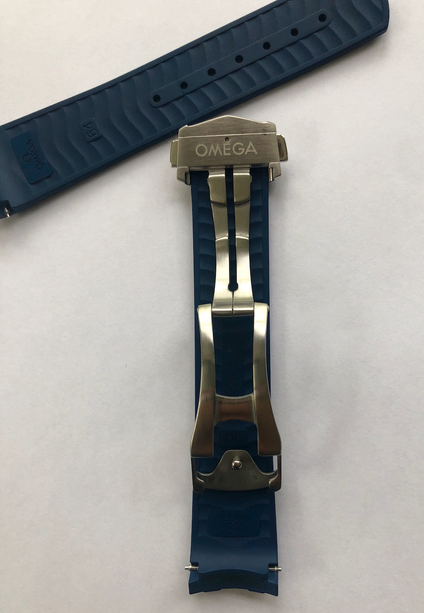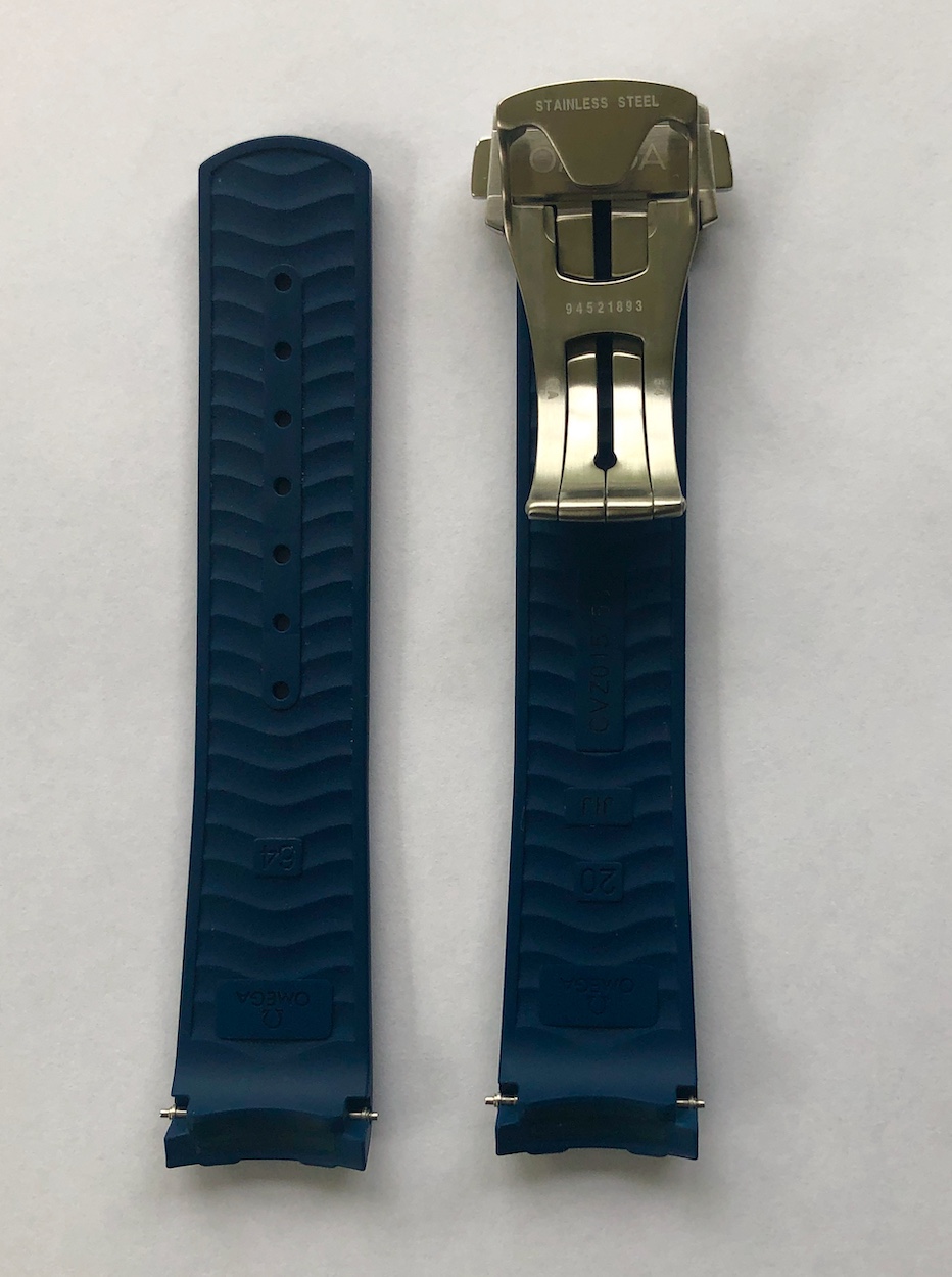 ·Selling this new Omega Seamaster 300M blue rubber strap with Omega deployant buckle (folding clasp) and Omega spring bars. This strap is for the newer style Seamaster 300M Diver with the ceramic bezel. It's standard length, 20mm lug side and 18mm buckle side. (Omega part # 032CVZ0115753). Strap is new/mint. I ordered the strap and buckle for a watch I no longer own, hence the sale.