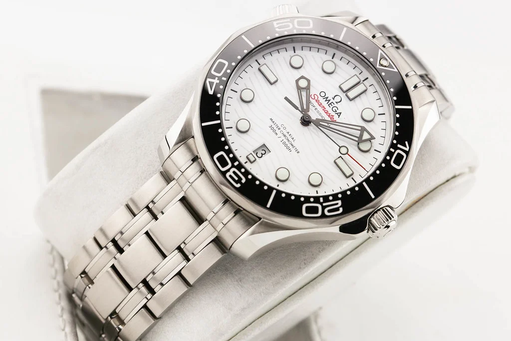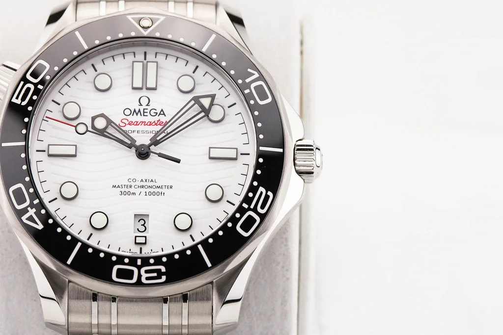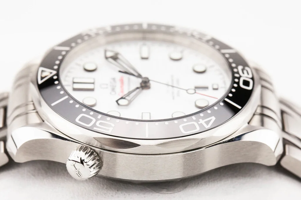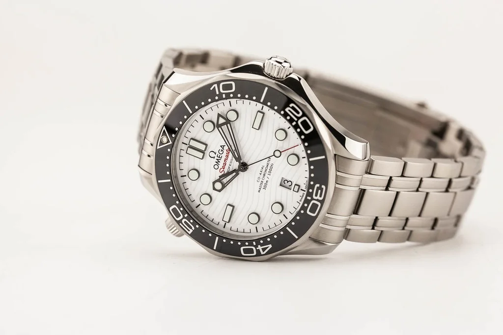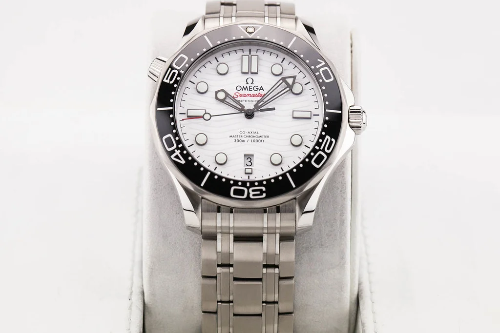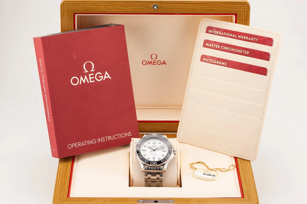 ·Up for sale is a mint condition Omega Seamaster 300 42mm 8800, White Dial / Black Bezel on Bracelet, reference # 210.30.42.20.04.001 It comes complete with all boxes, papers, booklets, hang tag and Omega Warranty Card dated November 2024.