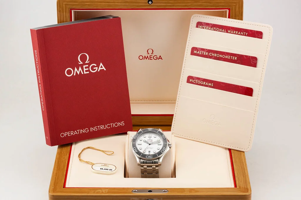 ·Up for sale is a brand new Omega Seamaster 300 42mm 8800, White Dial / Black Bezel on Bracelet, reference # 210.30.42.20.04.001 It comes complete with all boxes, papers, booklets, hang tag and Omega Warranty Card dated November 2024.