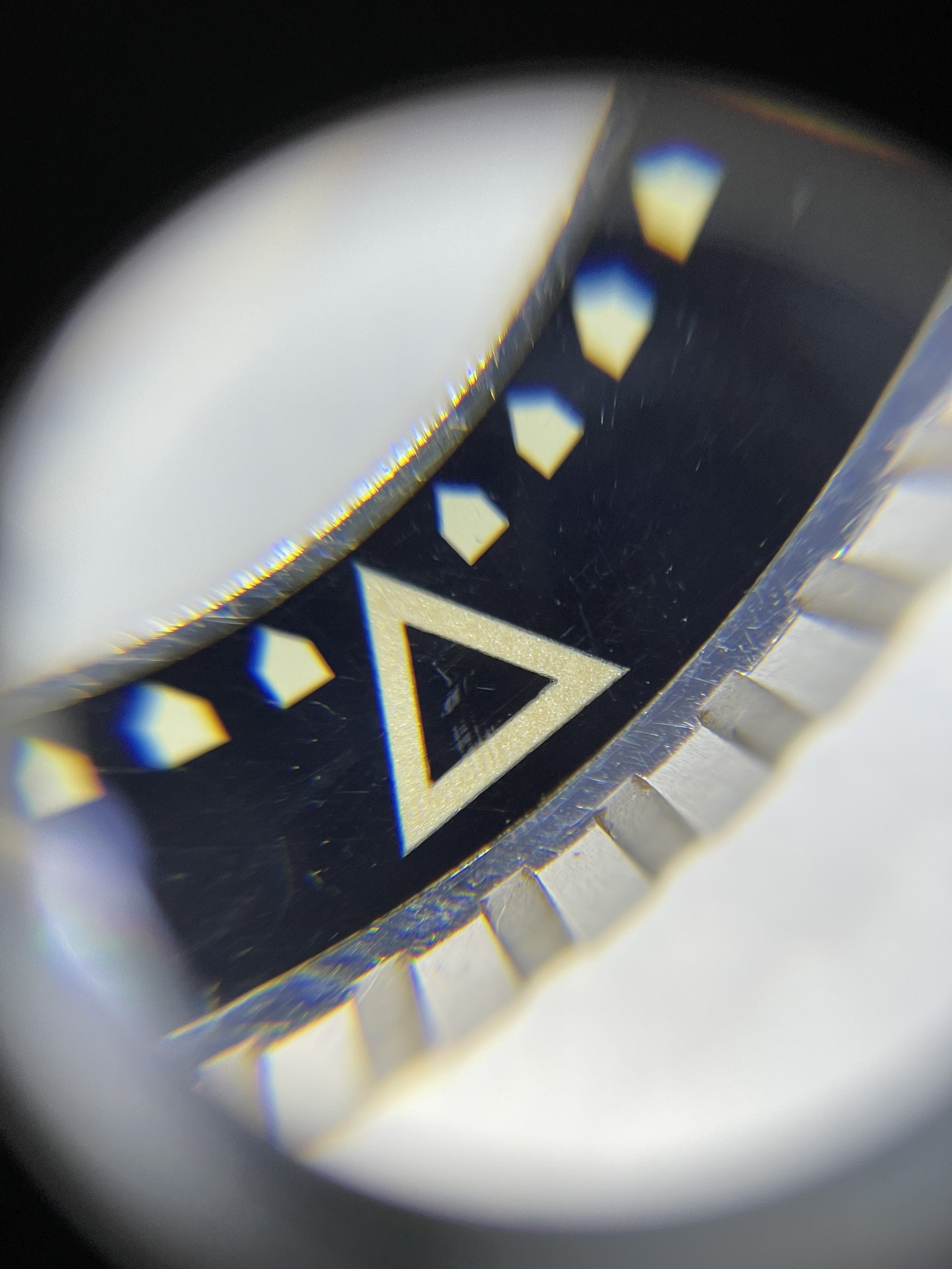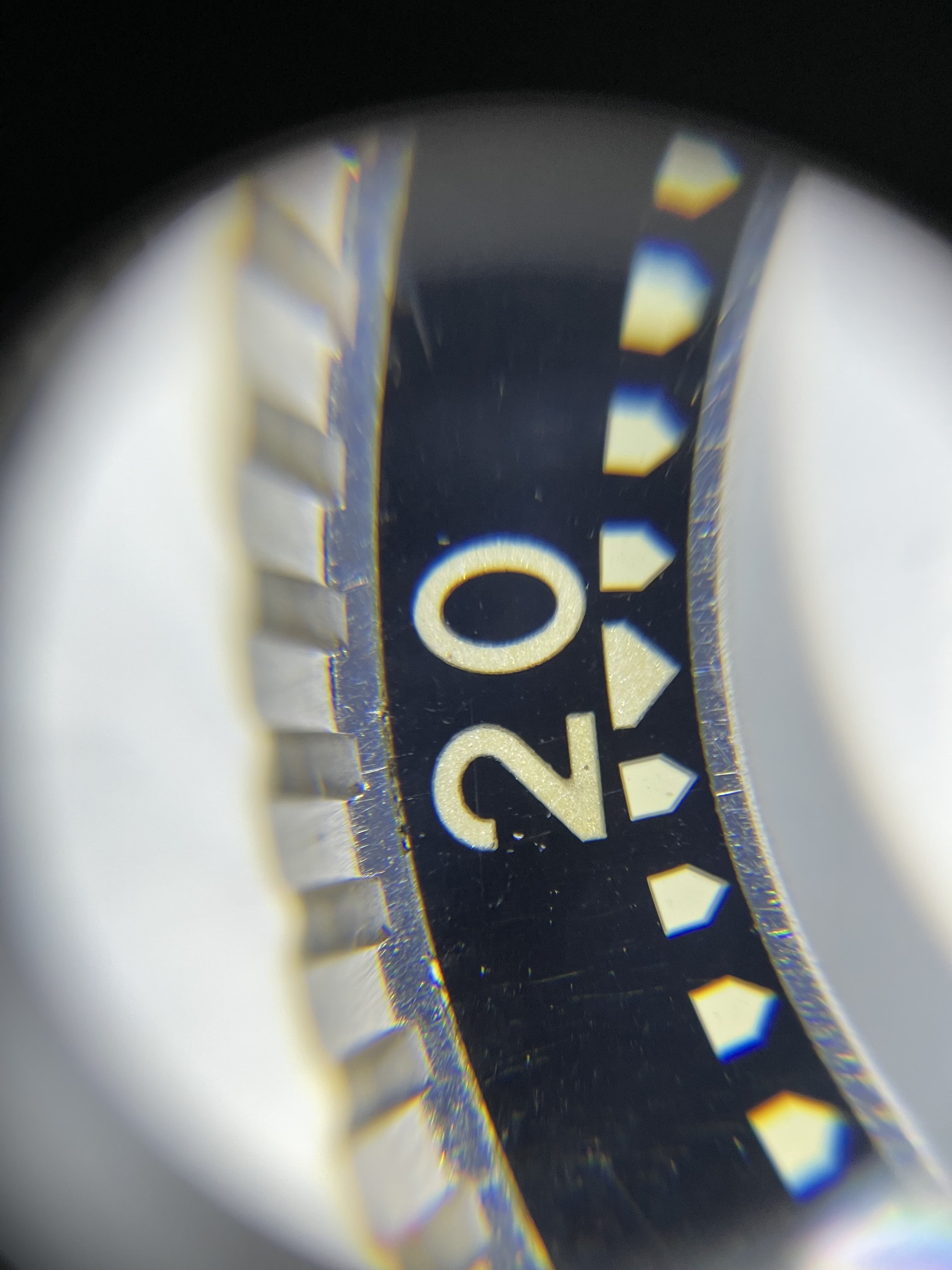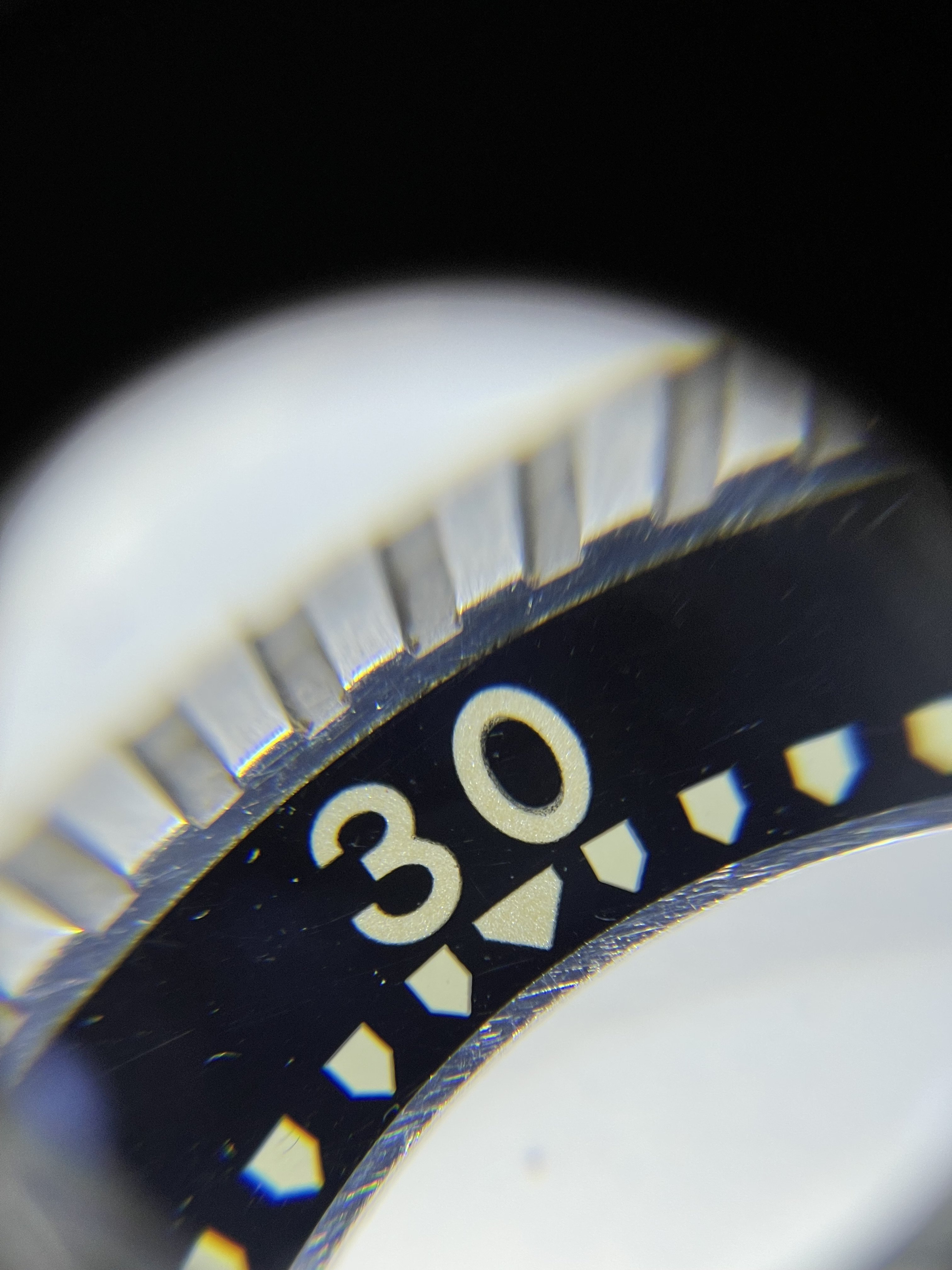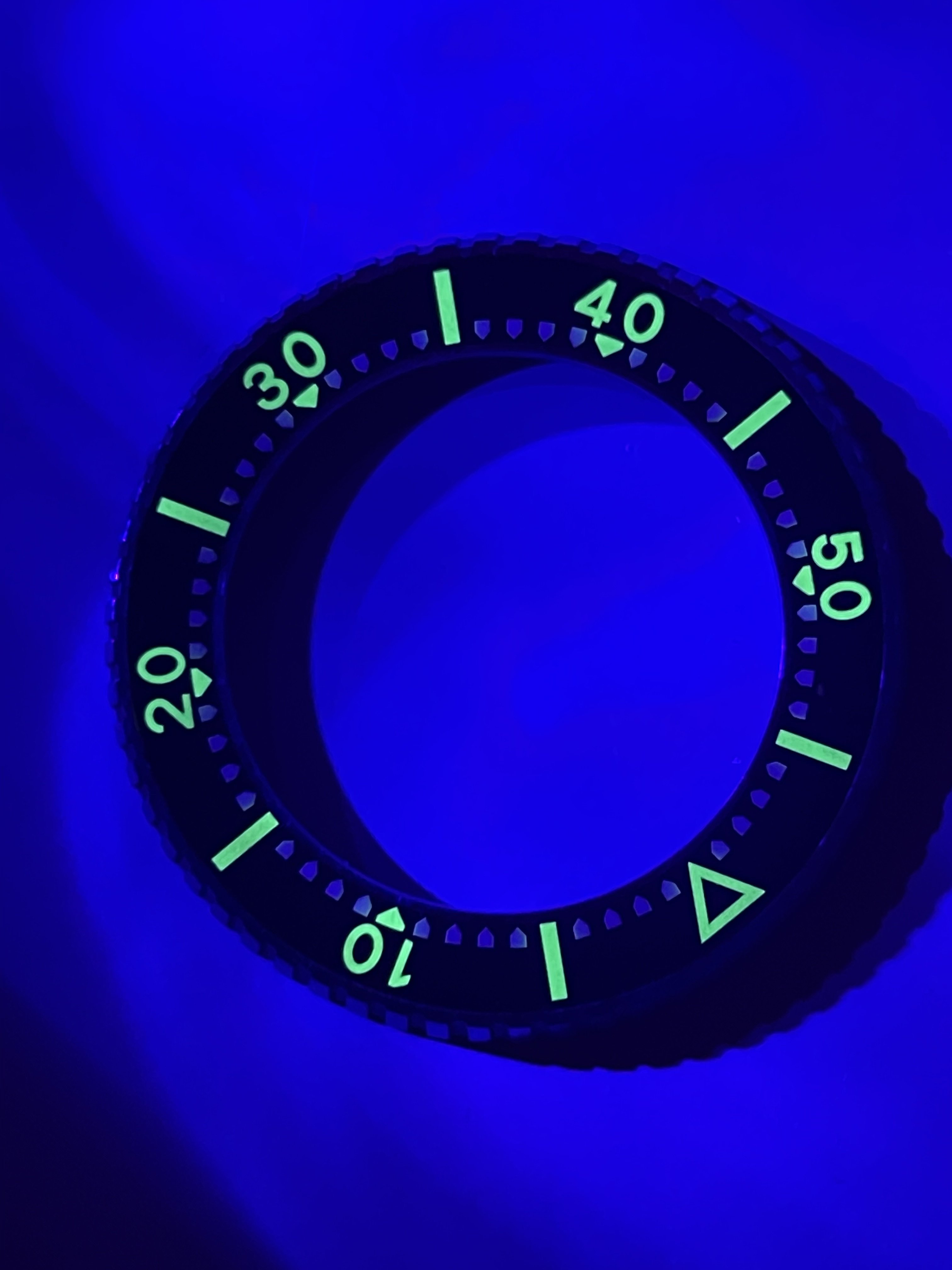 The bezel itself is in good condition. It has no cracks. After illuminating under UV the tritium fades within a few seconds (as it should).
