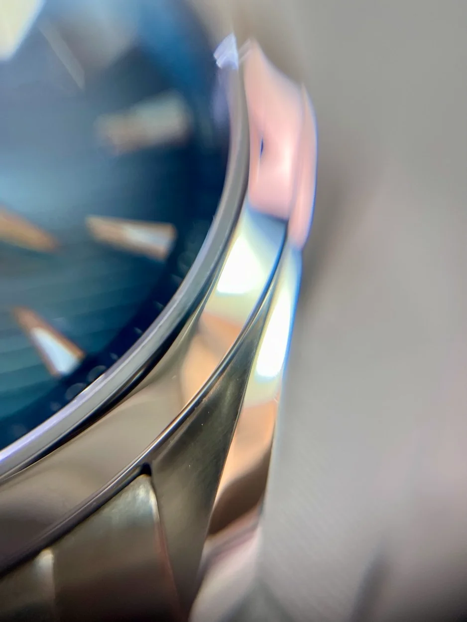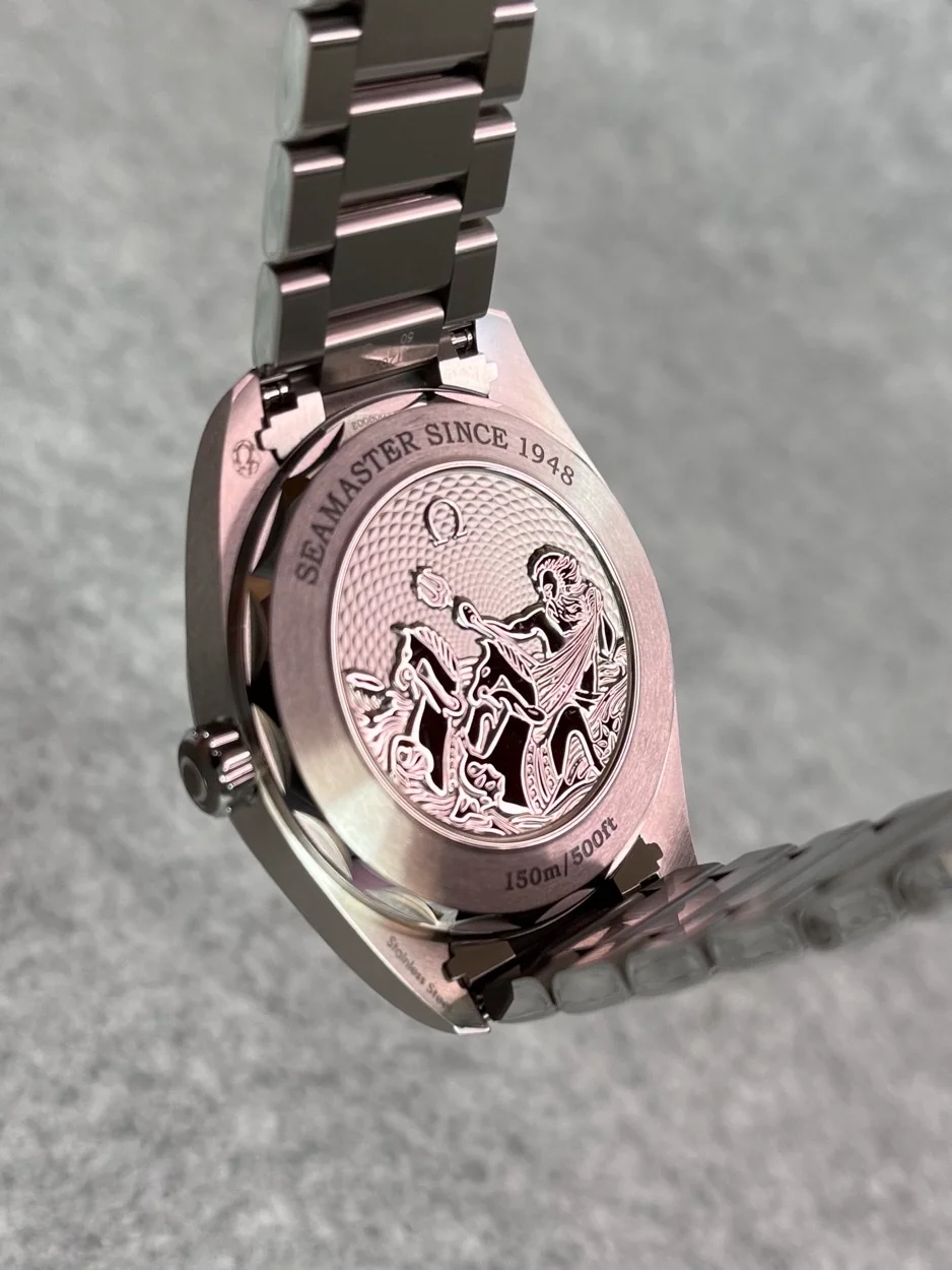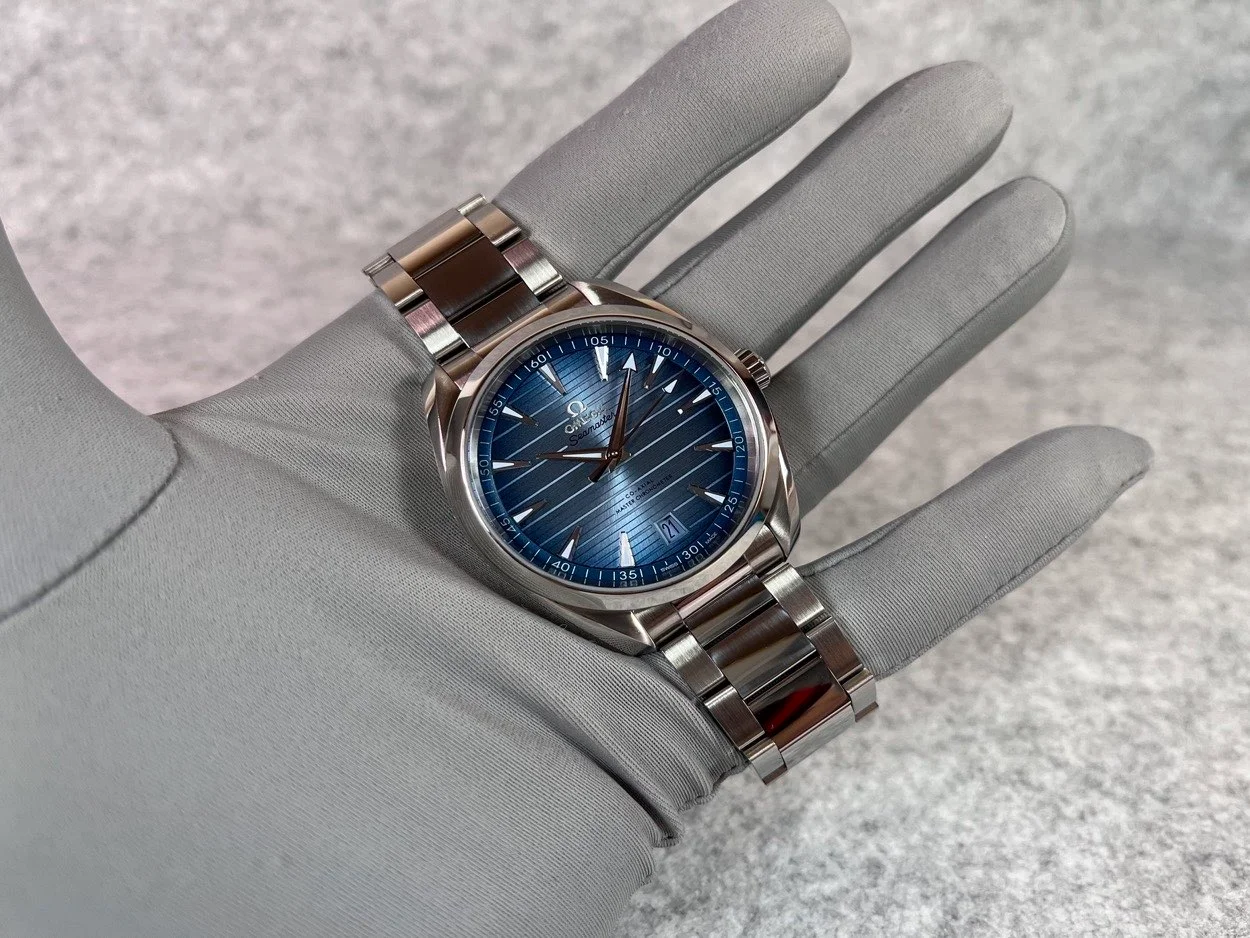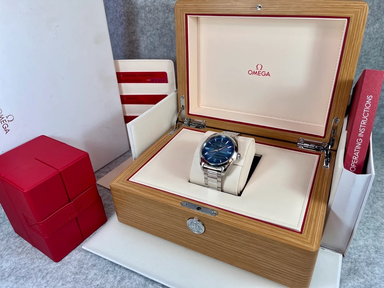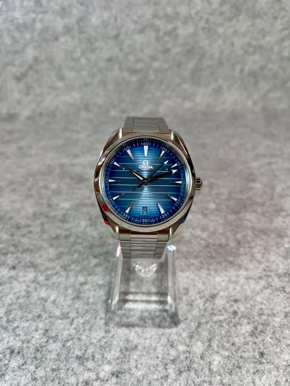 Up for sale is my 2024 Omega Seamaster Aqua Terra 150M “Summer Blue” (Ref. 220.10.41.21.03.005). Asking £4,499 OBO. This watch has an Omega Boutique retail price of £6,200 Purchased from an AD in 2024. The watch is in excellent cosmetic and mechanical condition—worn only a few times and always stored properly. The teak pattern dial, in OMEGA’s own Summer Blue, is sun-brushed, PVD-treated, and varnished with a gradient finish to reflect the watch’s level of water resistance. It has rhodium-plated hands and indexes filled with a unique light blue Super-LumiNova and a matching blue date window indicator at 6 o’clock. Turning the watch over reveals a stamped commemorative Seamaster logo depicting a trident-bearing Poseidon and two seahorses: OMEGA’s 1956 original and the brand’s current design.