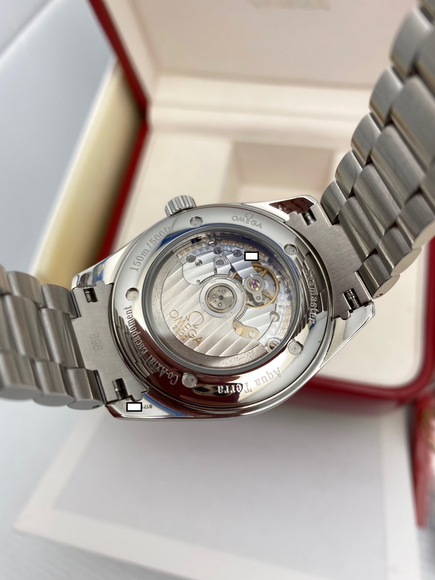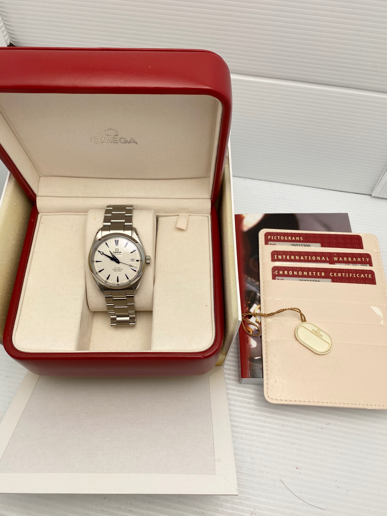 Accessories: Both Omega boxes, manual, card holder, warranty card, pictogram card, chronometer card, serial tag