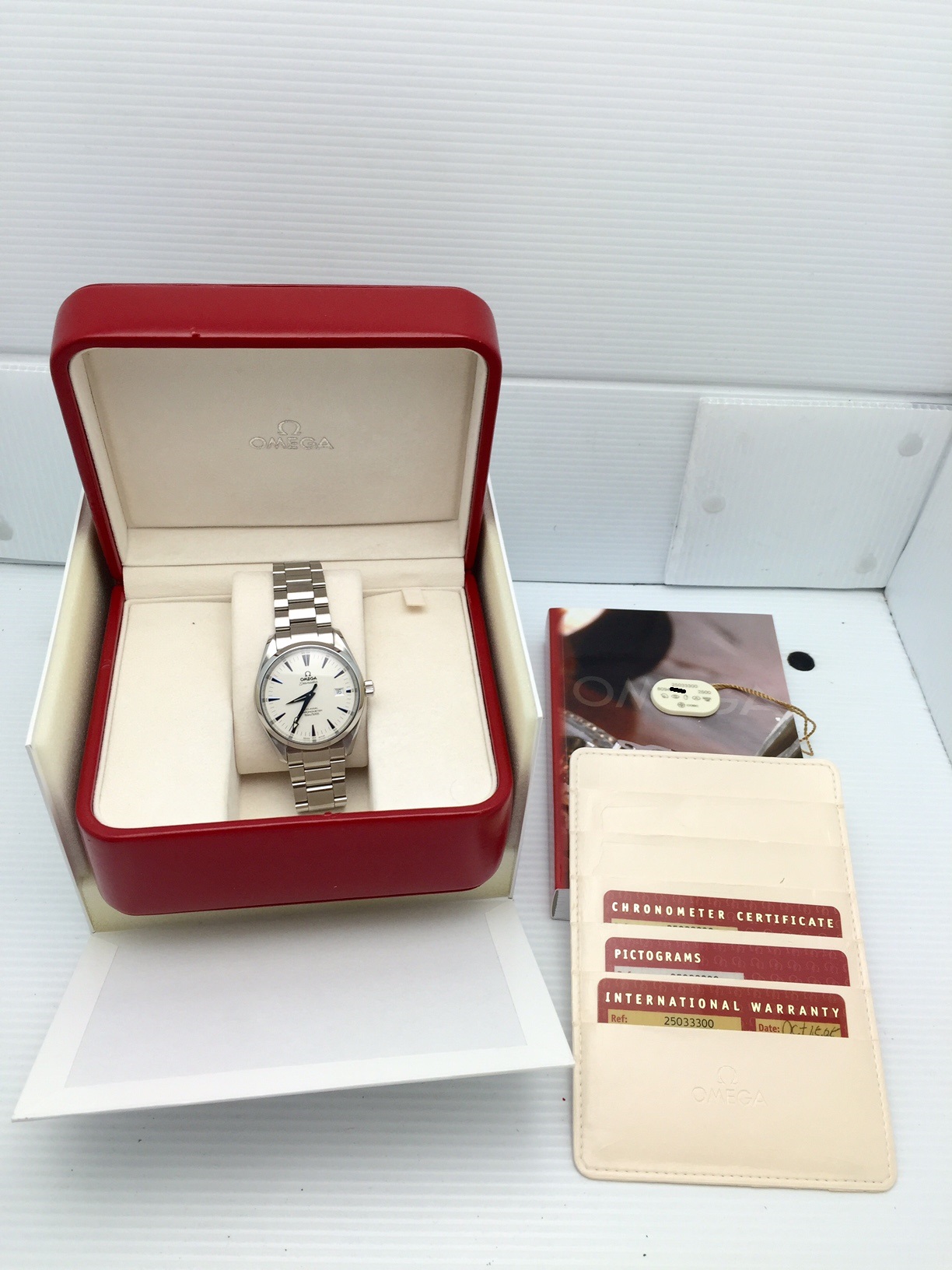 Accessories: Both Omega boxes, manual, card holder, warranty card, pictogram card, chronometer card, serial tag