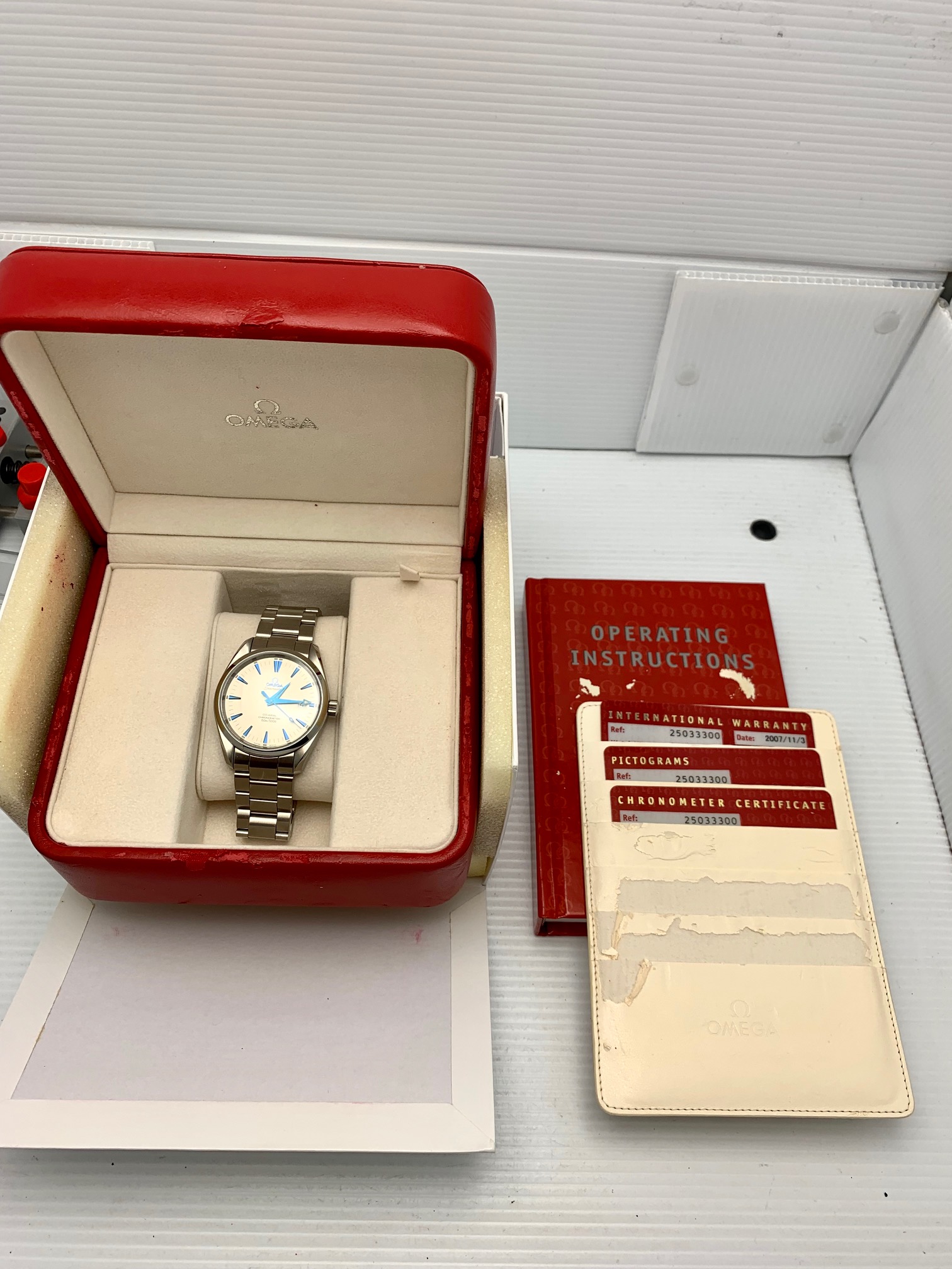 Accessories: Both Omega boxes, manual, card holder, warranty card, pictogram card, chronometer card, serial tag