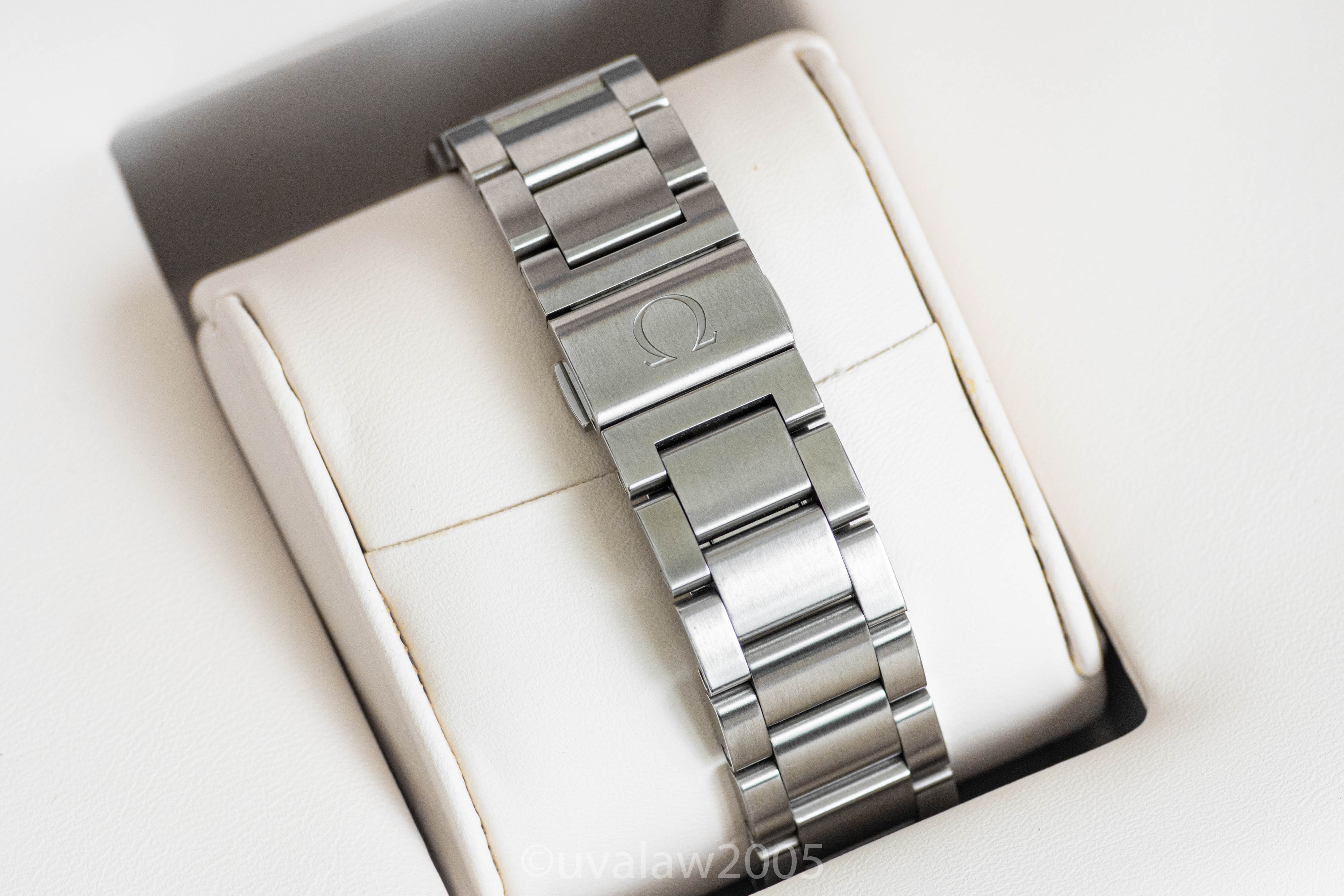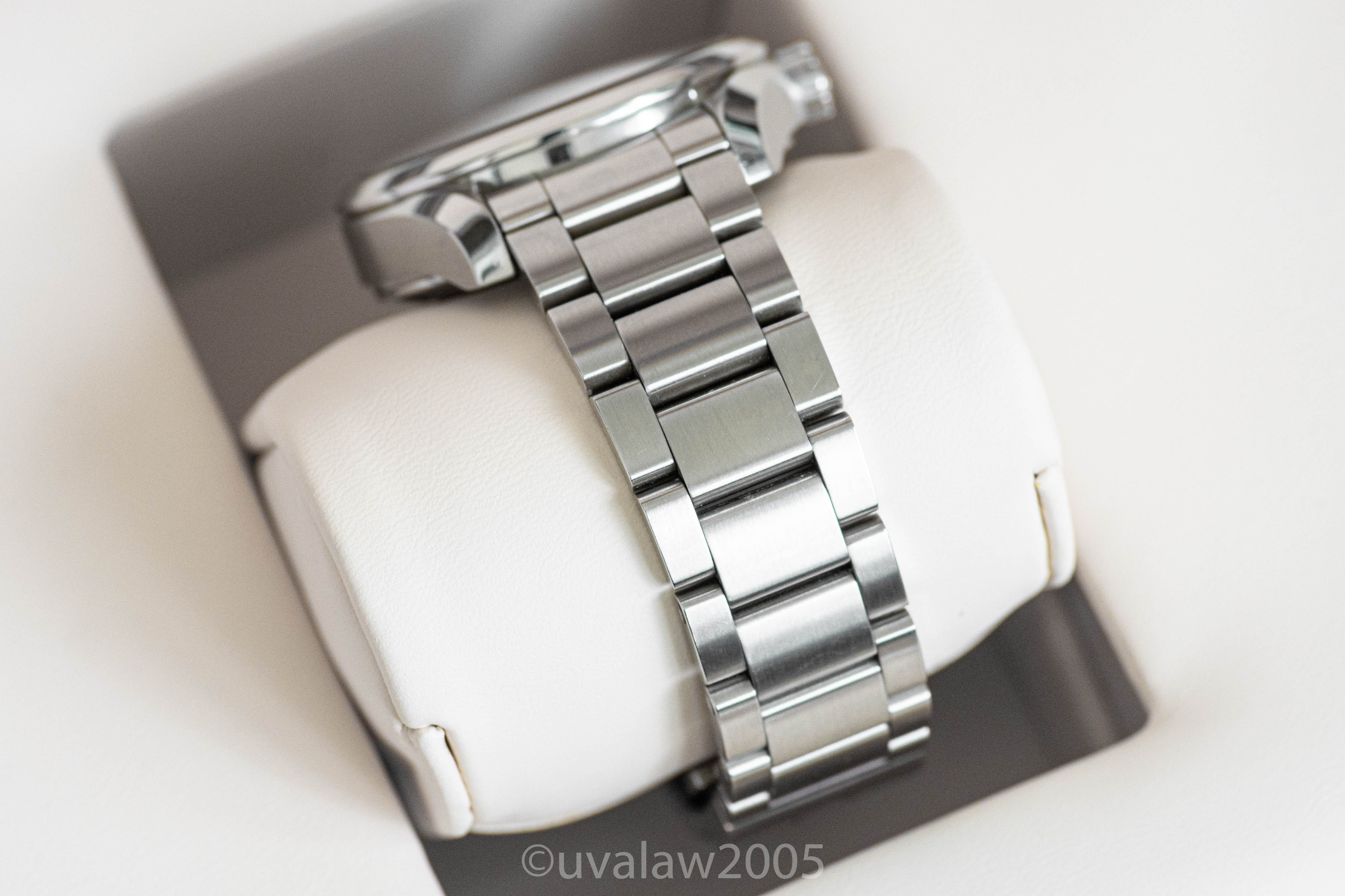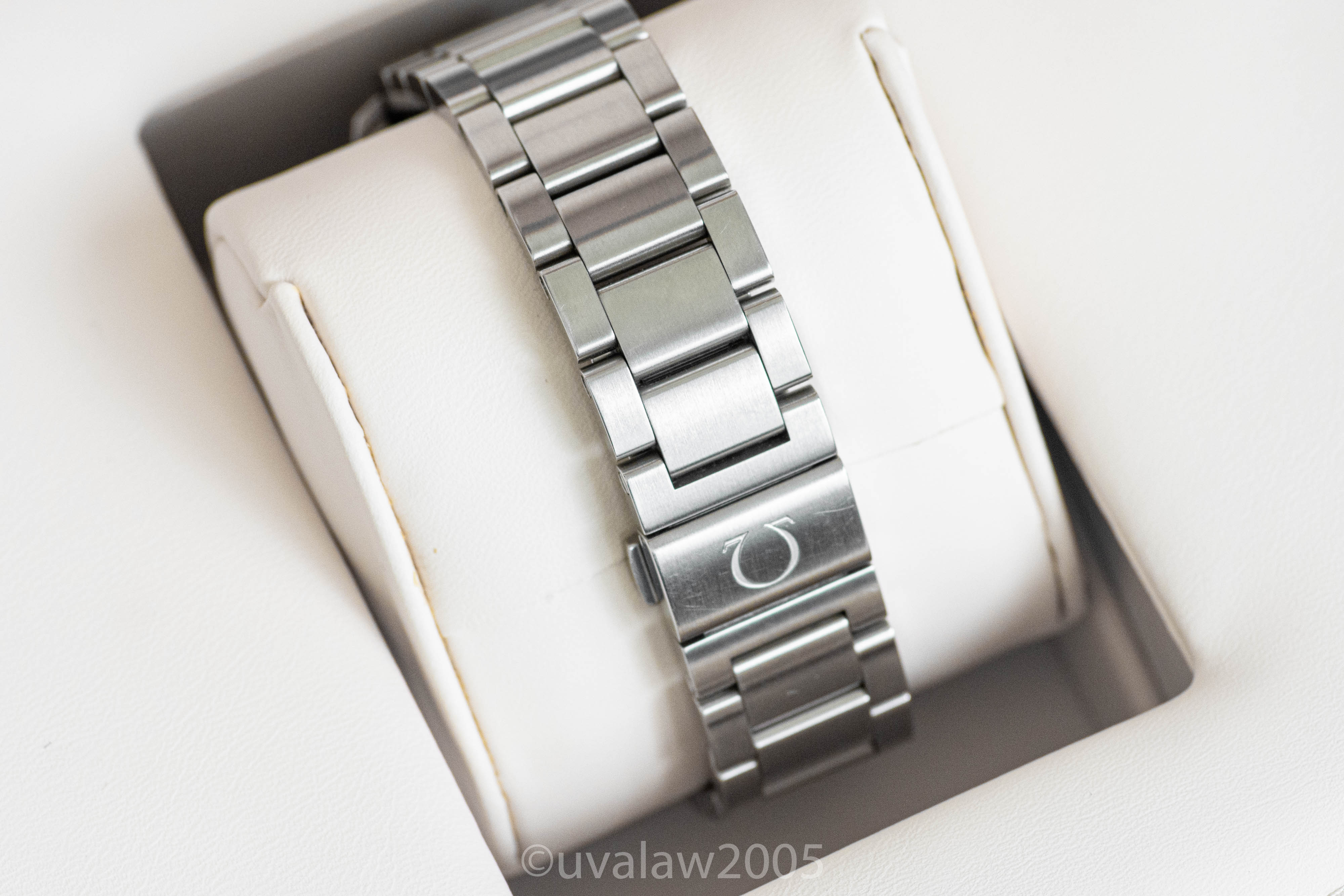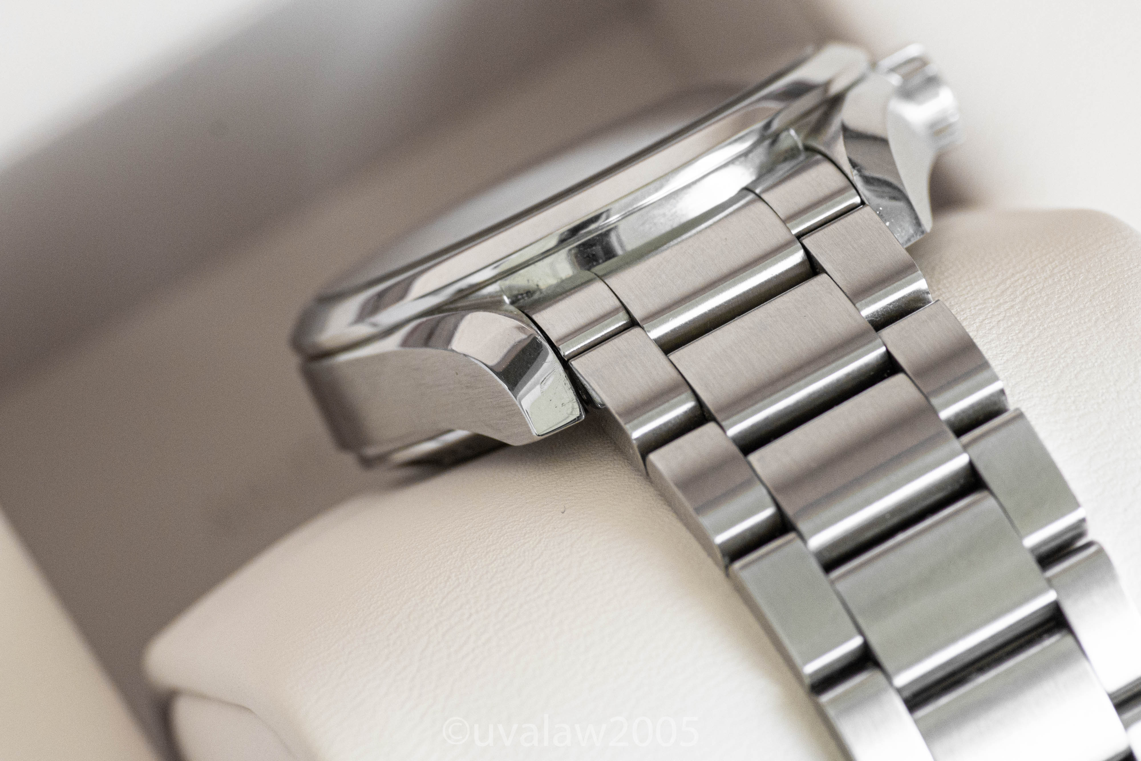 Crystal is perfect, case is in very good condition with minor surface wear to the bezel/bracelet and more noticeable wear at the ends of the lugs, as well on the polished portion of the 1 o'clock lug. All of this has been emphasized in the high magnification photos below. The 8500 Co-Axial movement is keeping excellent time, within +/- 1 second per day on my wrist (YMMV).