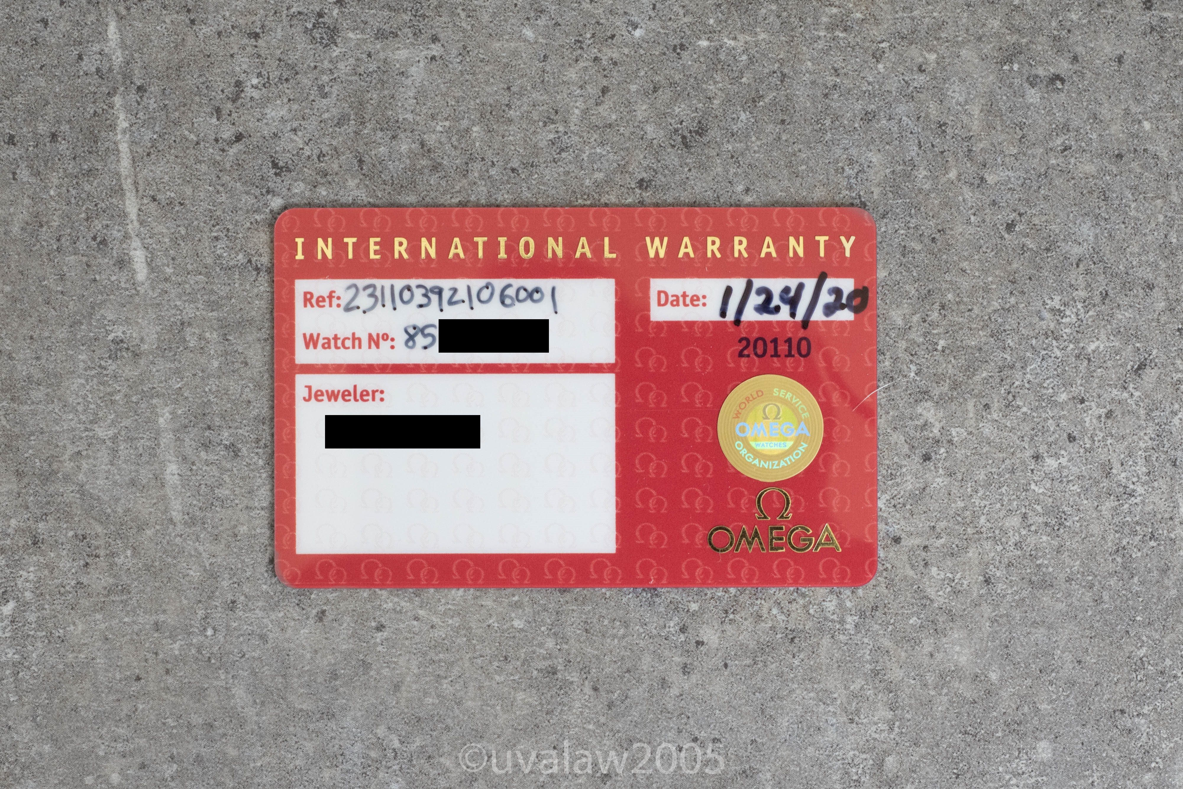 Comes with inner/outer box, all bracelet links/pins/screws (including two half-links still in package), pictogram card, chronometer card, and U.S. AD-stamped warranty card dated 01/24/20. Five-year Omega warranty runs through 01/24/25. Serial intact and matches cards.
