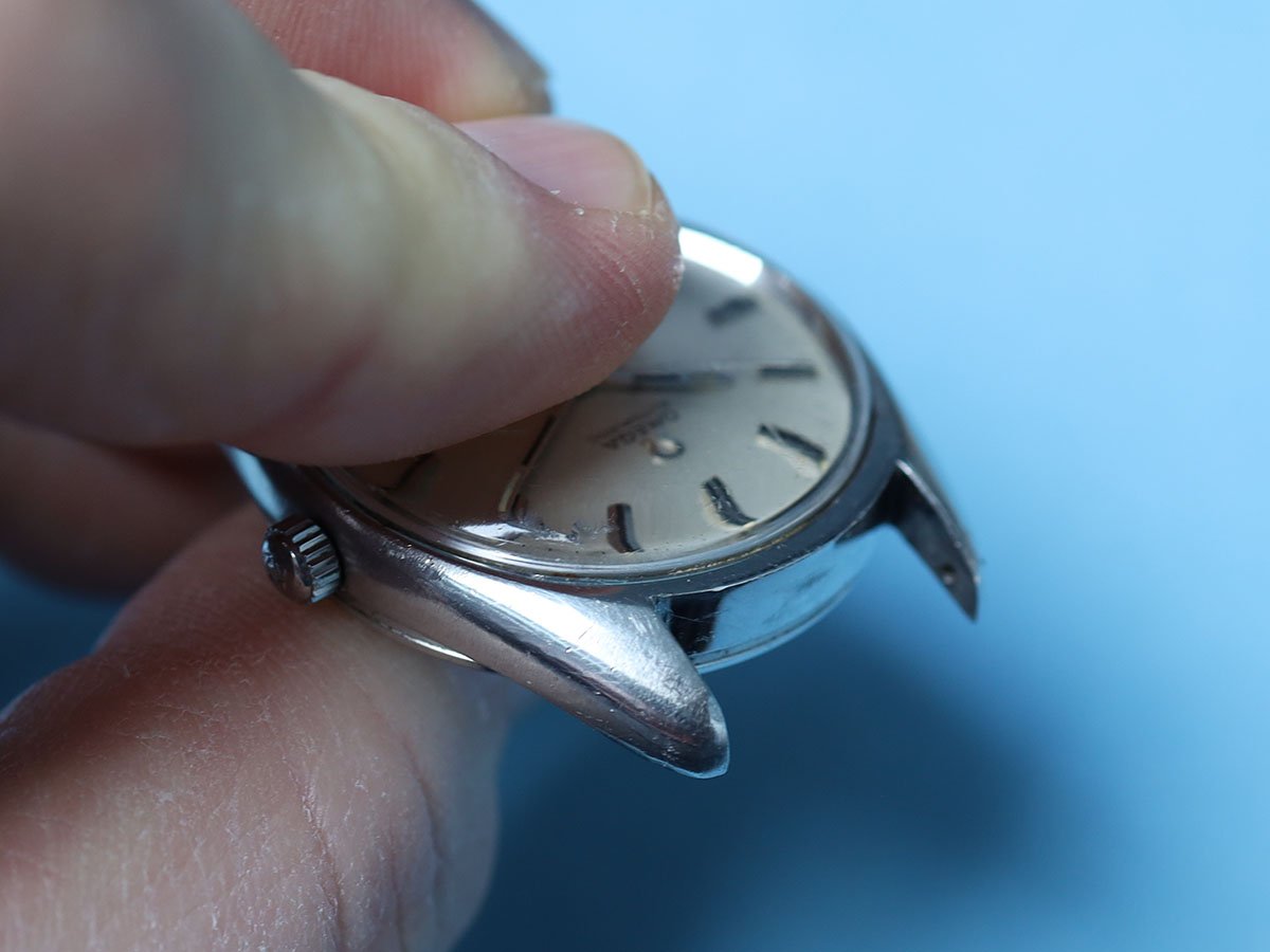 The dial is a lovely and hard to photography sparkle dial, which under a loupe is showing to be clear and free from any marks of the areas visible through the crystal - the crystal on the other hand is both cracked and, I believe the technical term is "scratched to buggery".