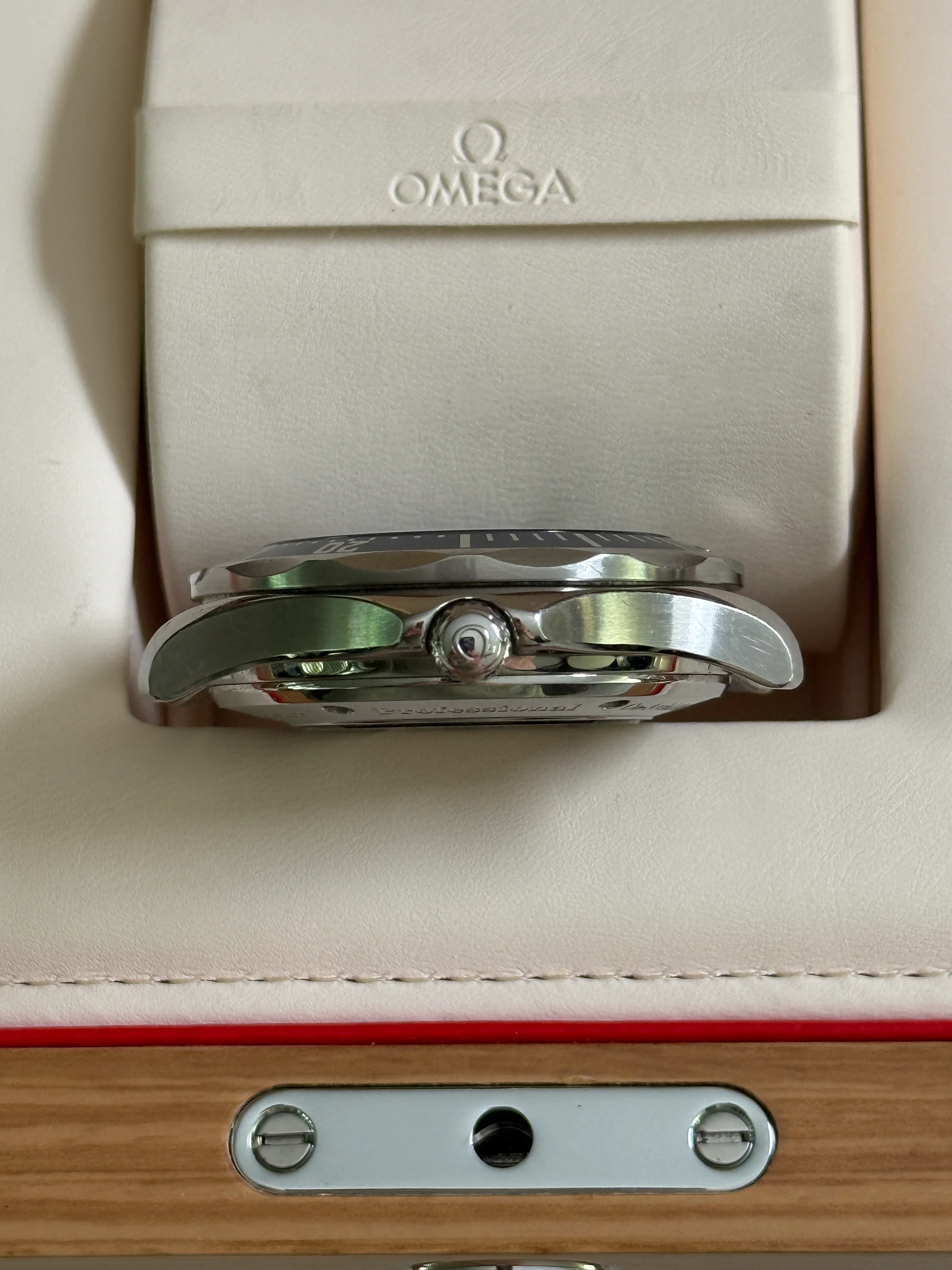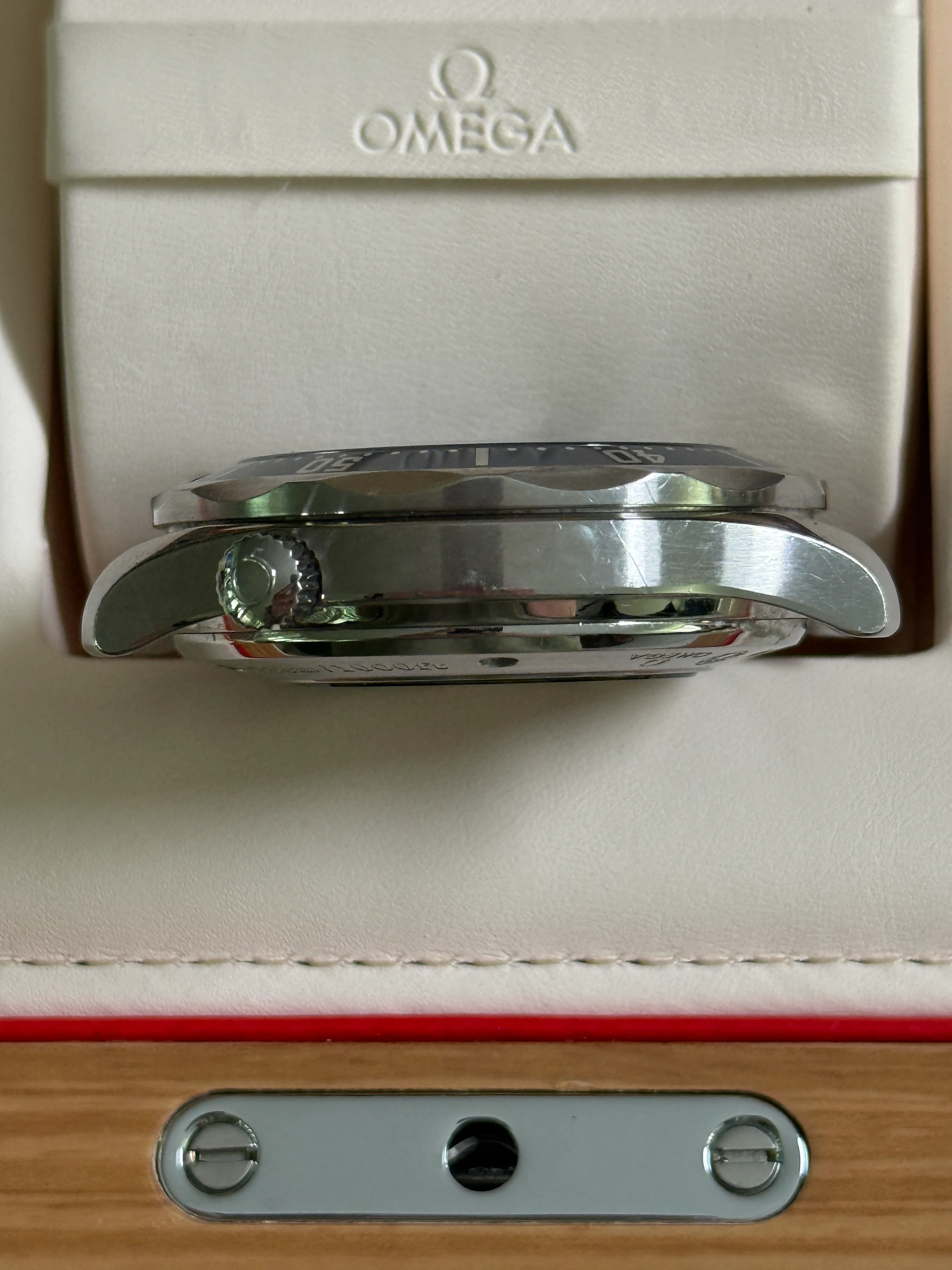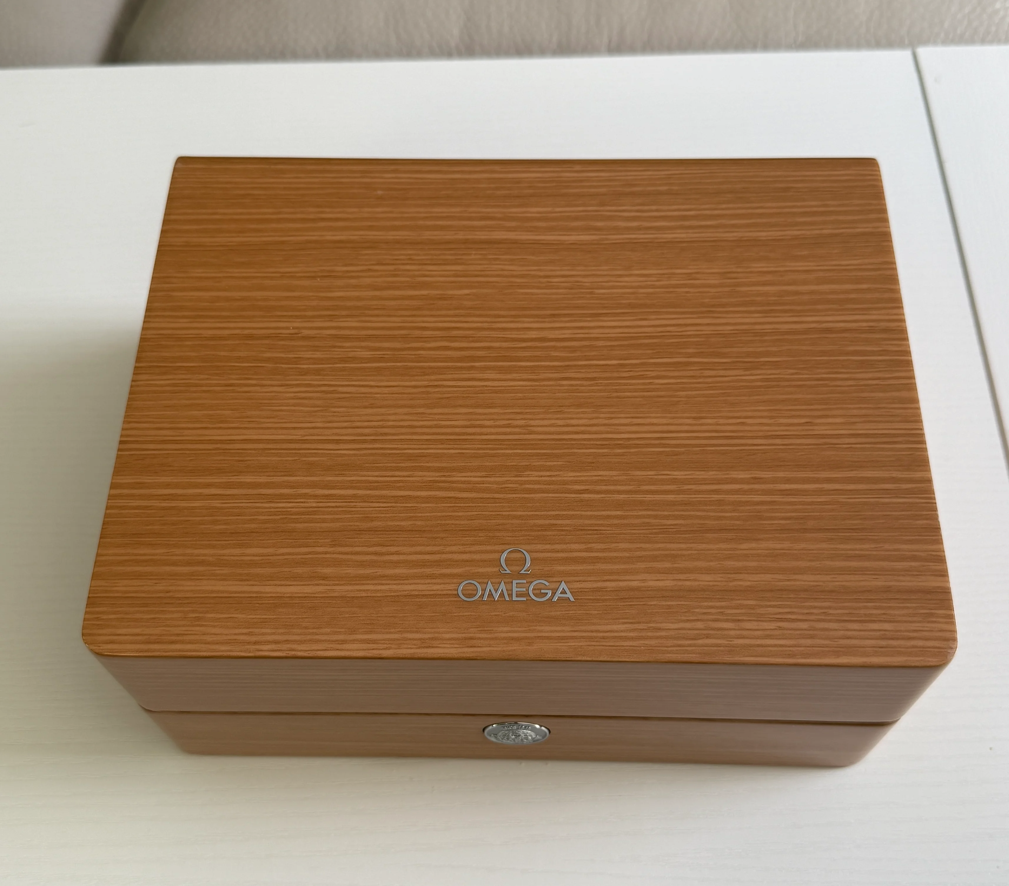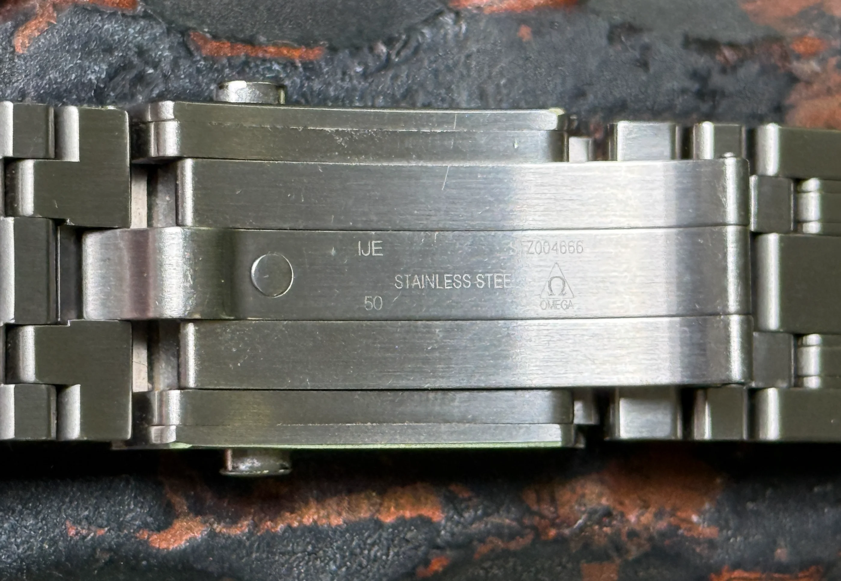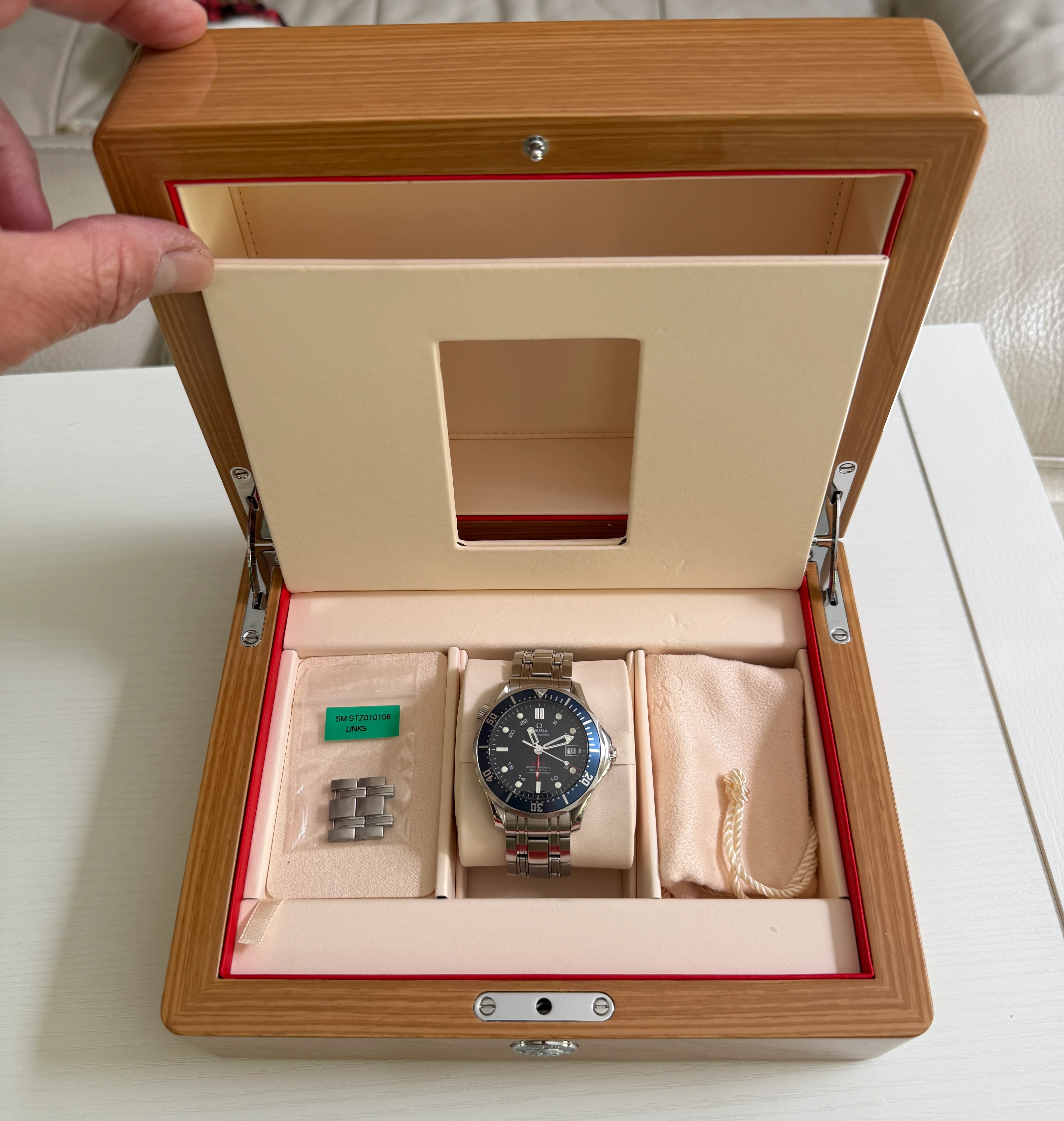 I'm the second owner and the watch comes as pictured with new style Omega box and the newer Bond style bracelet STZ010108 (screws on the links instead of pins and a 3 position extension pushbutton clasp STZ0046660. The watch is in good conditions for its age, with some marks on the case and bracelet (comes in unpolished conditions) The bracelet is currently sized for a 7 inch wrist (additional factory links included). This watch has the very nice, original style blue wave dial, which became famous with the James Bond movies and comes from factory with a very nice sapphire see through back, making it a "sapphire sandwich" as many people call these type of watches.