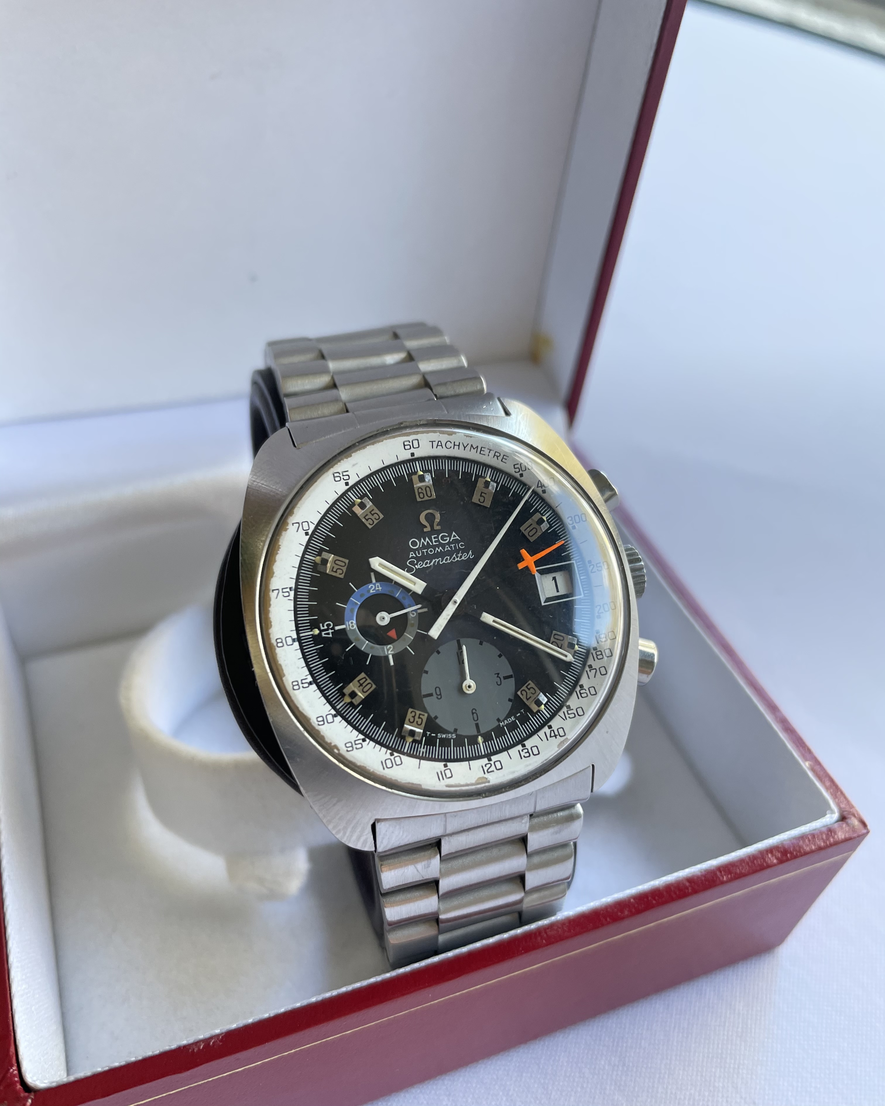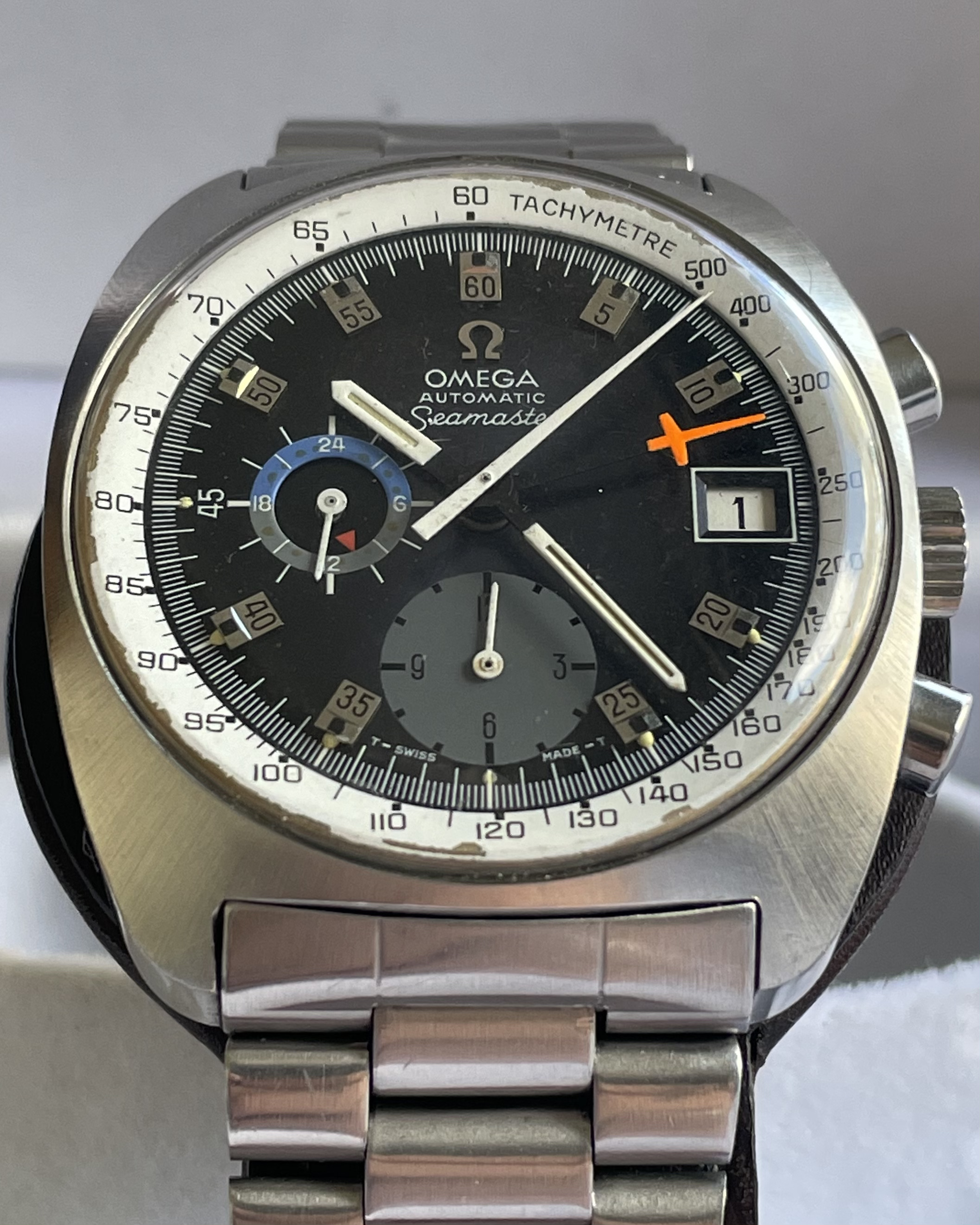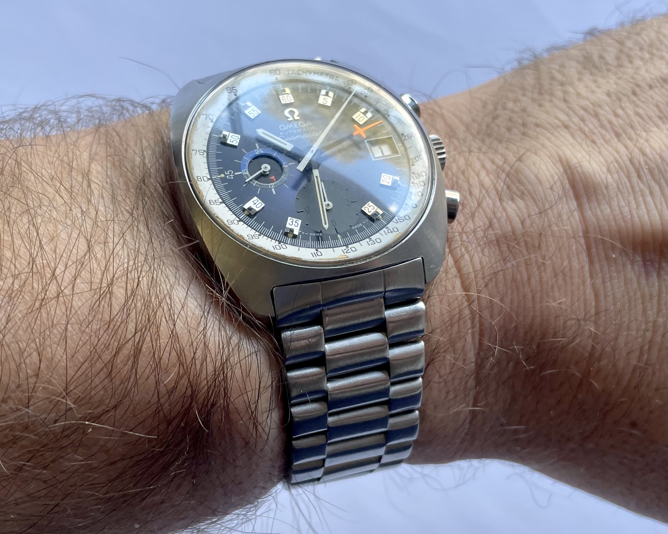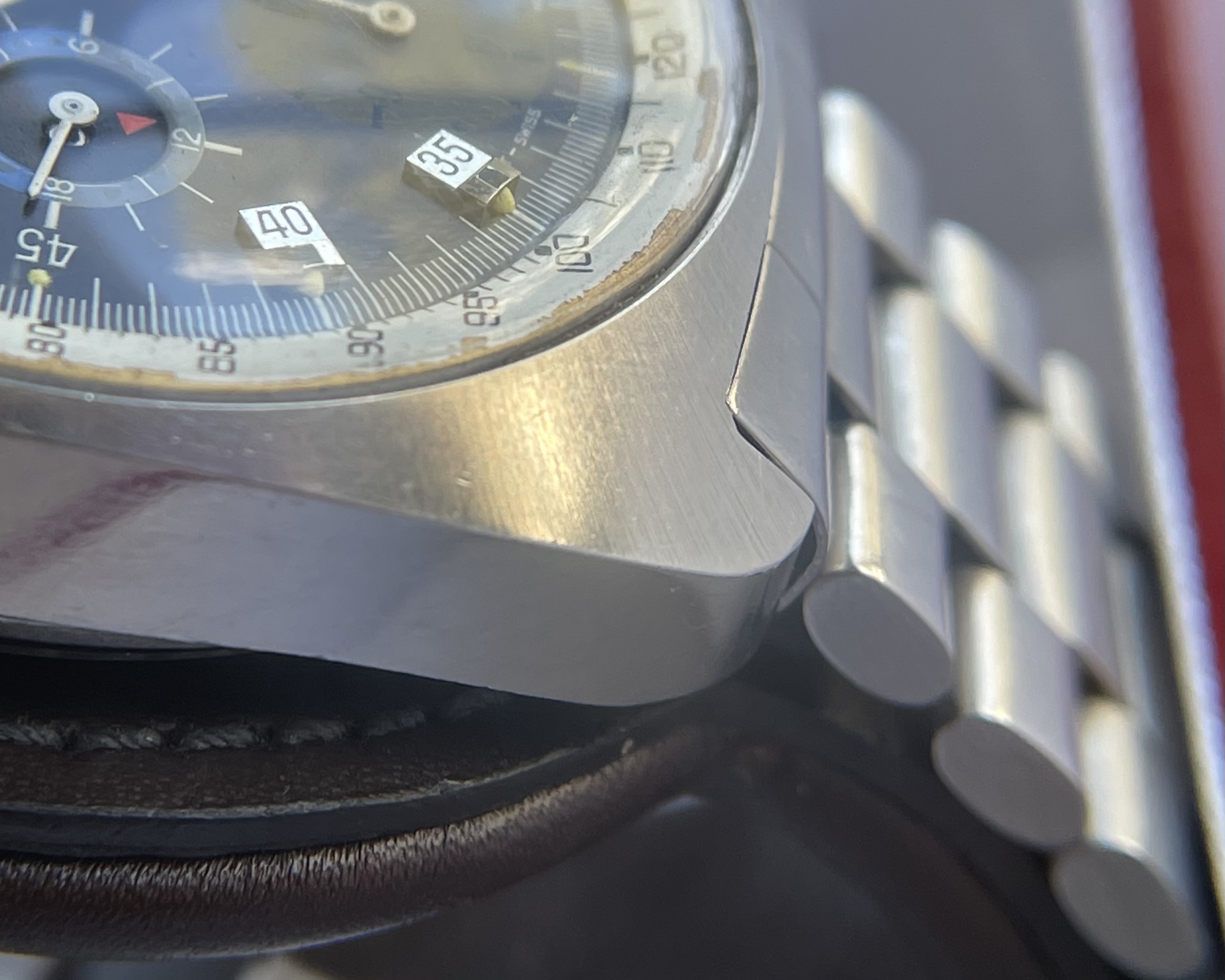 Movement: cal.1040 auto see here for far more on this movement/watch. Not serviced in my possession. For the past 7+ years in my possession, I’ve not worn the watch save for photos or 2-3x a morning around the house. Date wheel clicks through as expected. Winding and time-setting all works as expected. Crono second and minute hands reset to 12 as expected. Based on movement appearance, I’d assume the watch deserves a service were it to be worn/wound with any regularity. (Service was not a priority for me as I largely kept the watch as a great example of an otherwise rare dial variant.)