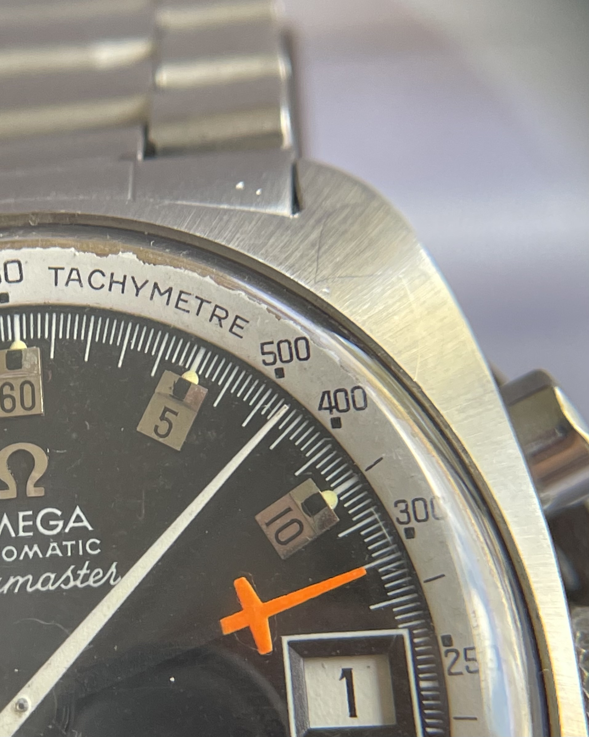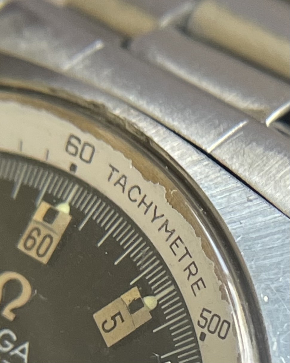 Interior Tachy Bezel: These watches have a tachy bezel, interior to the plexi; on this specific watch, the outer periphery of the tachy bezel has marginal chipping, as can be seen in the photos. This is really the only remarkable cosmetic blemish on this otherwise good example (replacement tachys can be had, if desired).