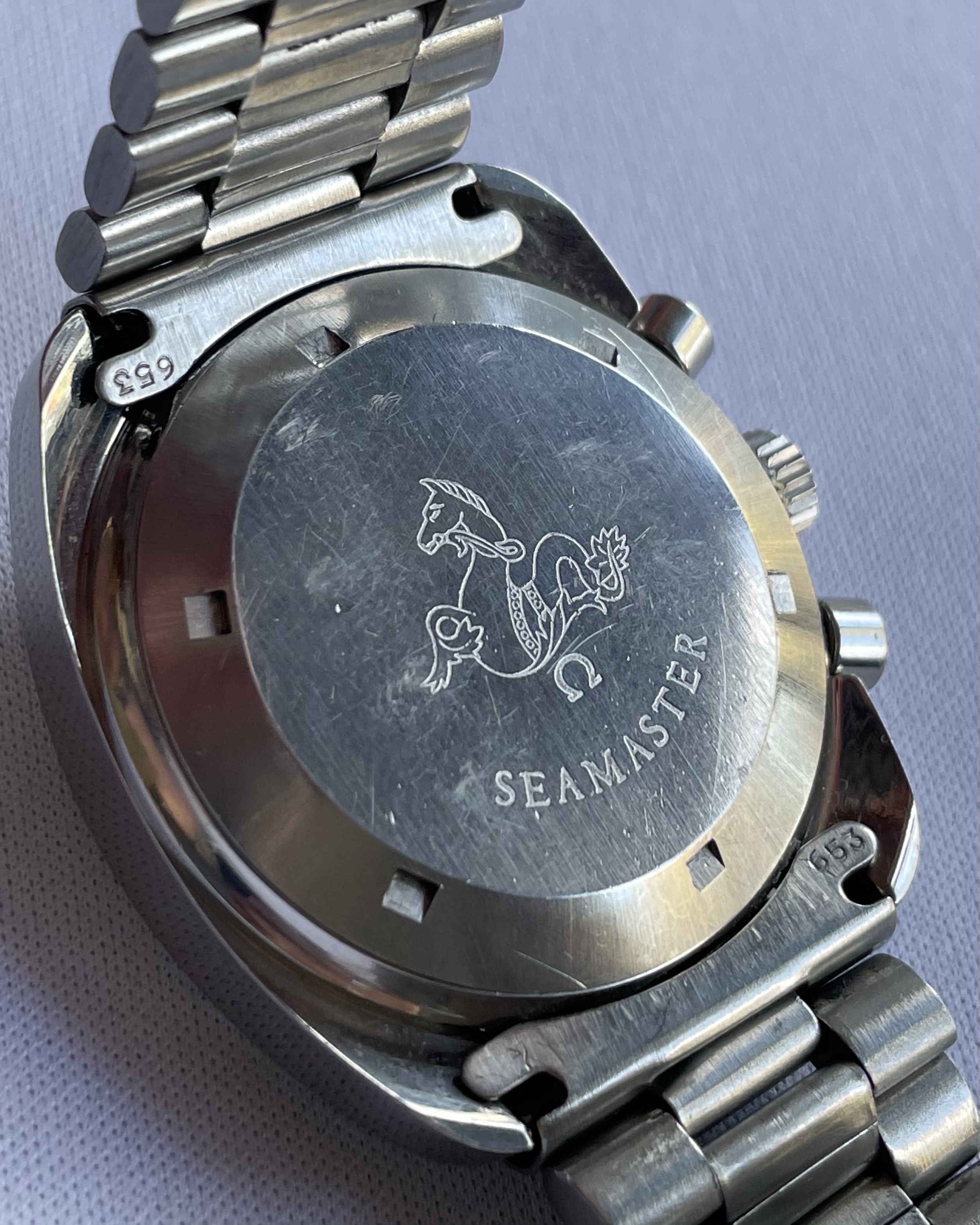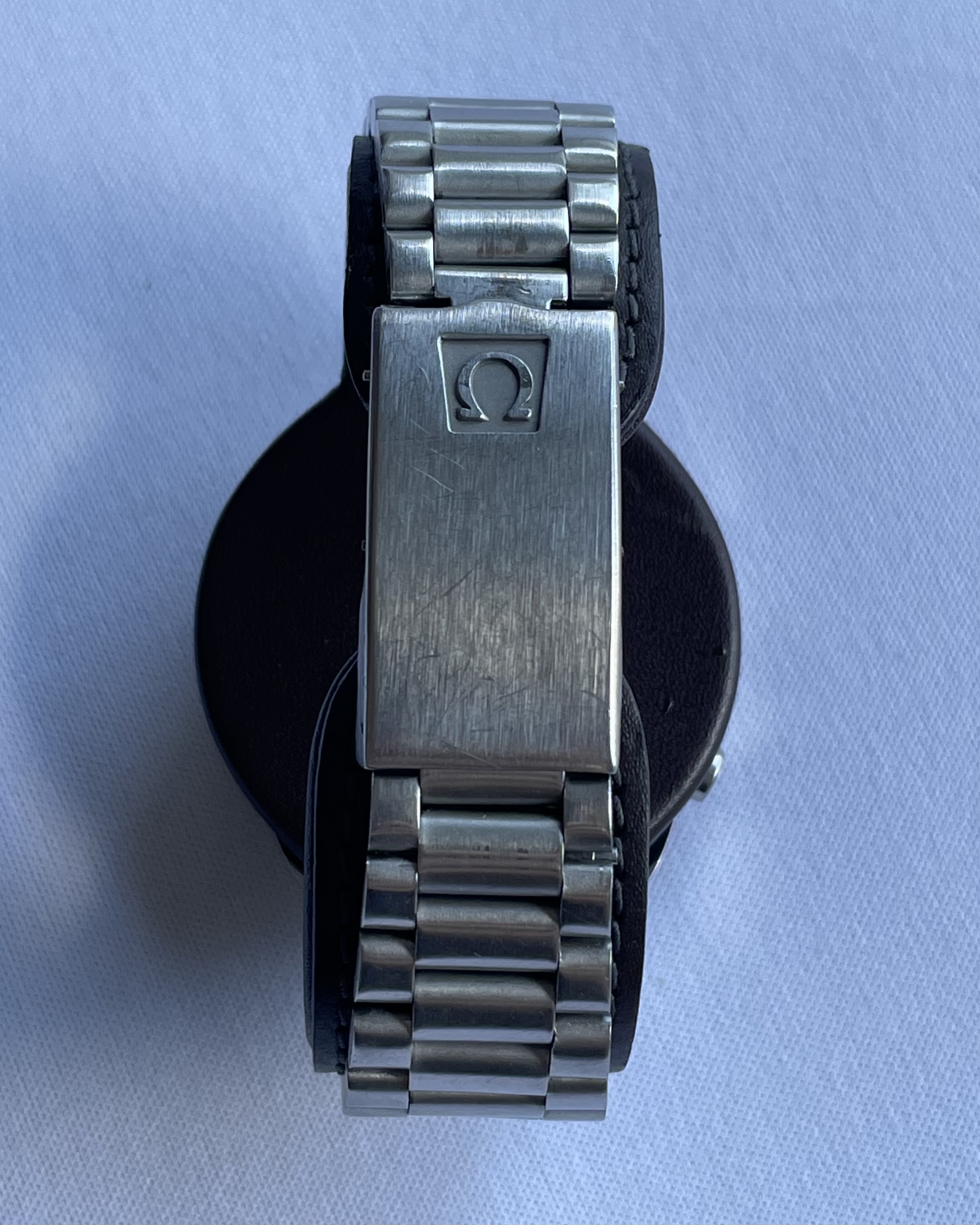 Bracelet: 1170/653 which I believe makes this the original bracelet (rather than service replacement). However, the clasp mechanism (but not the clasp cover) appears to be a HK replacement. Clasp cover still appears original/correct to the bracelet/watch. Some very small hairline scratches, rubs, to the bracelet but no dents. The hairline scratches are so few and feint it is difficult to photograph any of them, but please see photos. Solid stainless steel links. Bracelet barely fits (too tight) my large 21cm wrist at the largest clasp-extension setting.
