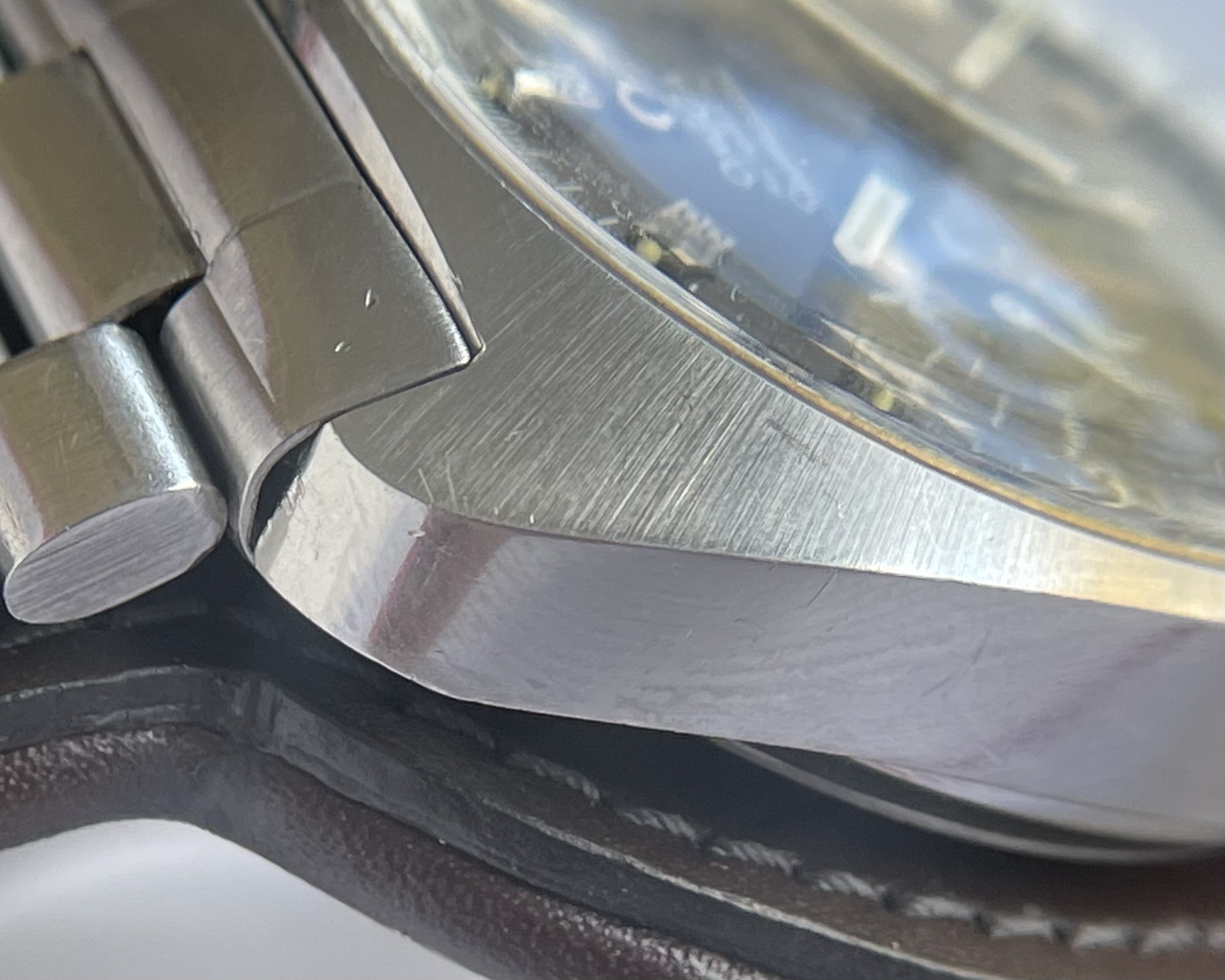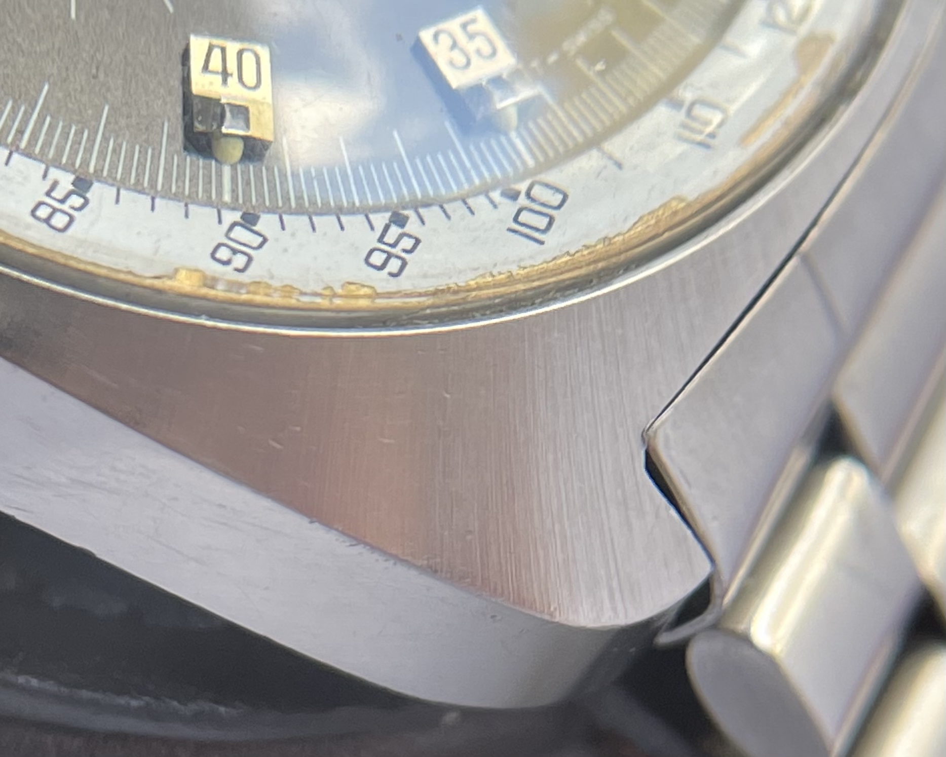 Case: 38.5mm (absent crown). Some very small hairline scratches or rubs, no dents. The hairline scratches are so few and feint it is difficult to photograph any of them, but please see photos.