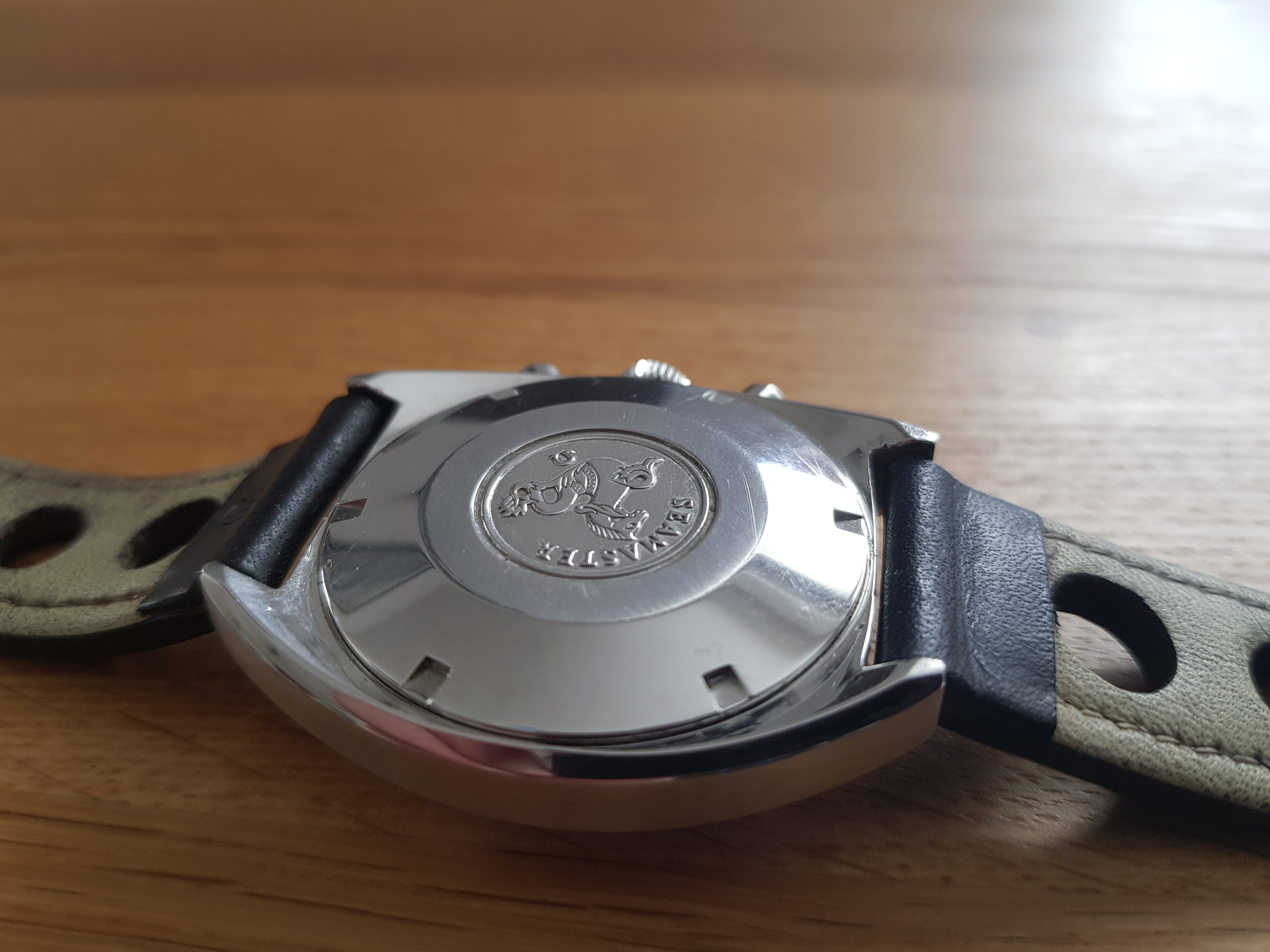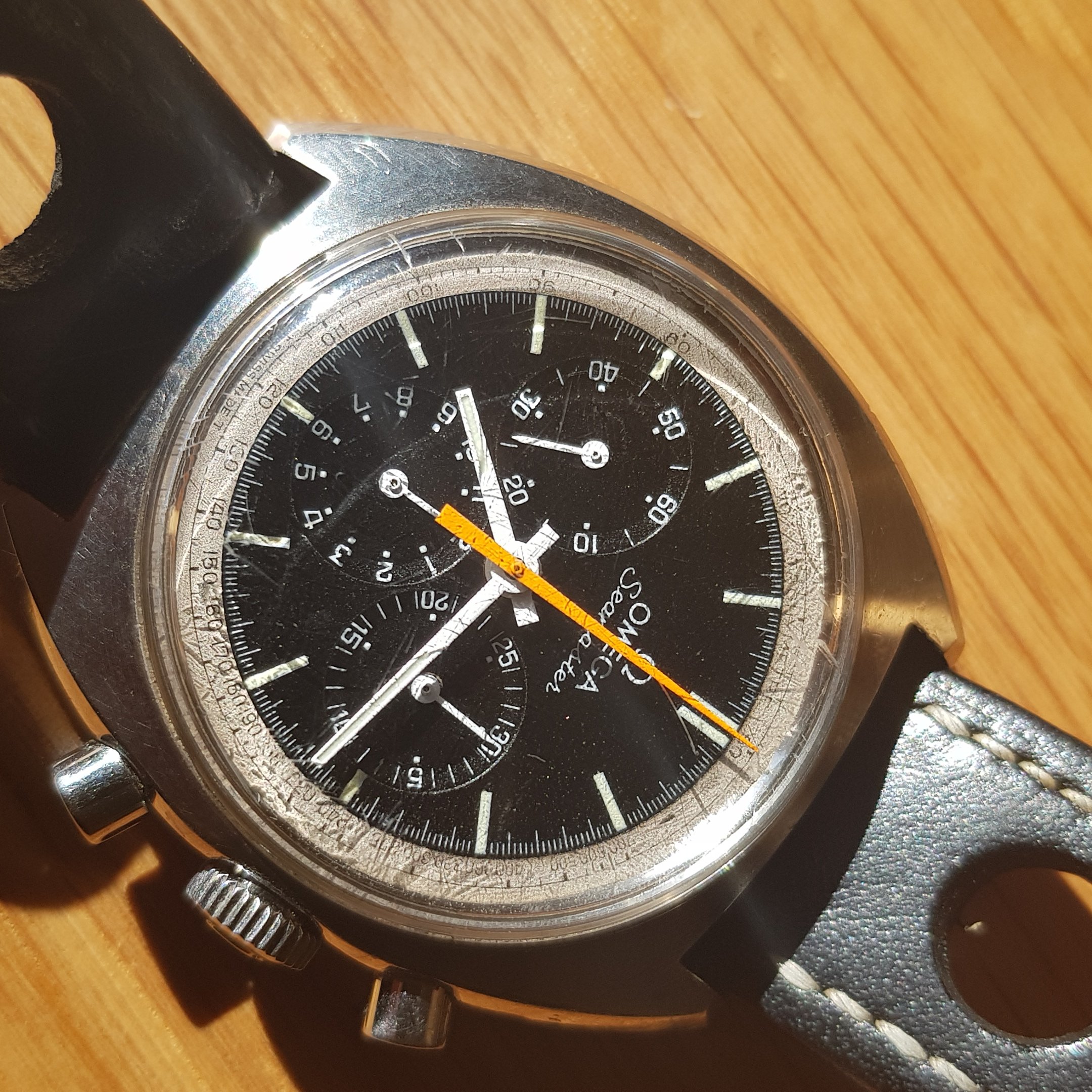 Original black dial with 3 black subdials and white tachymeter scale. The dial has some small white spots. (visible on the pics)