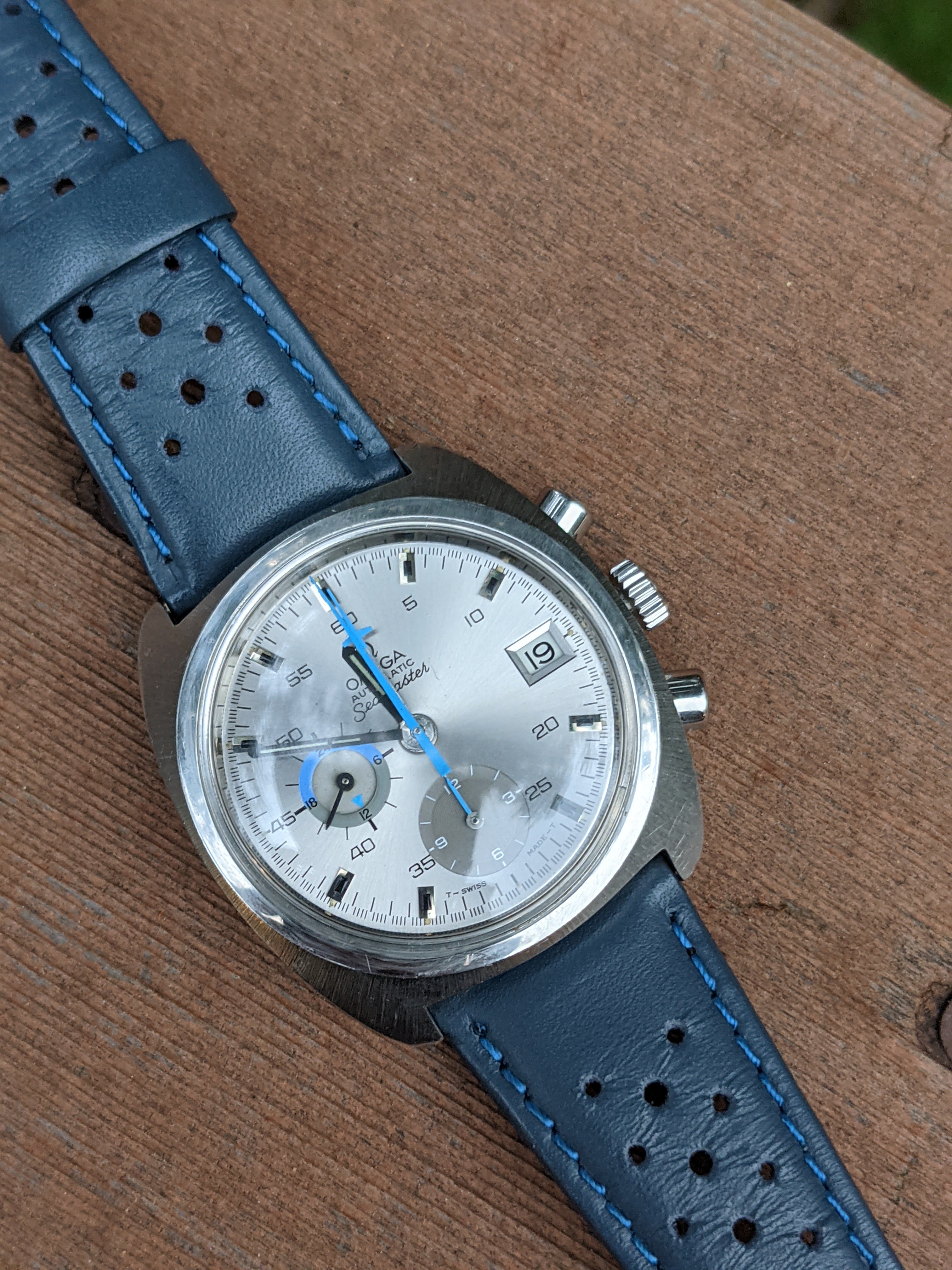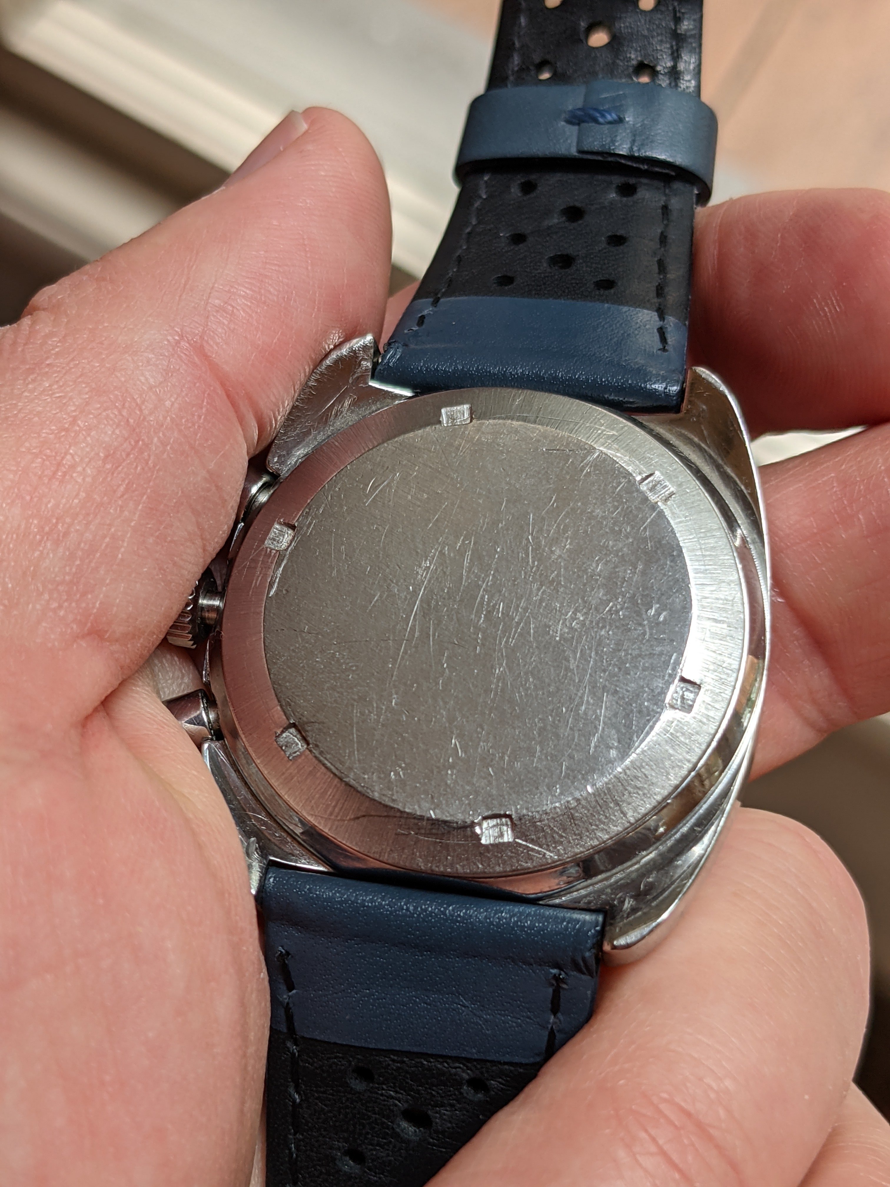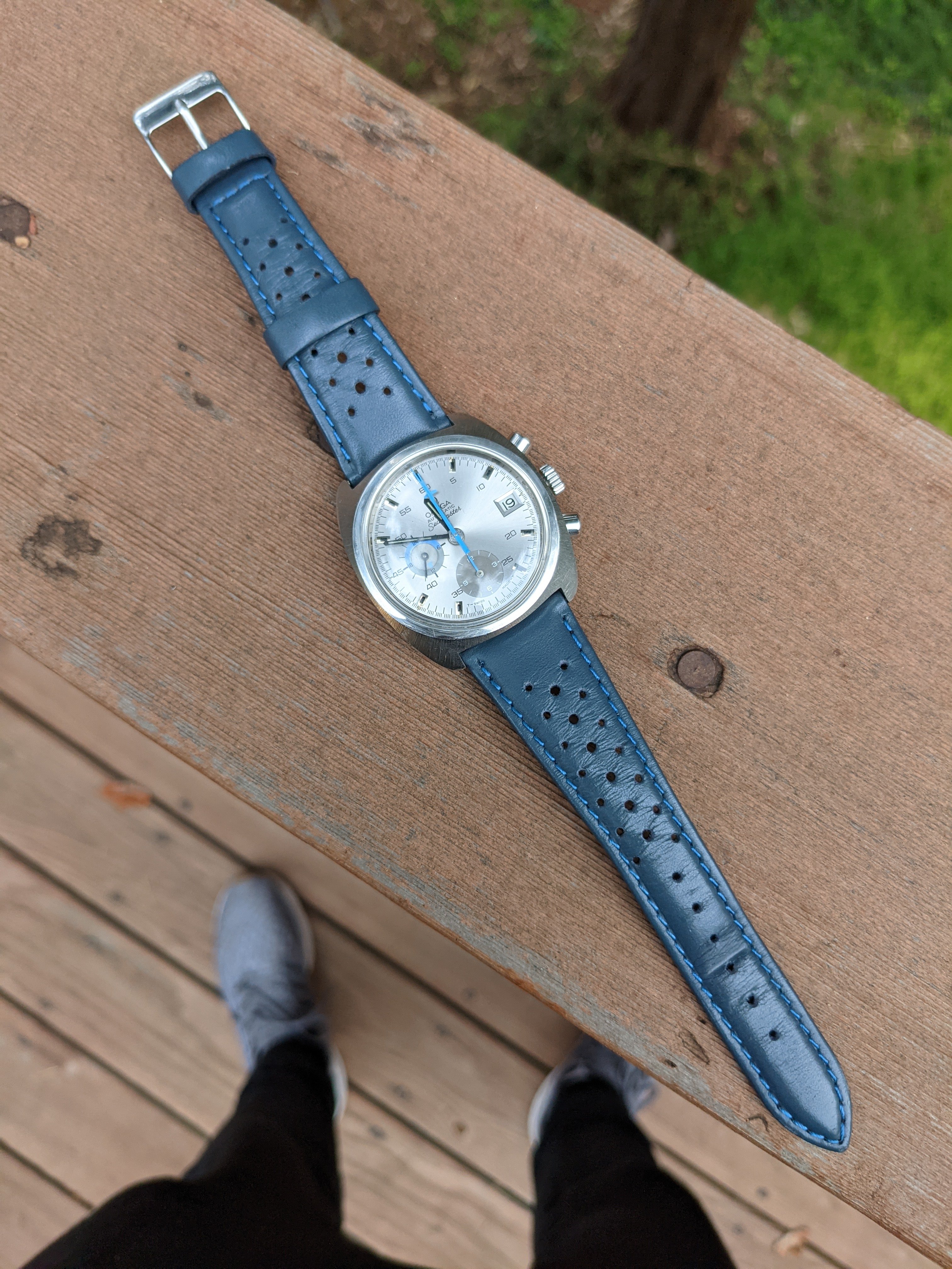 Purchased on eBay from a dealer in Portugal in early 2019, I’ve enjoyed this watch for 3 years now. I haven’t opened the case since service, but as you can see from the timegrapher photos, it’s running great. Service receipt will be included with the watch. It comes on a blue leather racing strap made by Abel Court of Heuertime, which matches the chrono hands perfectly. Read more about the 1040 family at http://www.calibre1040.com/. (Thank you @Andy K for your great work!)