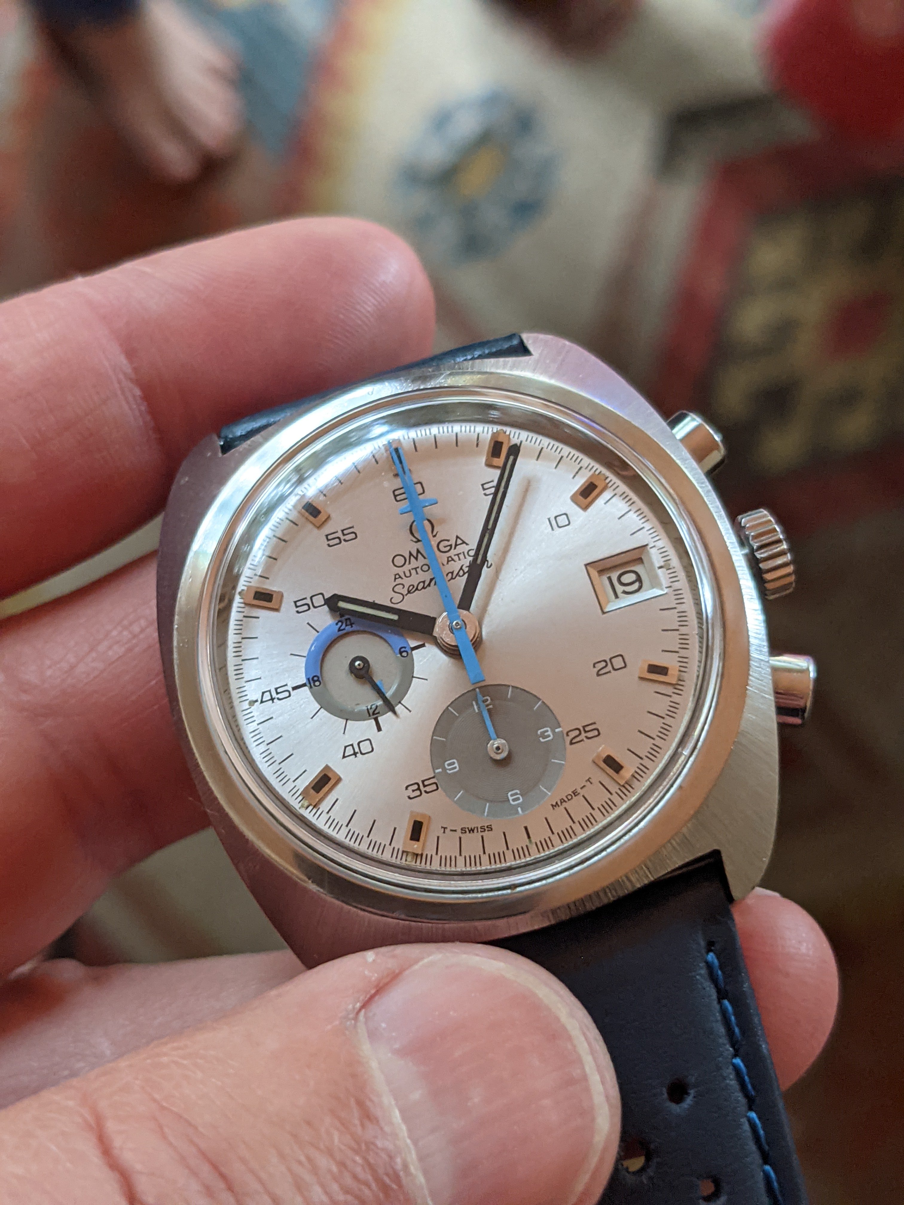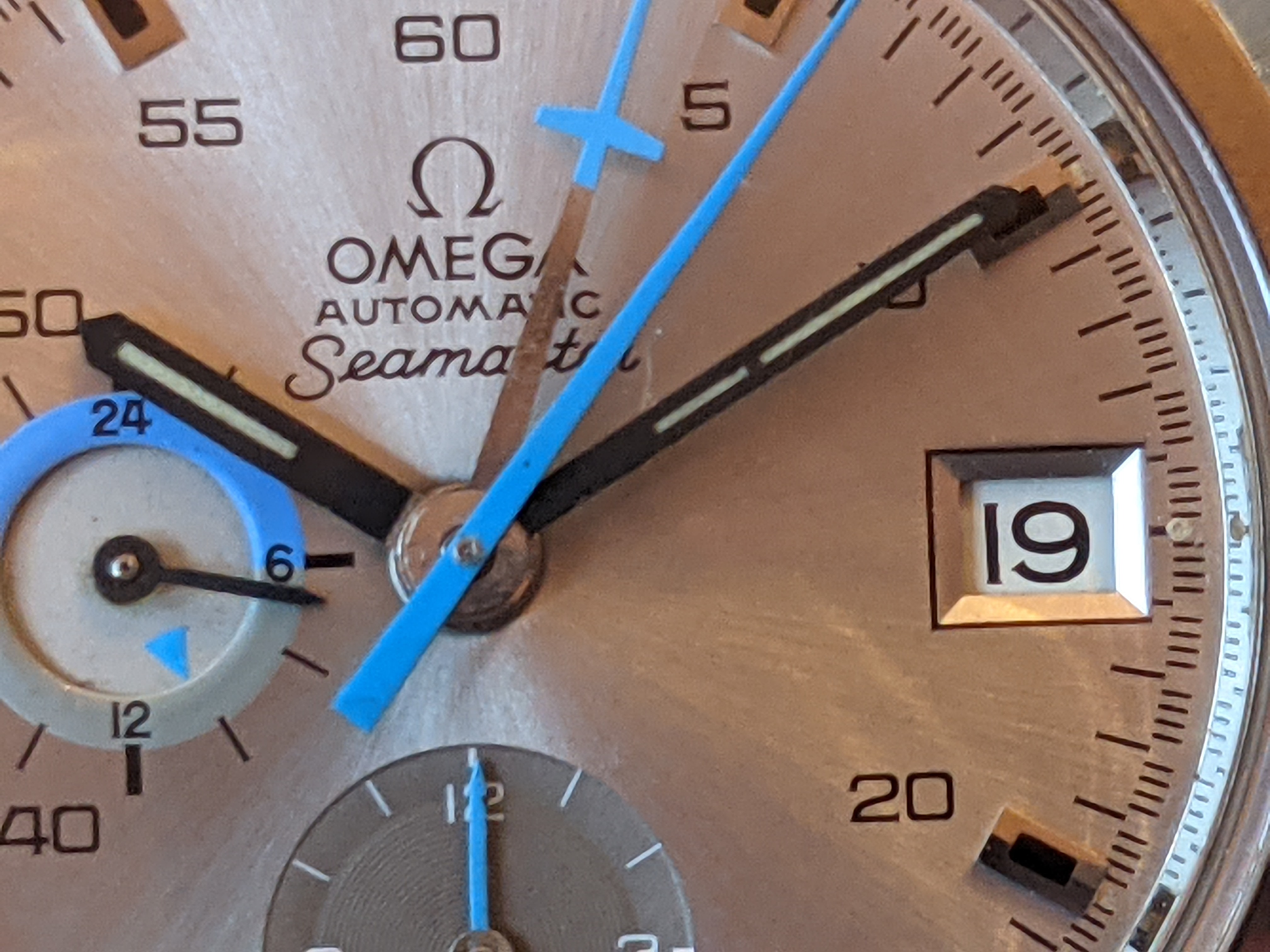 The 176.001 was Omega’s first automatic chronograph, released in 1971. Omega wasn’t the first to market with an auto-chrono, but I think the caliber 1040 is one of the best of its time. It’s incredibly legible, user-friendly, and fun to use with central chrono minutes and seconds hands in contrasting colors, a 24-hour subdial with running seconds, and a 12-hour chrono subdial. 38.5mm diameter and 15.6mm thick. Serial number 31,643,XXX is in the correct range for this reference, putting it in the first half of 1972. (See here for comparanda.)