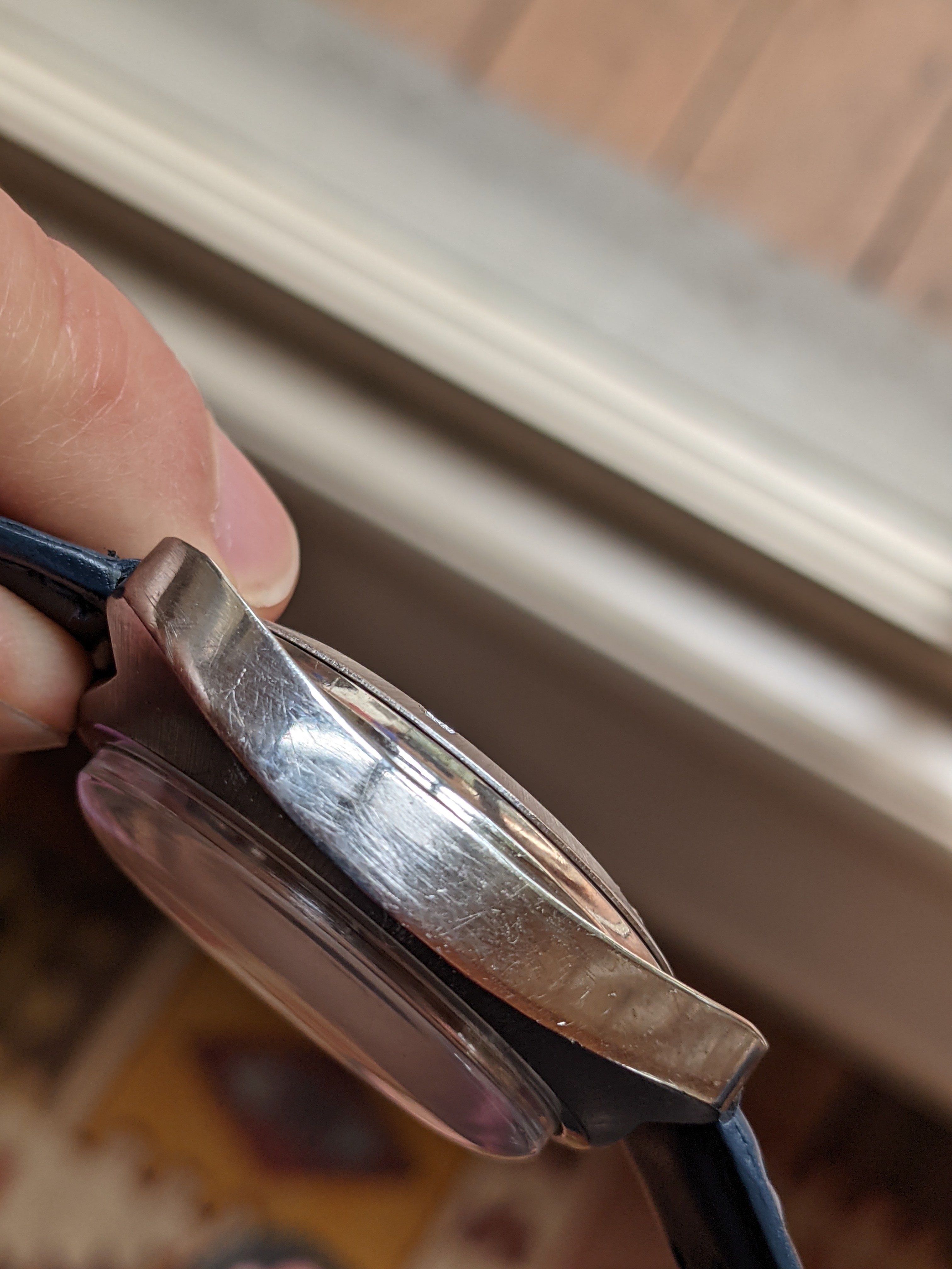 This watch has a type A3 Dial, stick hands, and well-preserved, evenly aged lume. The case has crisp radial brushing visible across the top. There is a light scuff on the brushing near the lug at 5 o’clock, which is only visible at certain angles. The 3 o’clock side of the case has some light marks. The caseback has opener scratches, and the hippocamp logo is worn, so that it is very hard to see. The crystal has the Omega logo. The dial is beautiful, without marks, and the lume on the hands has aged nicely.