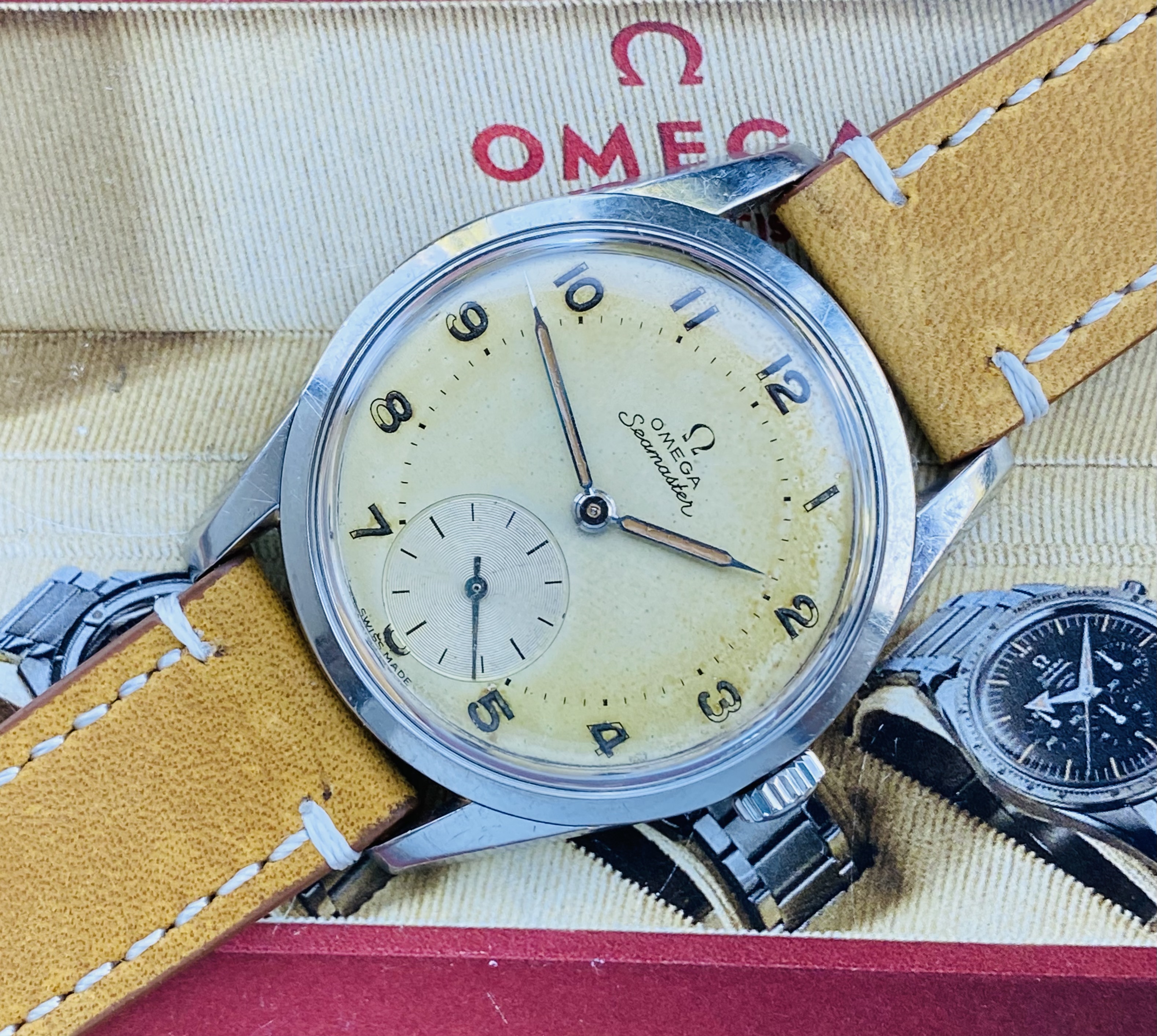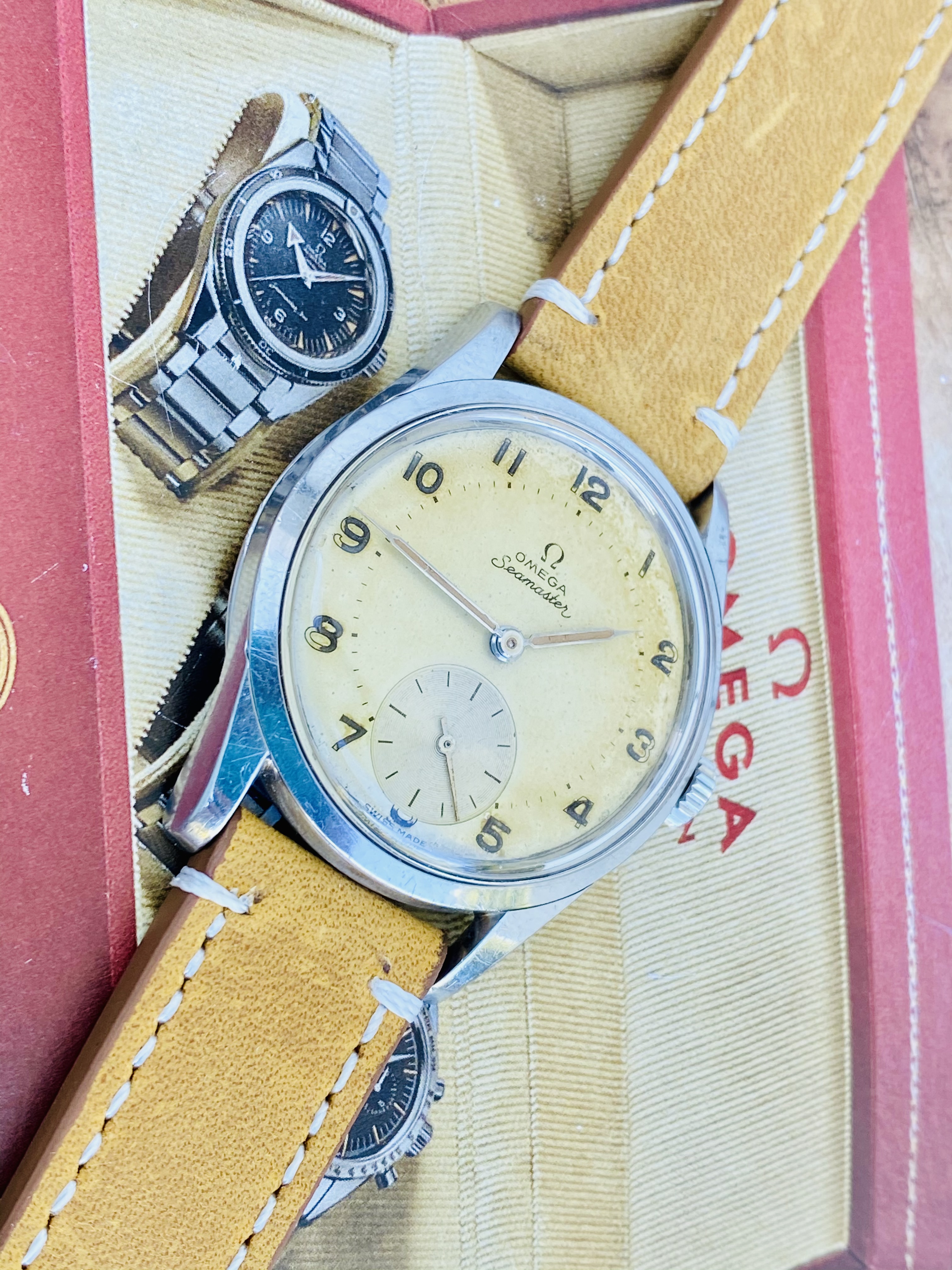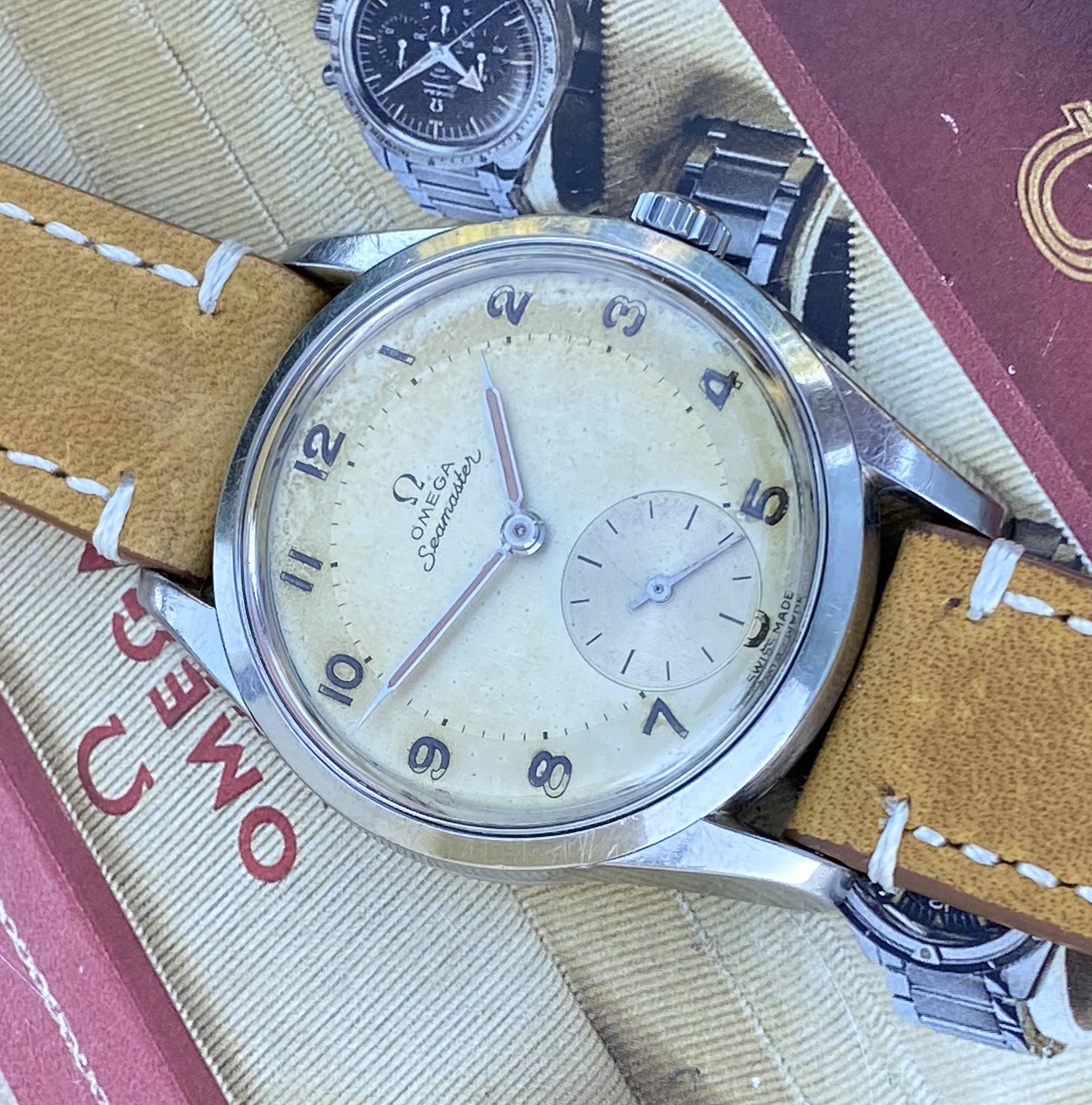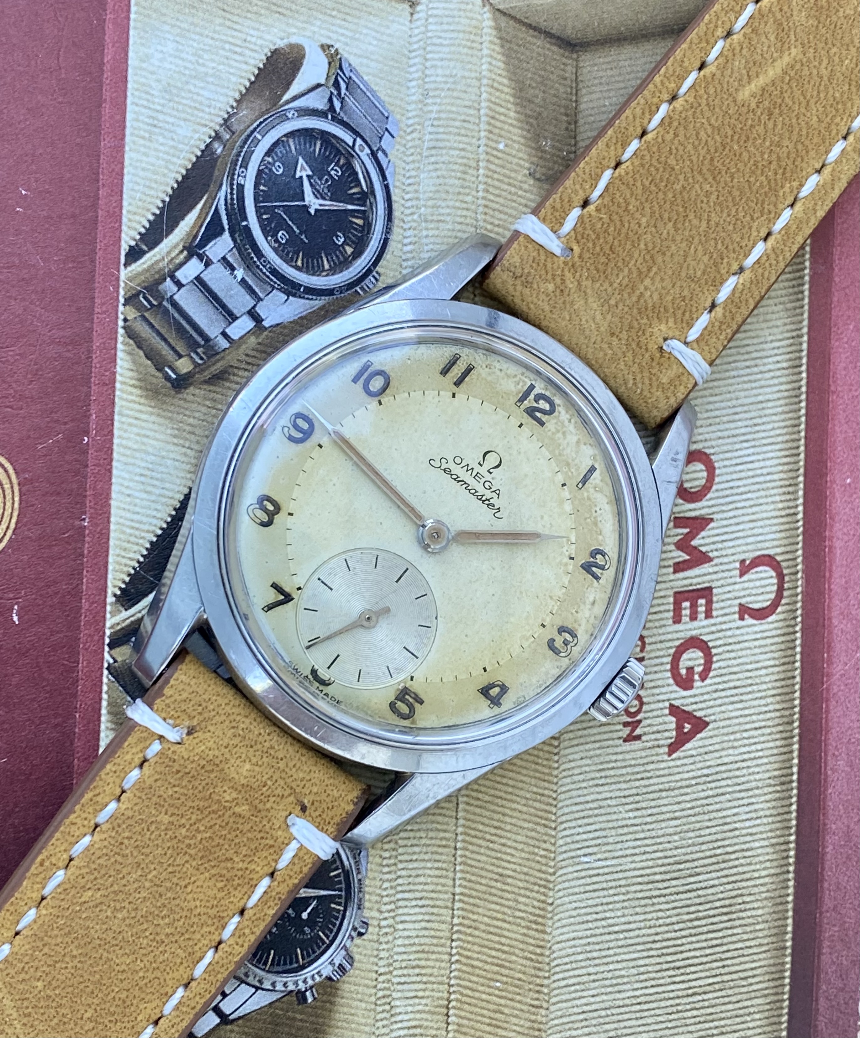 DIAL: with original patinaited dial with applied indexes, Omega logo and baton hands.