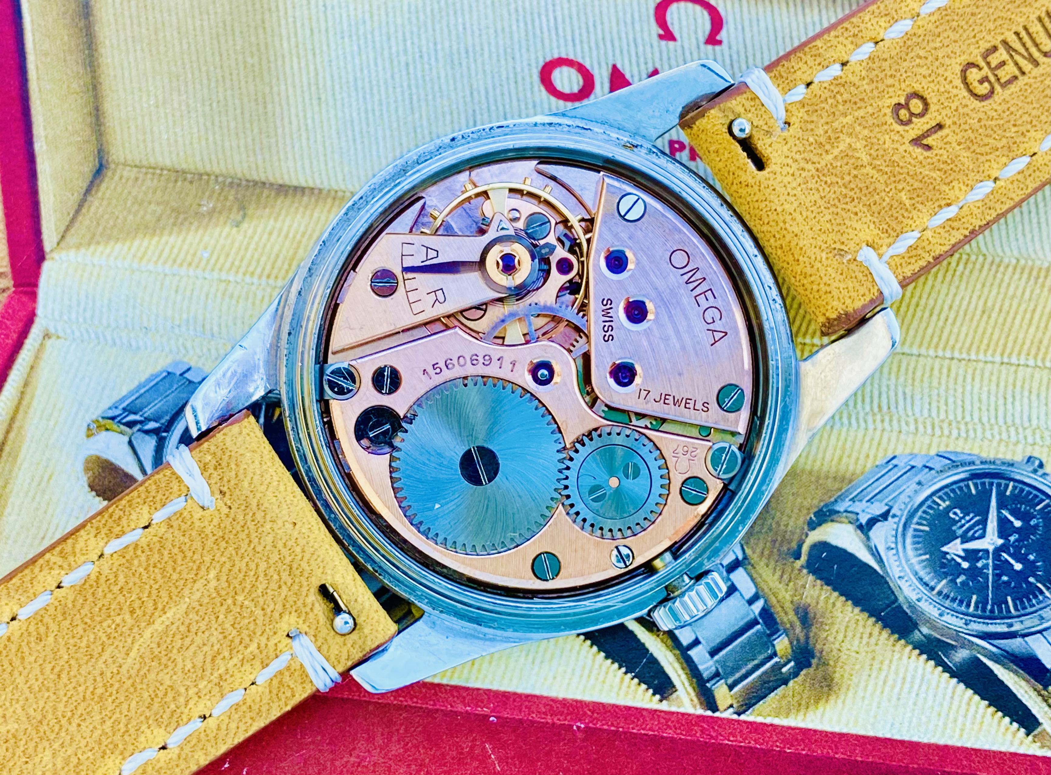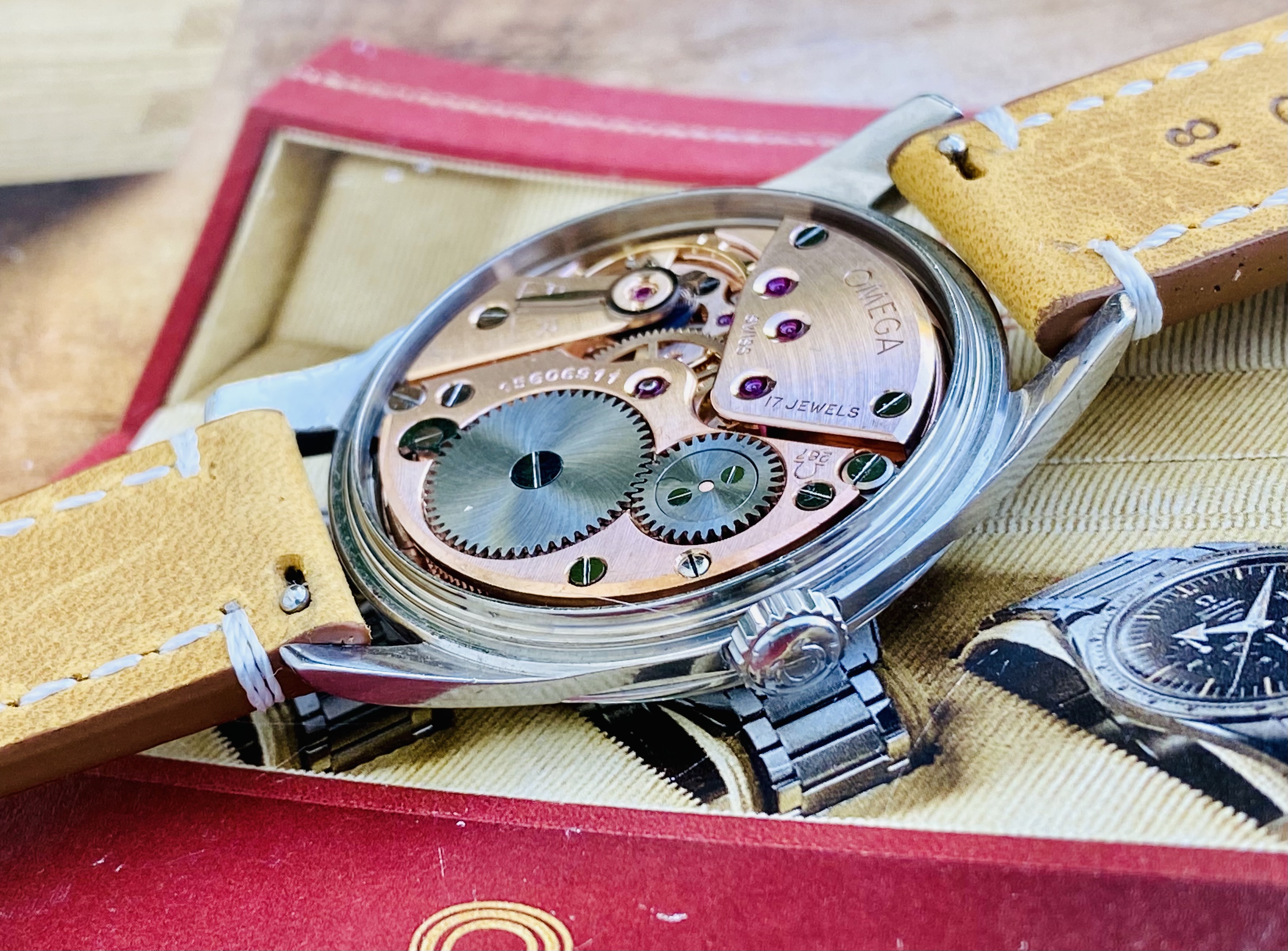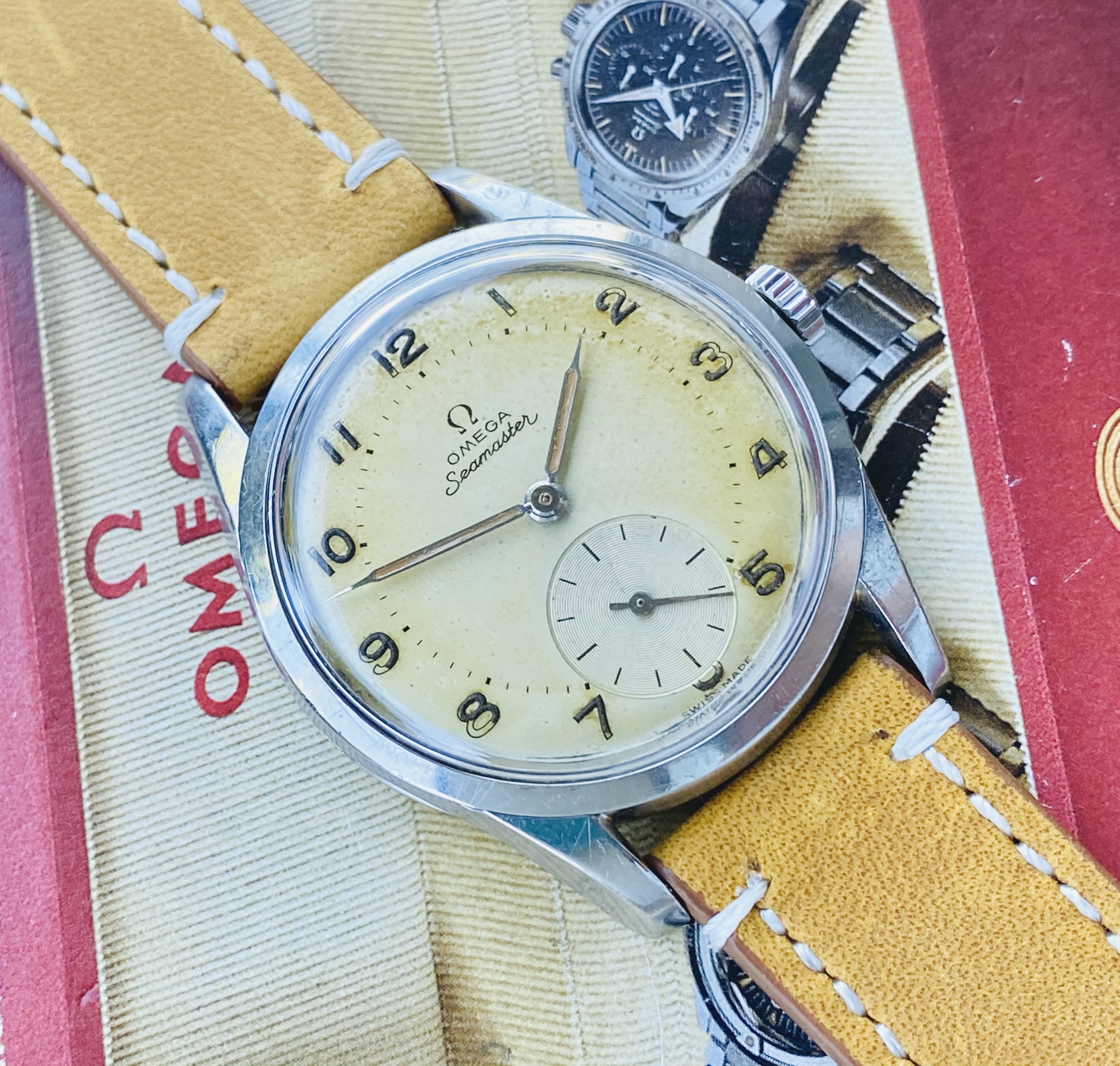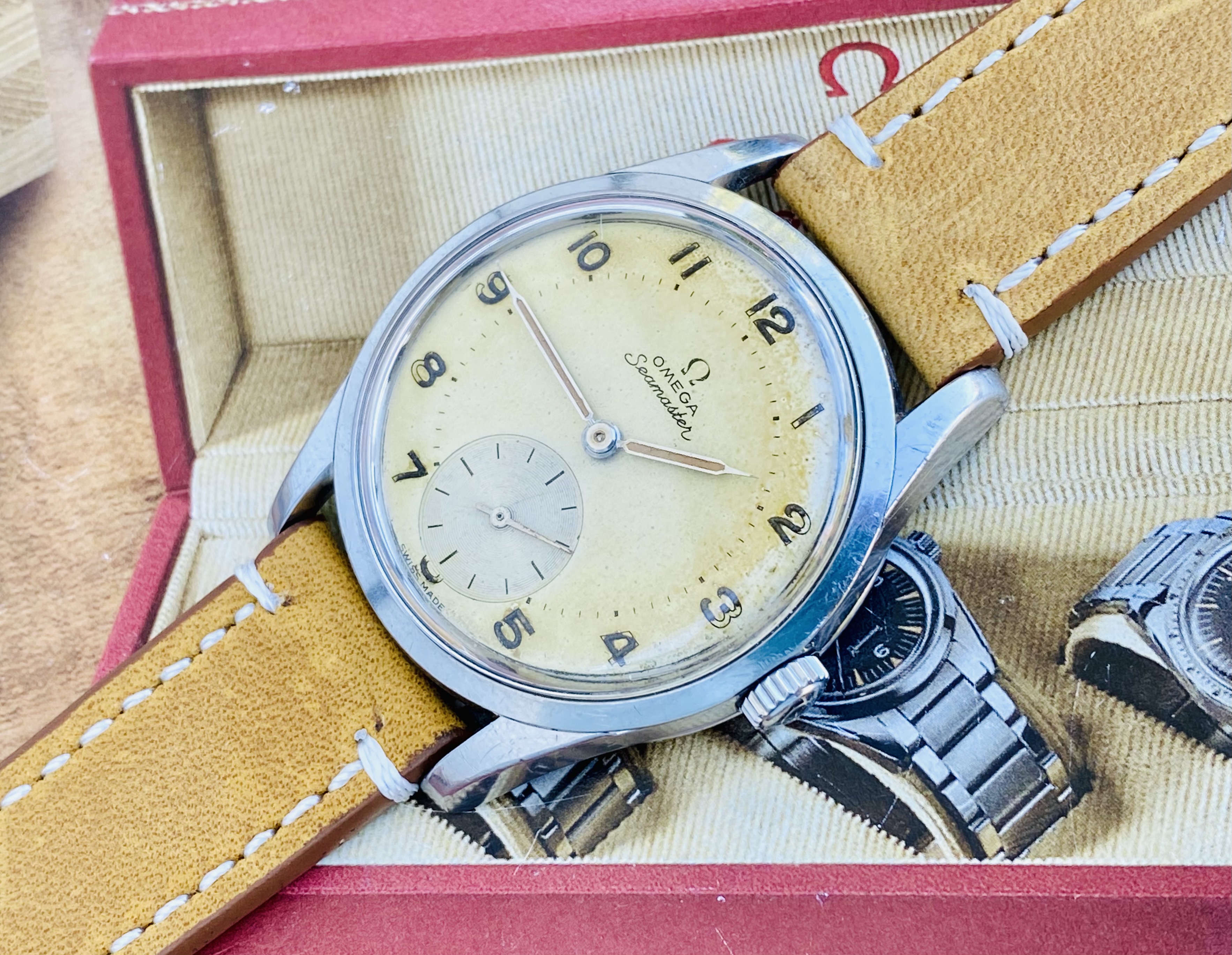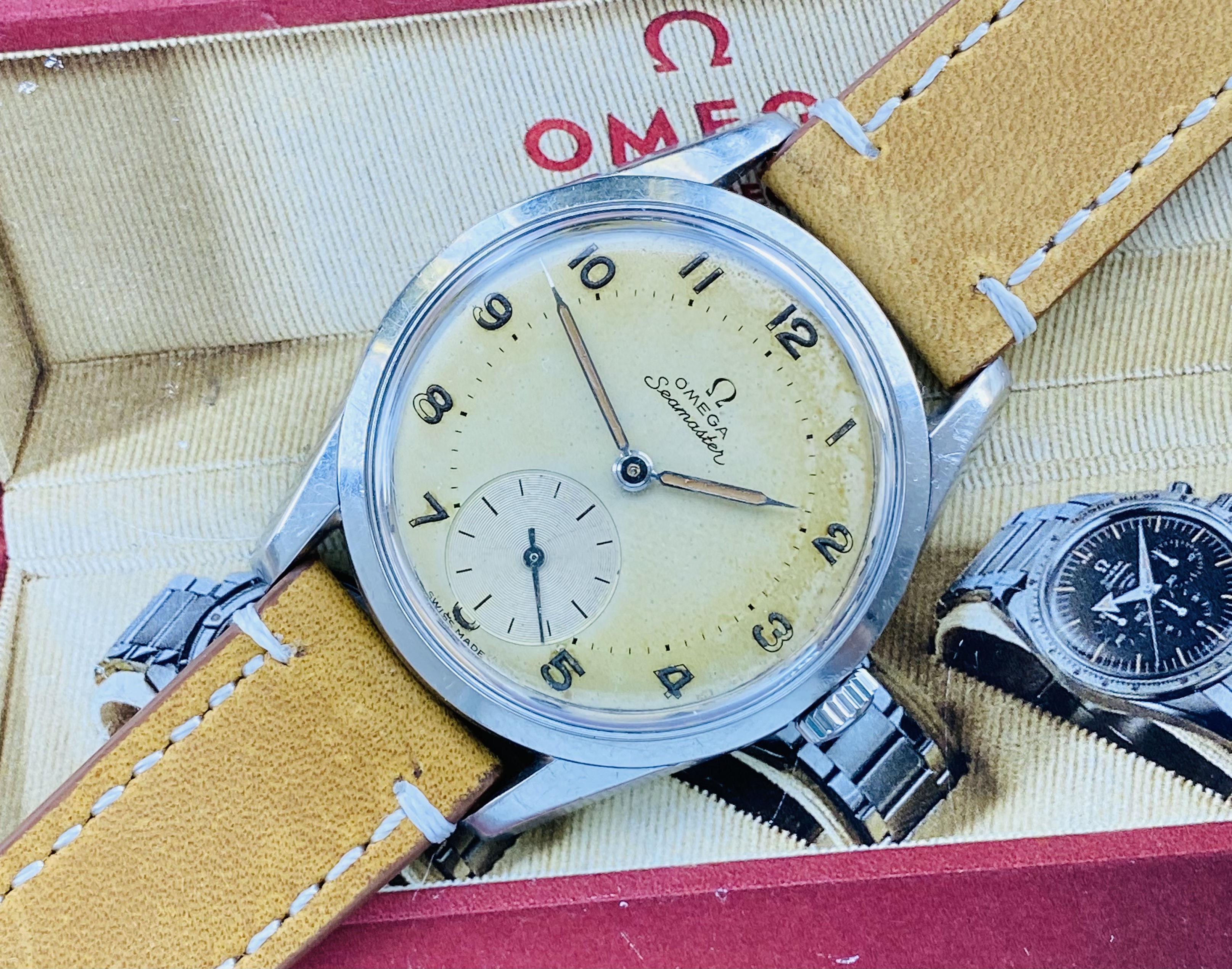 DIAL: with original patinaited dial with applied indexes, Omega logo and baton hands.