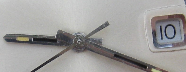 No lume dot at 11. Faceted hour indices are black on the inner edge, and polished