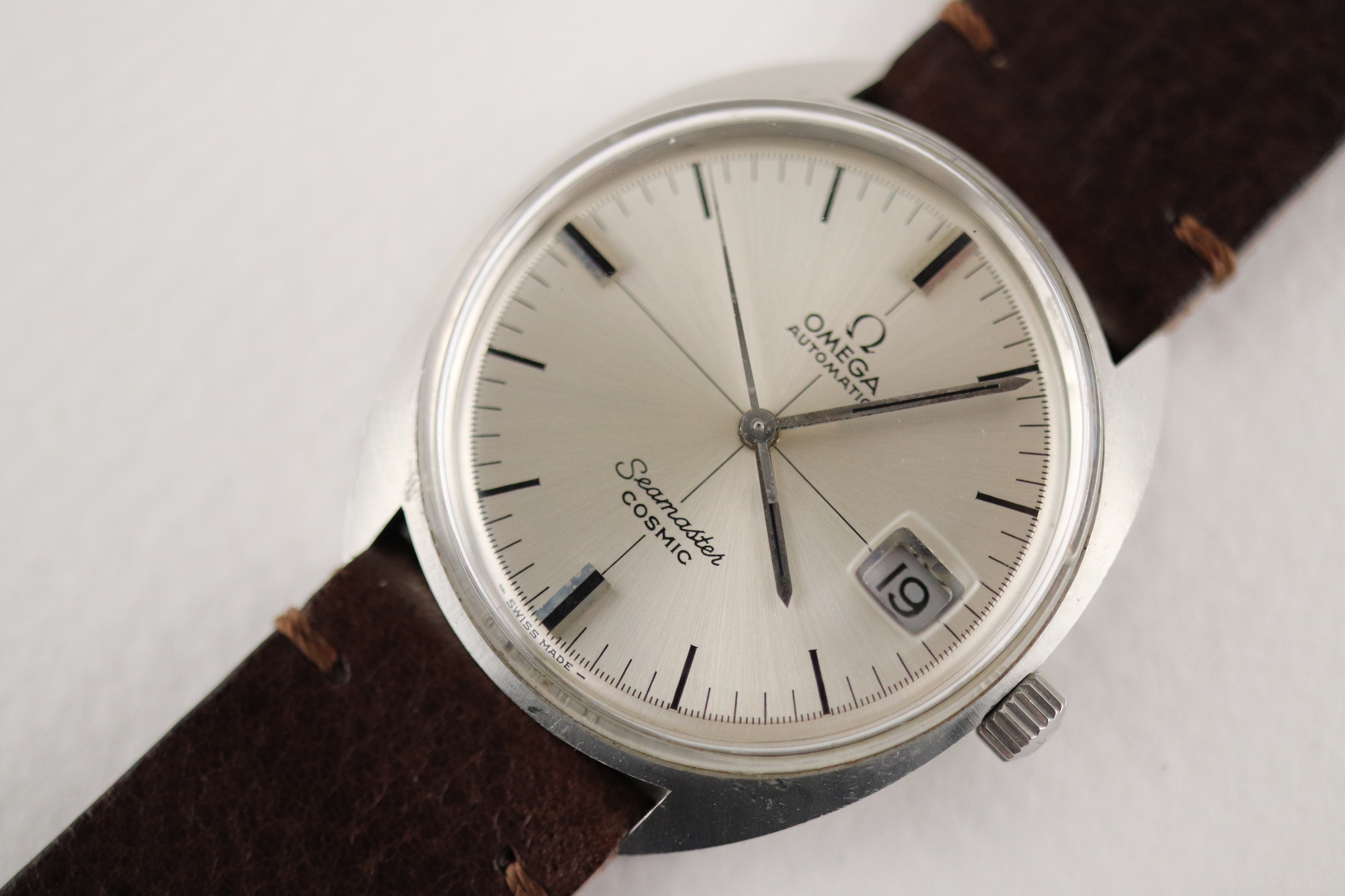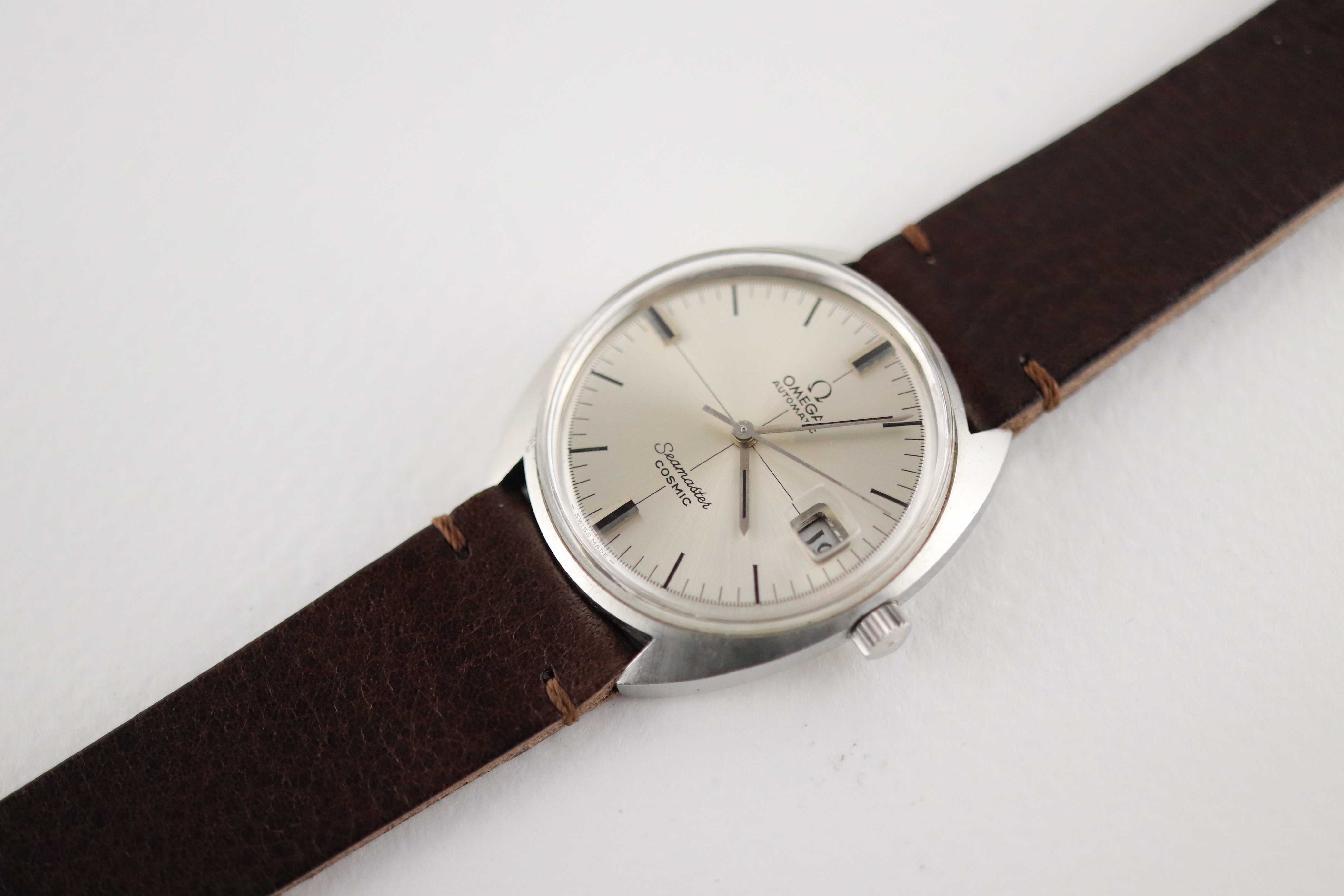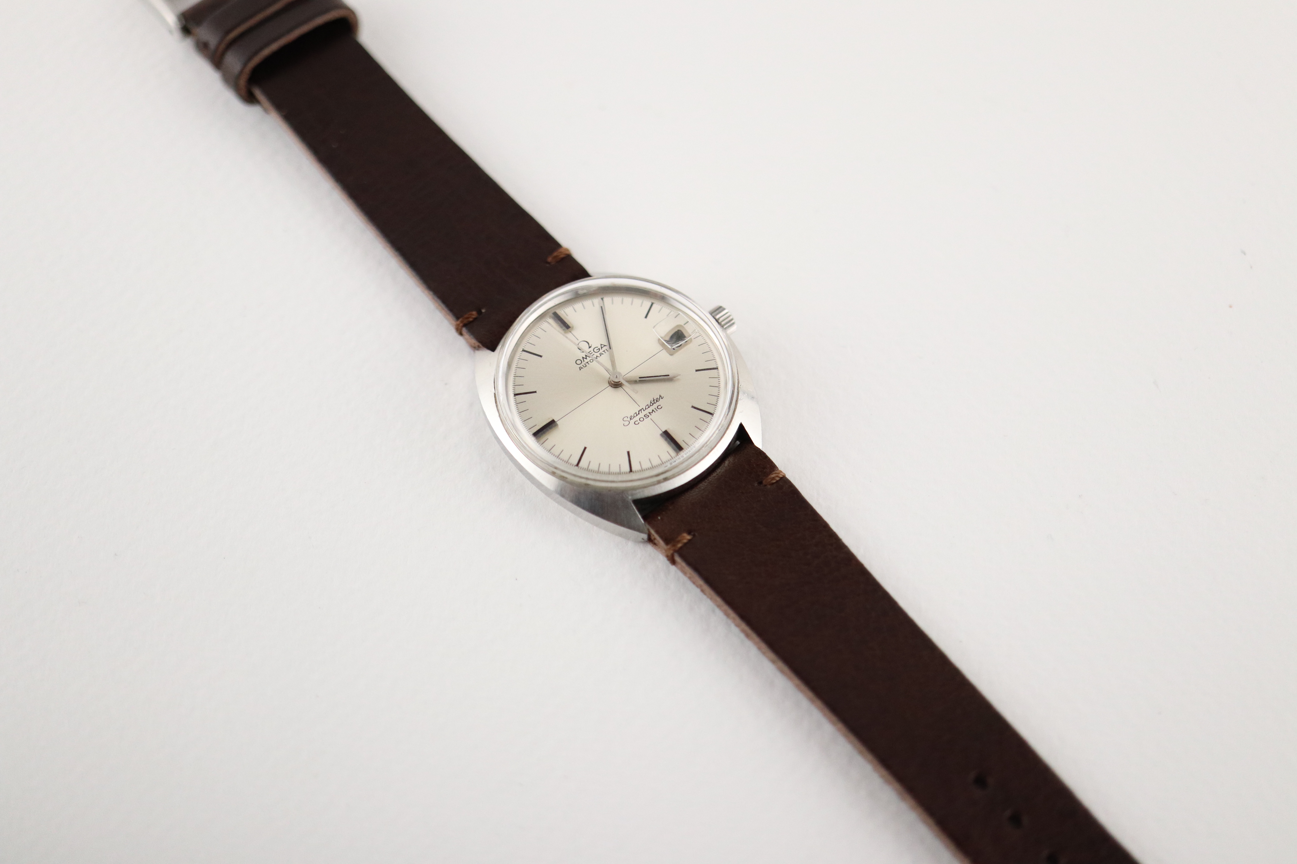 ·For sale, I have an Omega Seamaster Cosmic reference # 166.026. It has the Caliber 565 which is an automatic movement. The case has some dings and scratches and appears to have been polished in the past. Watch has just been serviced and comes with a 2-year warranty. The watch will come with your choice of either a new Brown or Black leather strap. You can also have a bracelet for an additional fee if you like. If you need more pictures let me know.