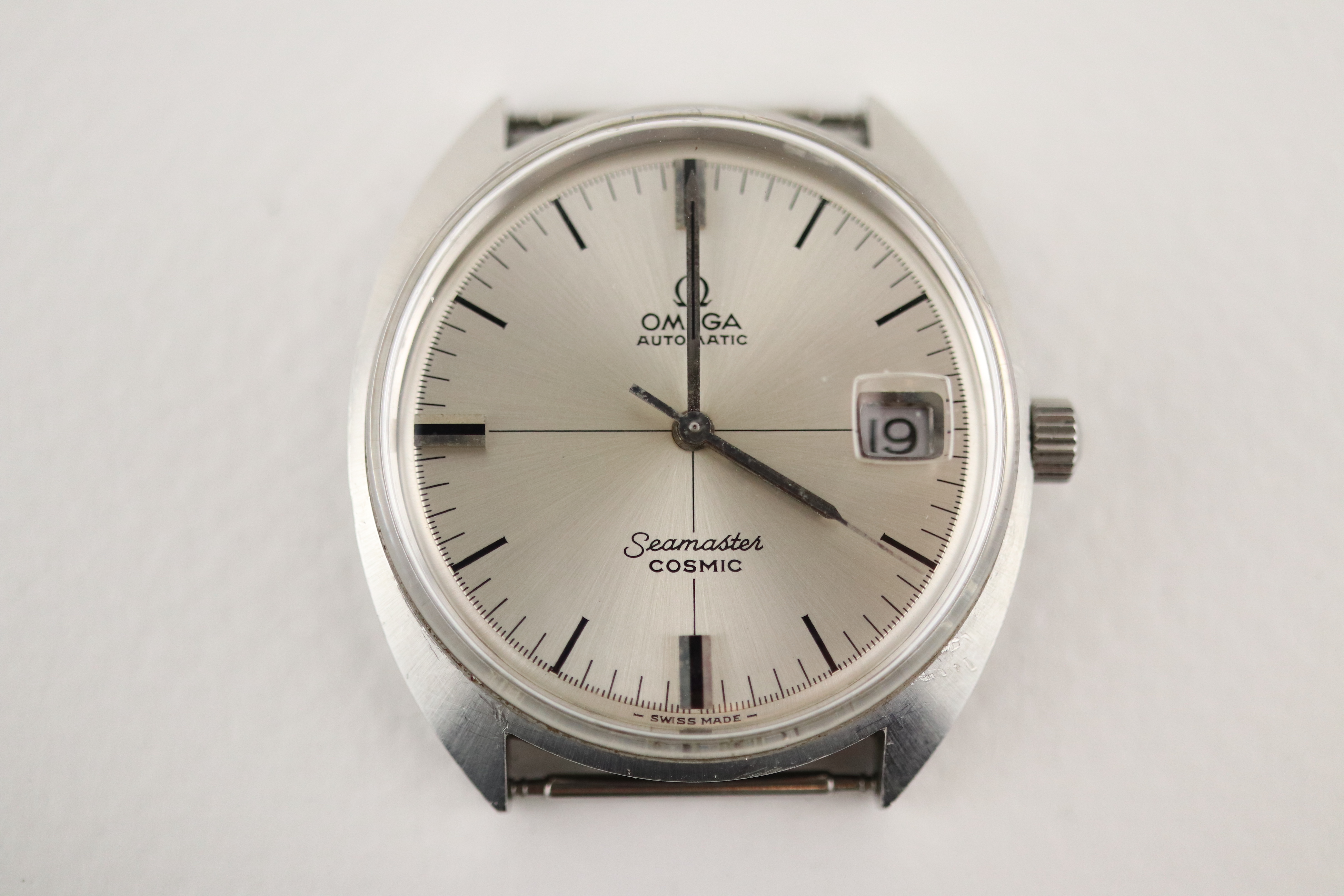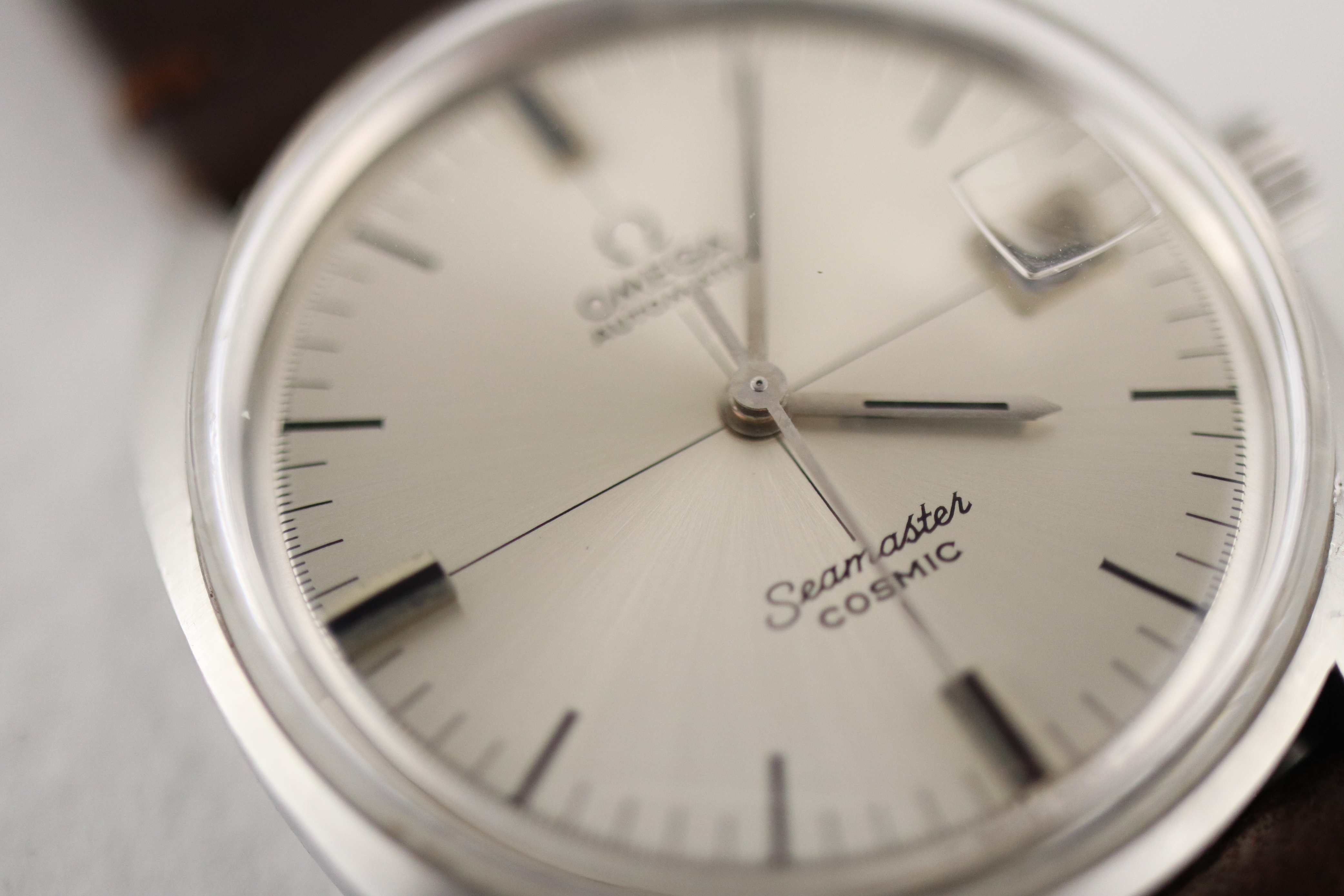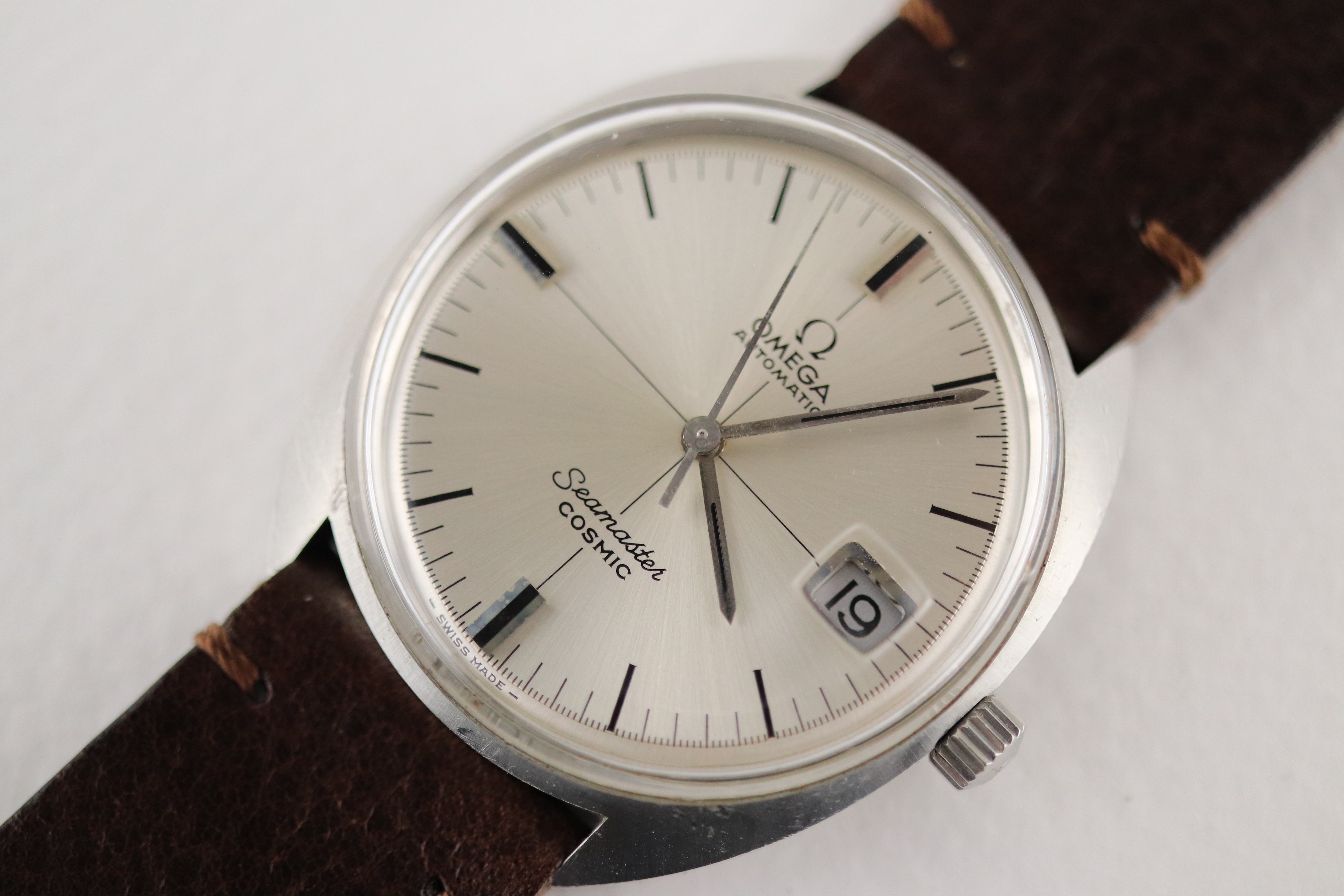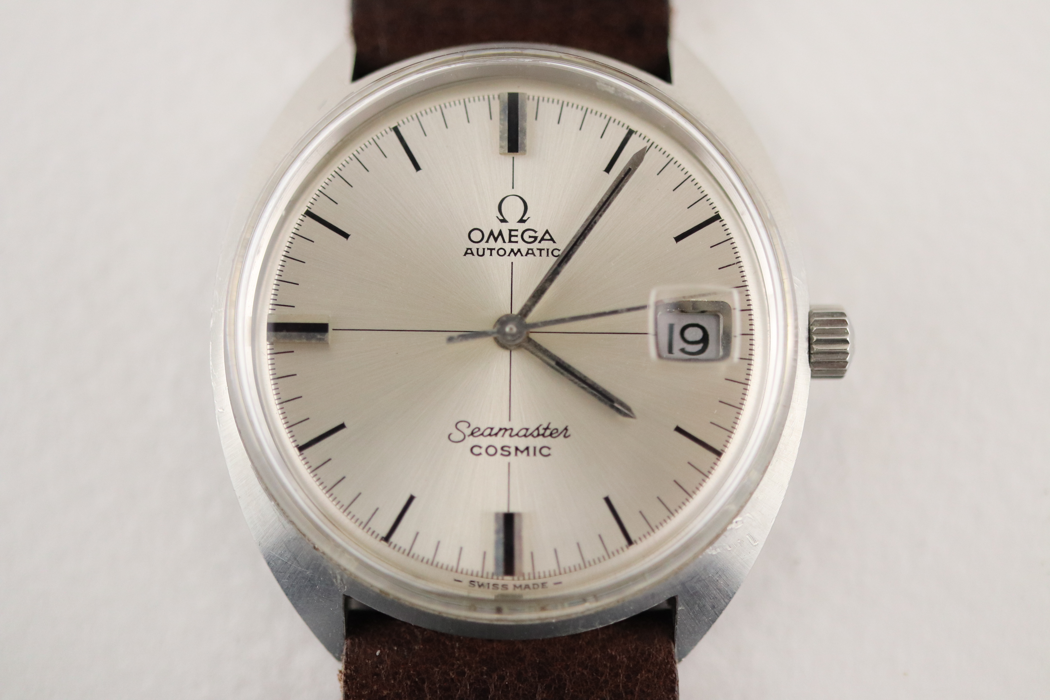 ·For sale, I have an Omega Seamaster Cosmic reference # 166.026. It has the Caliber 565 which is an automatic movement. The case has some dings and scratches and appears to have been polished in the past. Watch has just been serviced and comes with a 2-year warranty. The watch will come with your choice of either a new Brown or Black leather strap. You can also have a bracelet for an additional fee if you like. If you need more pictures let me know.